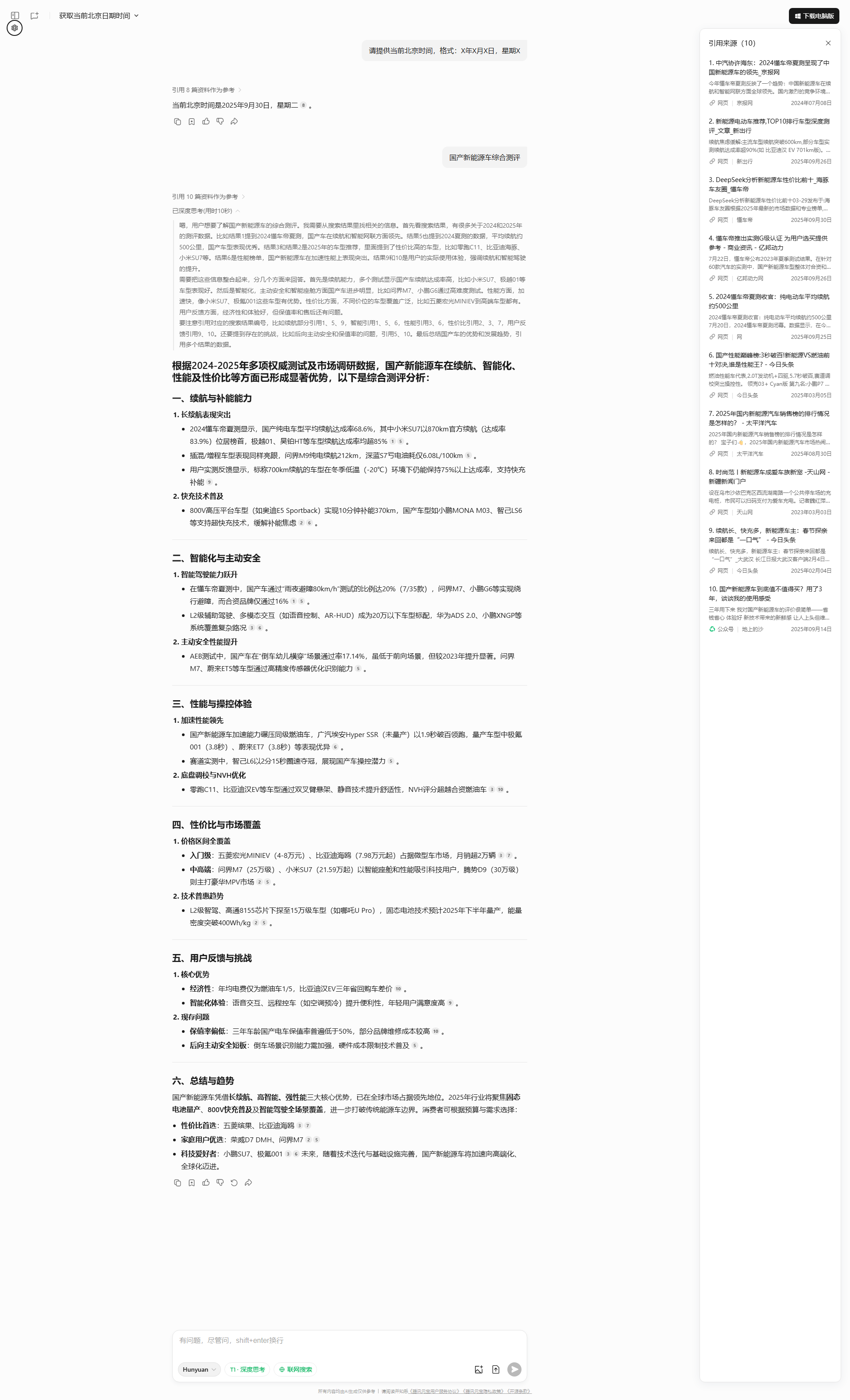 **规模最大的国产新能源车企**以比亚迪为首,凭借技术、销量和全球化布局形成绝对优势;吉利、长安、奇瑞、上汽等紧随其后,通过多品牌战略、出口扩张和技术创新占据市场前列。未来竞争将聚焦智能化、高端化及全球化能力,头部企业集中度或进一步提升[1,3,4](@ref)。