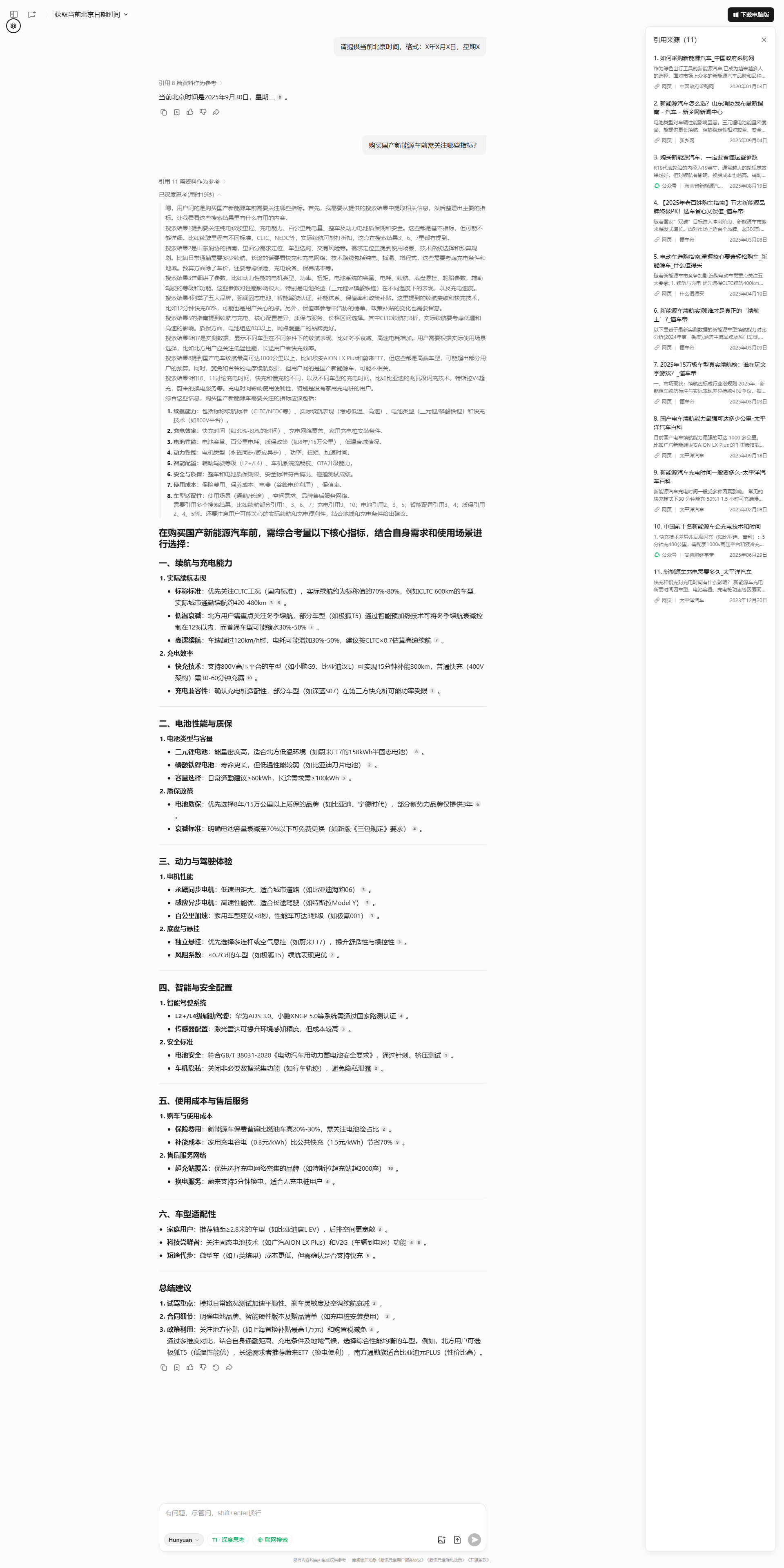 然后是车型参数,续航、电池技术、充电效率这些,[1]提到电池类型的选择,三元锂和磷酸铁锂的区别,以及快充的影响。[2]和[5]建议续航至少400km,北方用户选600km以上带热泵的。充电设施方面,家用充电桩和公共充电网络的覆盖情况,[4]和[5]都有涉及。