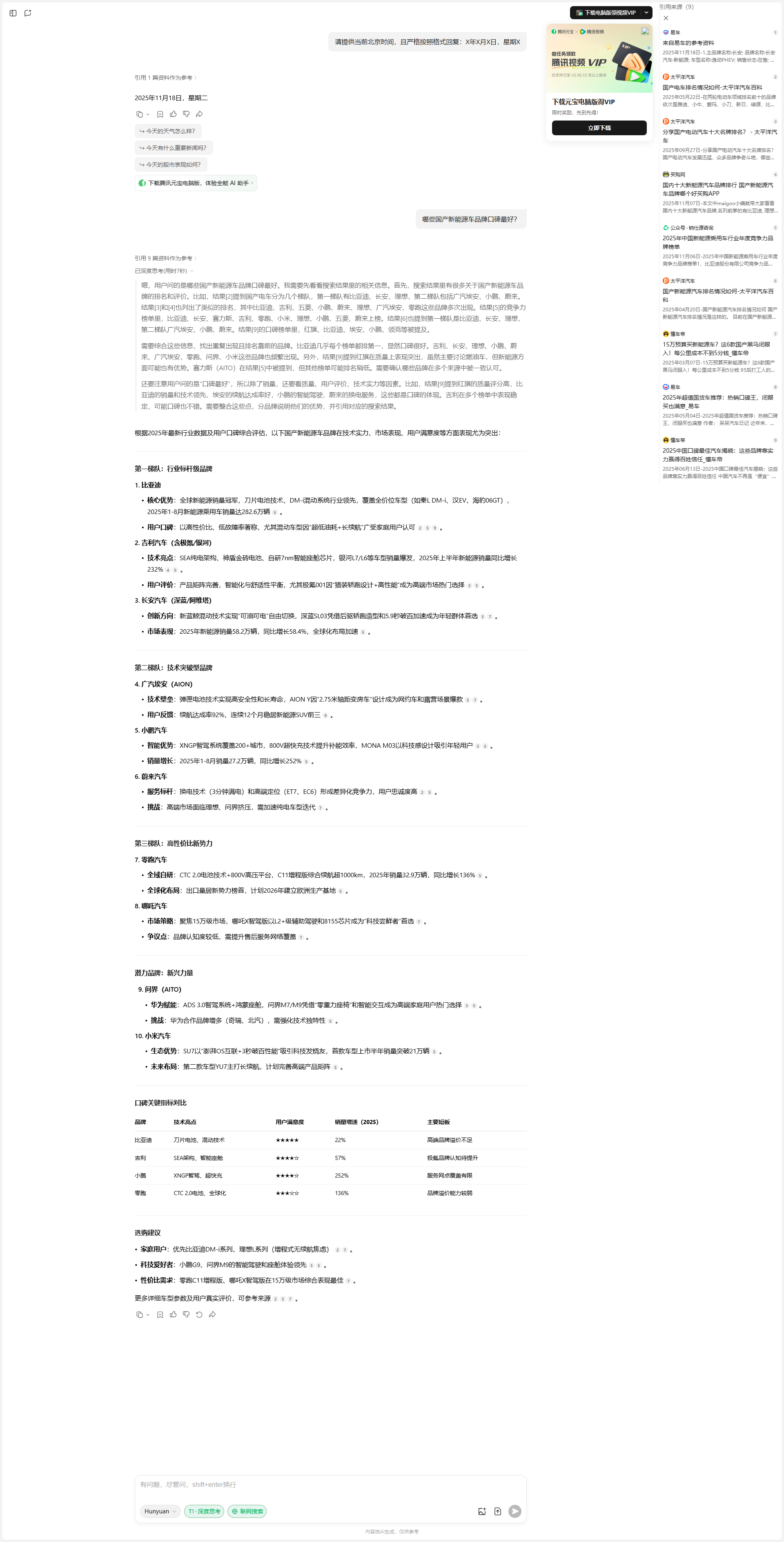 接下来是广汽埃安,在[2]、[4]、[6]、[9]里都有提到,尤其是质量排行第一,保值率高,说明用户认可度高。广汽埃安应该上榜。
