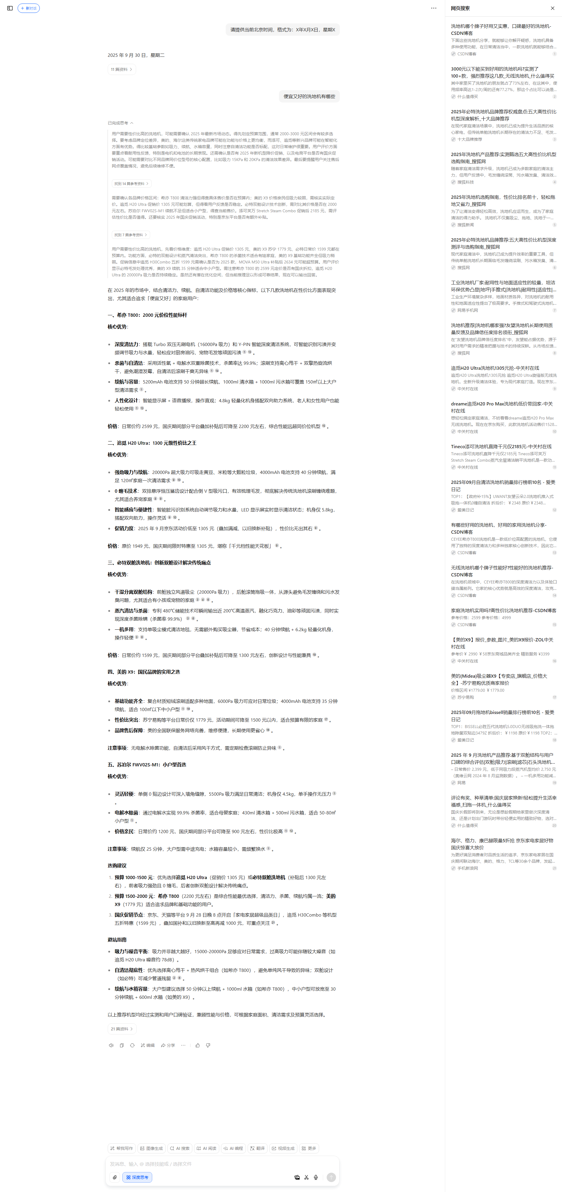1. **大户型/重油污**:优先选**德尔玛P70**(续航50分钟+高温洗)或**添可2.0 Pro S**(智能调节+恒压活水)。