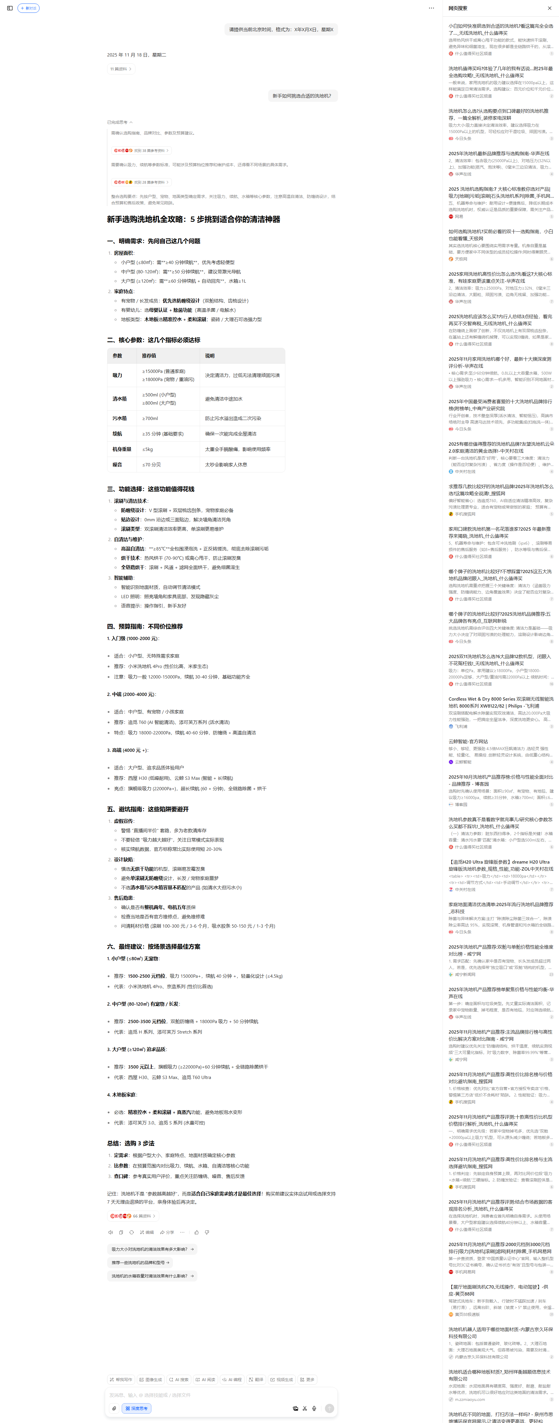 需确认选购指南、品牌对比、参数及预算建议。需要确认吸力、续航等参数标准,可能涉及预算档位推荐和维护成本,还得看不同场景的具体需求。整合选购要点:先按户型、宠物、地面类型确定需求,关注吸力、续航、水箱等核心参数,注意高温自清洁、防缠绕设计,结合预算和售后政策,避免常见陷阱。