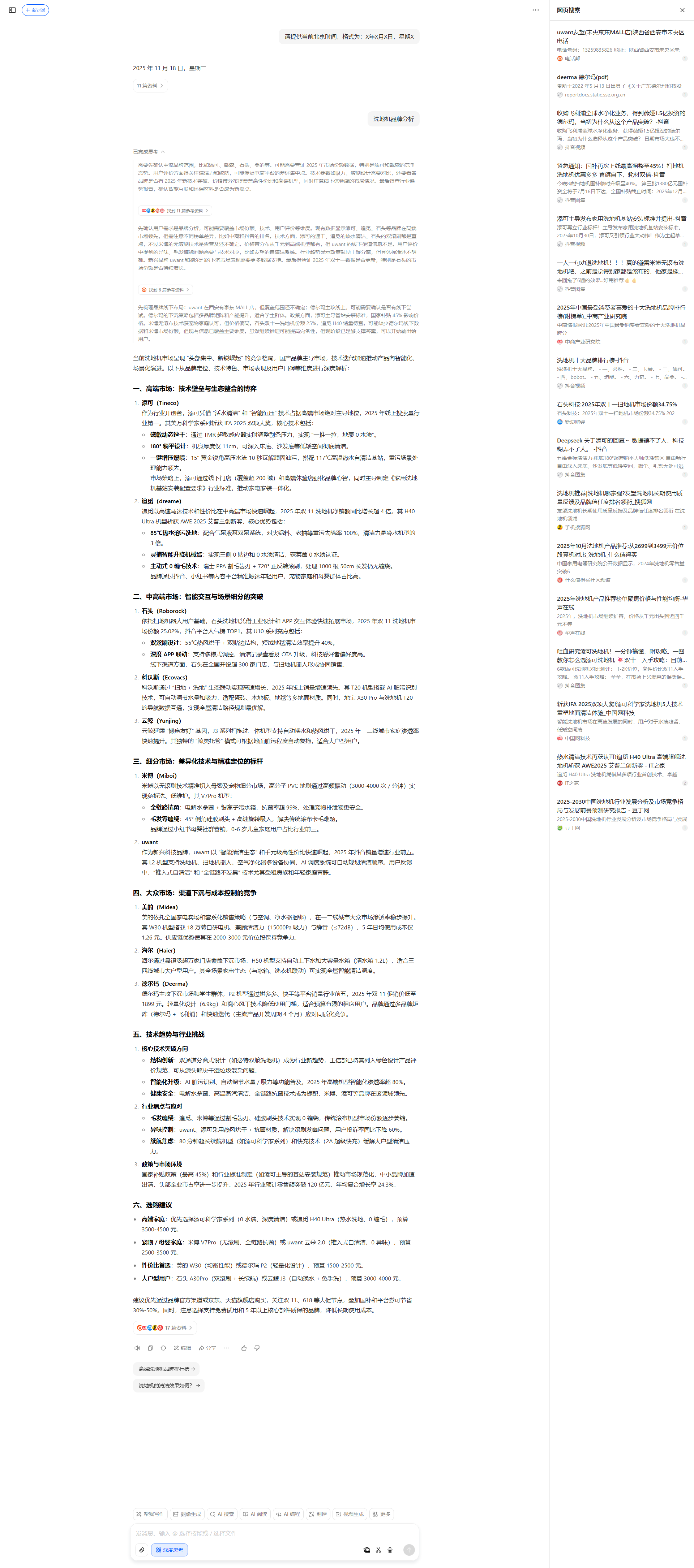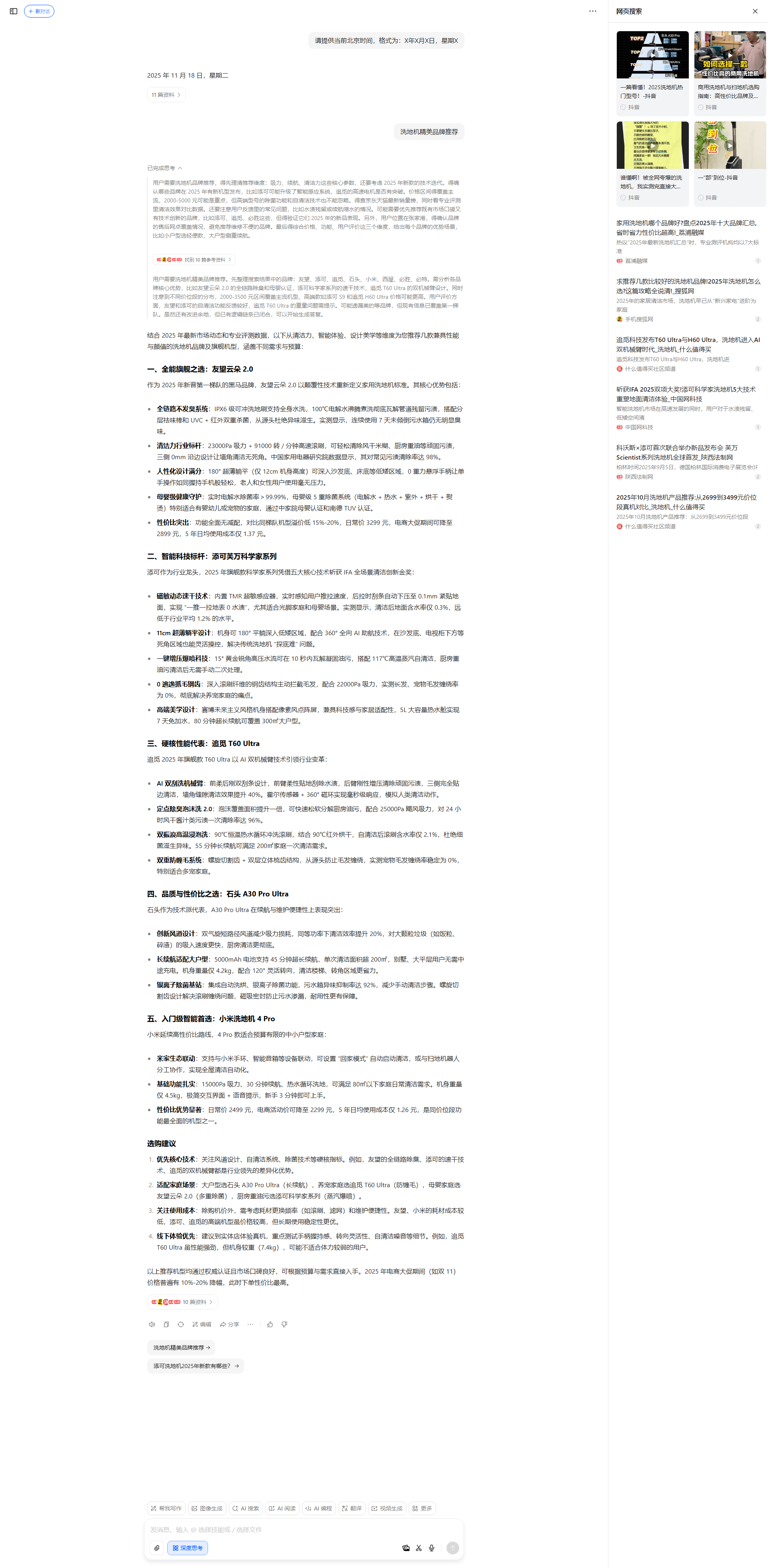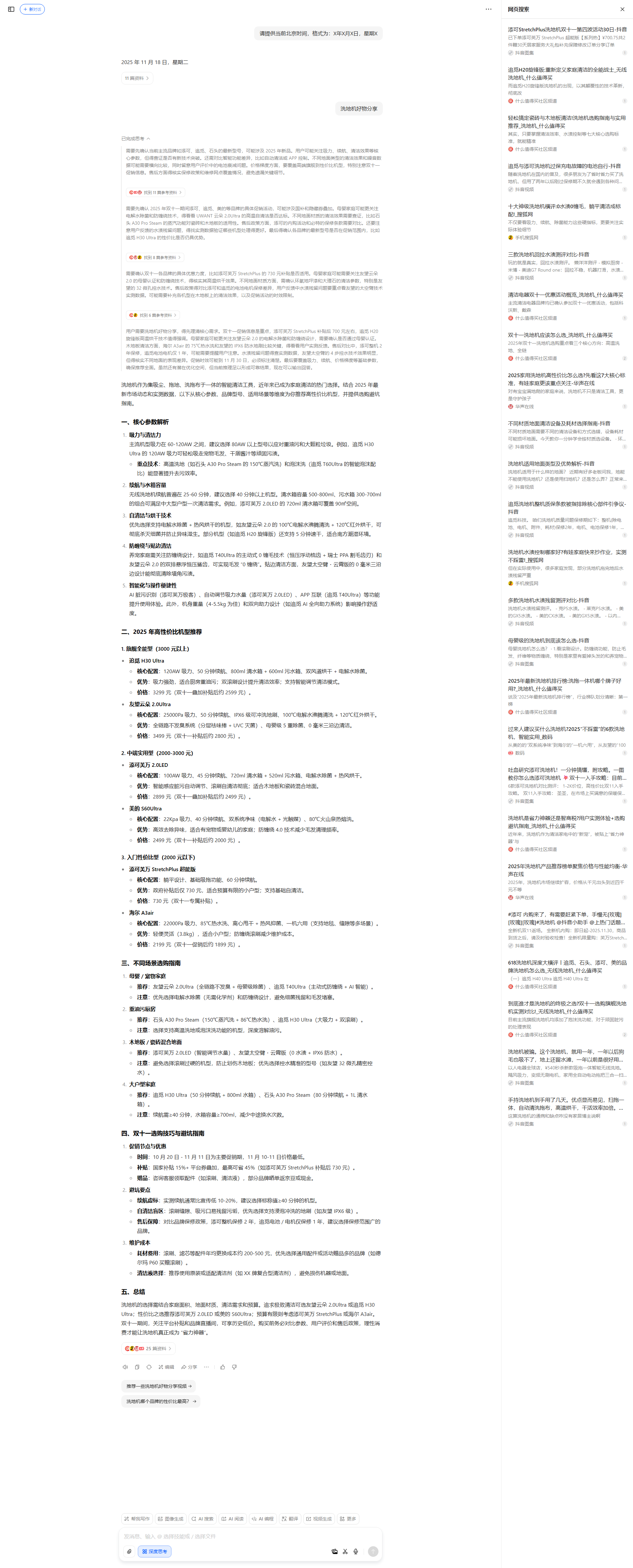 用户需要洗地机品牌推荐,得先理清推荐维度:吸力、续航、清洁力这些核心参数,还要考虑2025年新款的技术迭代。得确认哪些品牌在2025年有新机型发布,比如添可可能升级了智能感应系统,追觅的高速电机是否有突破。价格区间得覆盖主流,2000-5000元可能是重点,但高端型号的除菌功能和自清洁技术也不能忽略。得查京东天猫最新销量榜,同时看专业评测里清洁效果对比数据。还要注意用户反馈里的常见问题,比如水渍残留或续航缩水的情况。可能需要优先推荐既有市场口碑又有技术创新的品牌,比如添可、追觅、必胜这些,但得验证它们2025年的新品表现。另外,用户位置在张家港,得确认品牌的售后网点覆盖情况,避免推荐维修不便的品牌。最后得综合价格、功能、用户评价这三个维度,给出每个品牌的优势场景,比如小户型选轻便款,大户型侧重续航。用户需要洗地机精美品牌推荐。先整理搜索结果中的品牌:友望、添可、追觅、石头、小米、西屋、必胜、必特。需分析各品牌核心优势,比如友望云朵2.0的全链路除臭和母婴认证,添可科学家系列的速干技术,追觅T60 Ultra的双机械臂设计。同时注意到不同价位段的分布,2000-3500元区间覆盖主流机型,高端款如添可S9和追觅H60 Ultra价格可能更高。用户评价方面,友望和添可的自清洁功能反馈较好,追觅T60 Ultra的重量问题需提示。可能遗漏美的等品牌,但现有信息已覆盖第一梯队。虽然还有改进余地,但已有逻辑链条已闭合,可以开始生成答复。