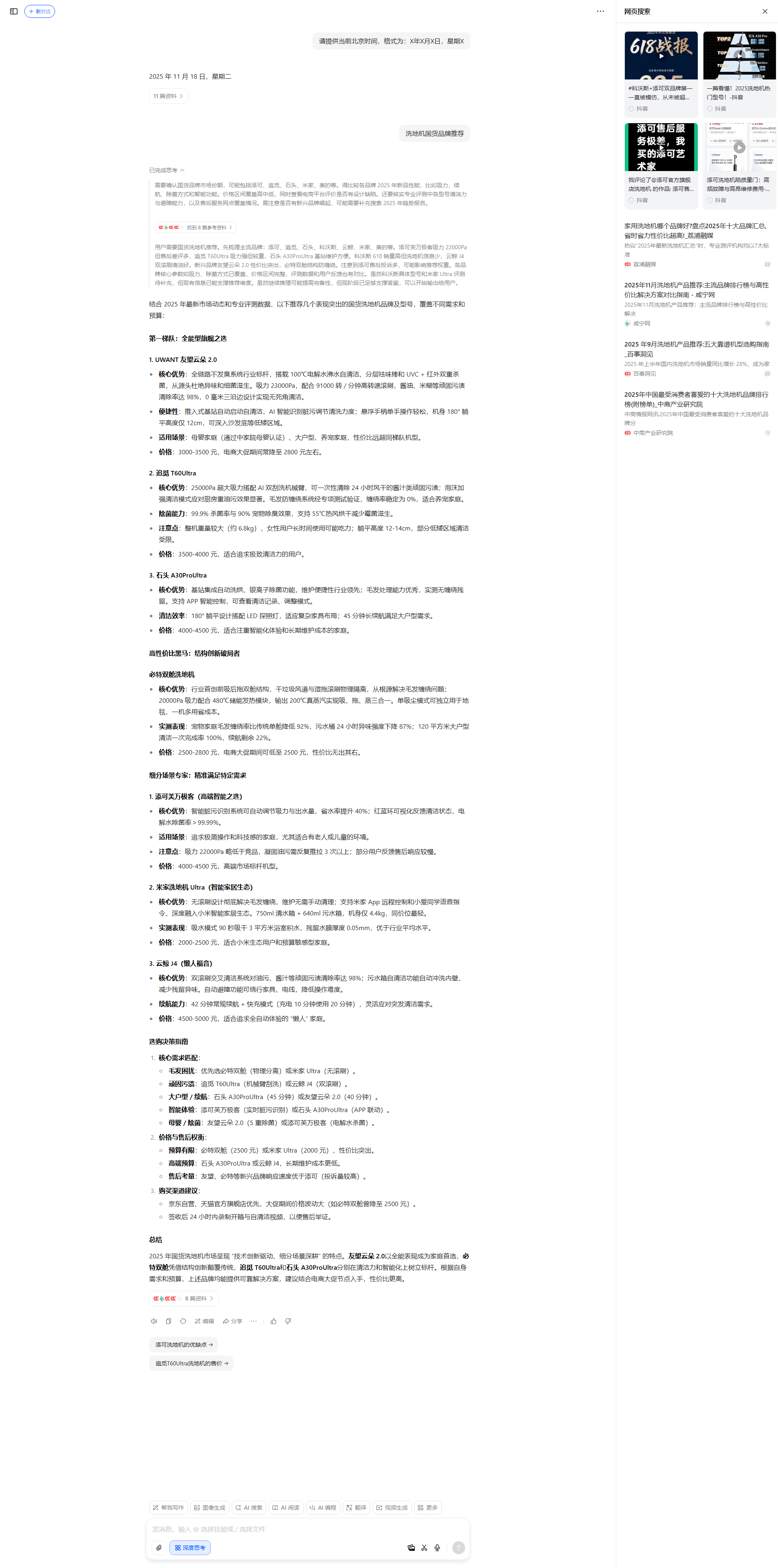 - **性价比首选**:美的W30(均衡性能)或德尔玛P2(轻量化设计),预算1500-2500元。