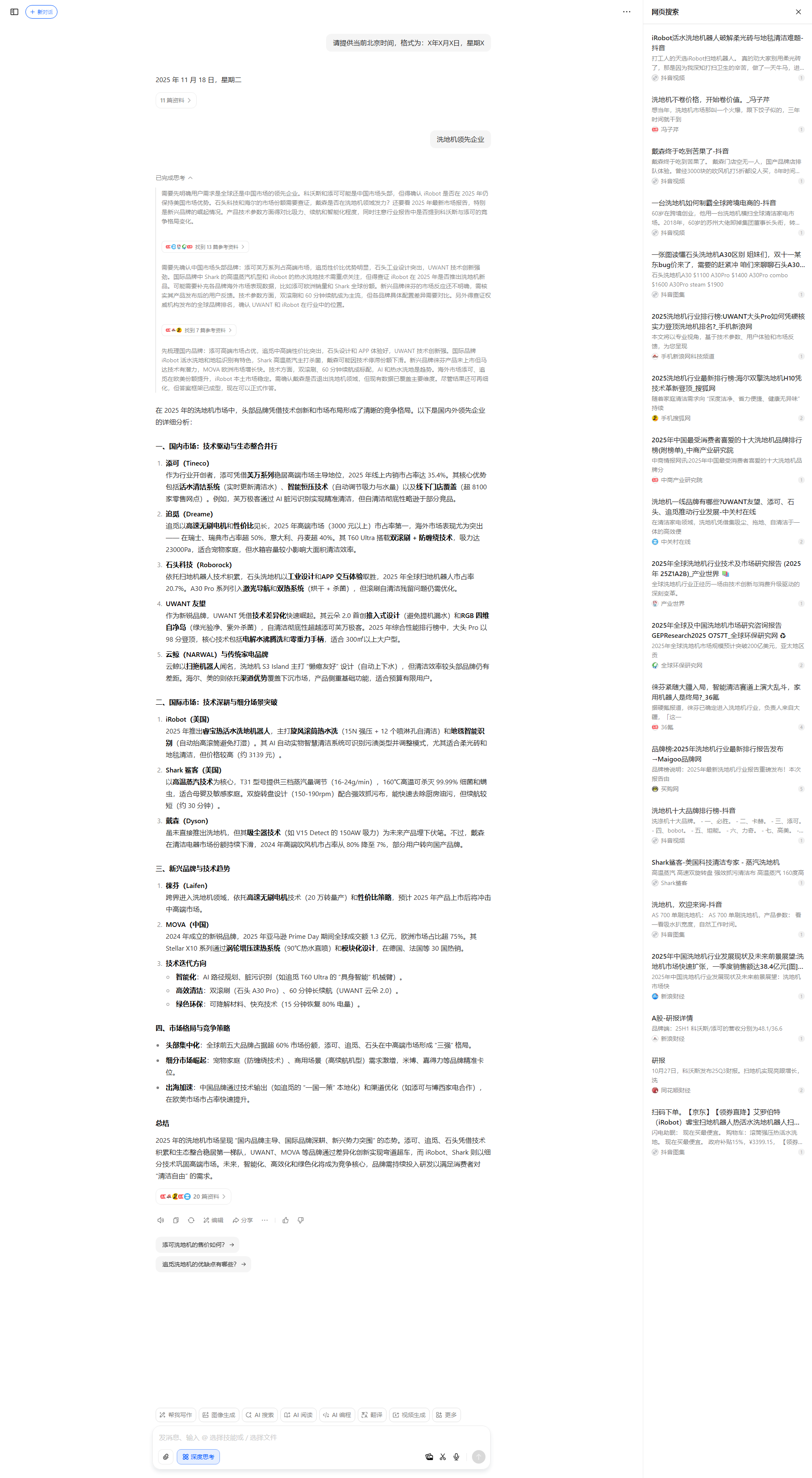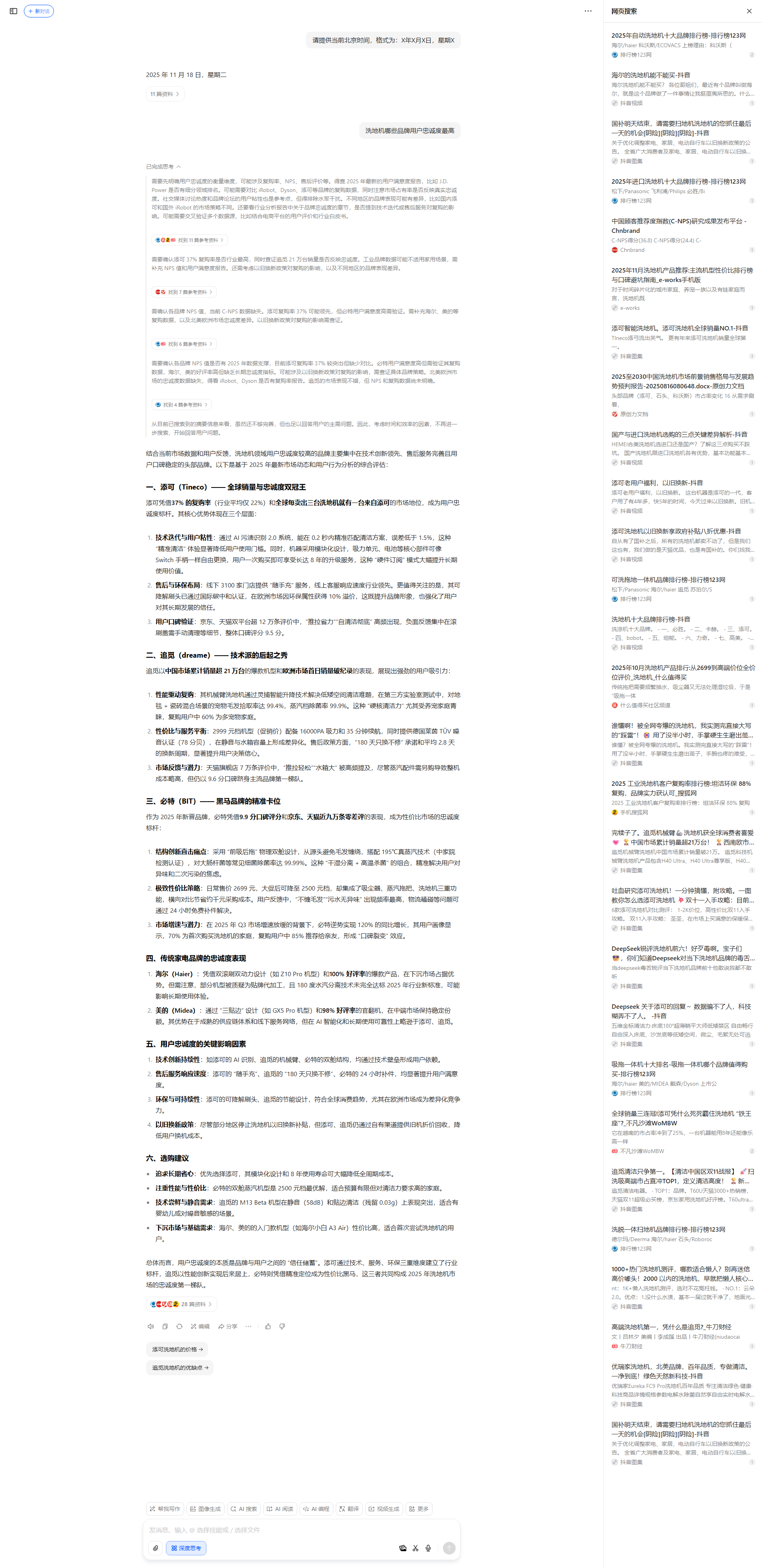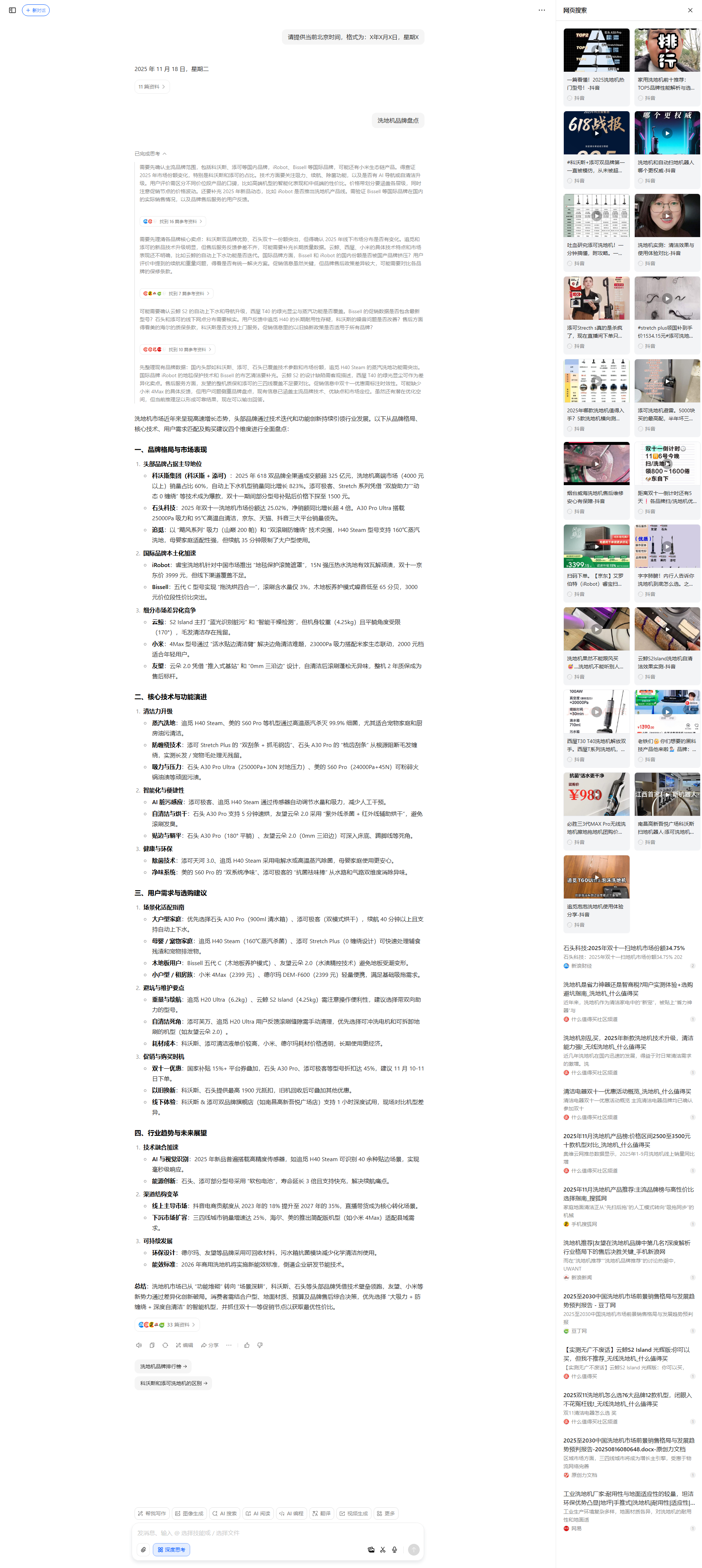 - **石头科技**:2025年双十一洗地机市场份额达25.02%,净销额同比增长超4倍。A30 Pro Ultra搭载25000Pa吸力和95℃高温自清洁,京东、天猫、抖音三大平台销量领先。