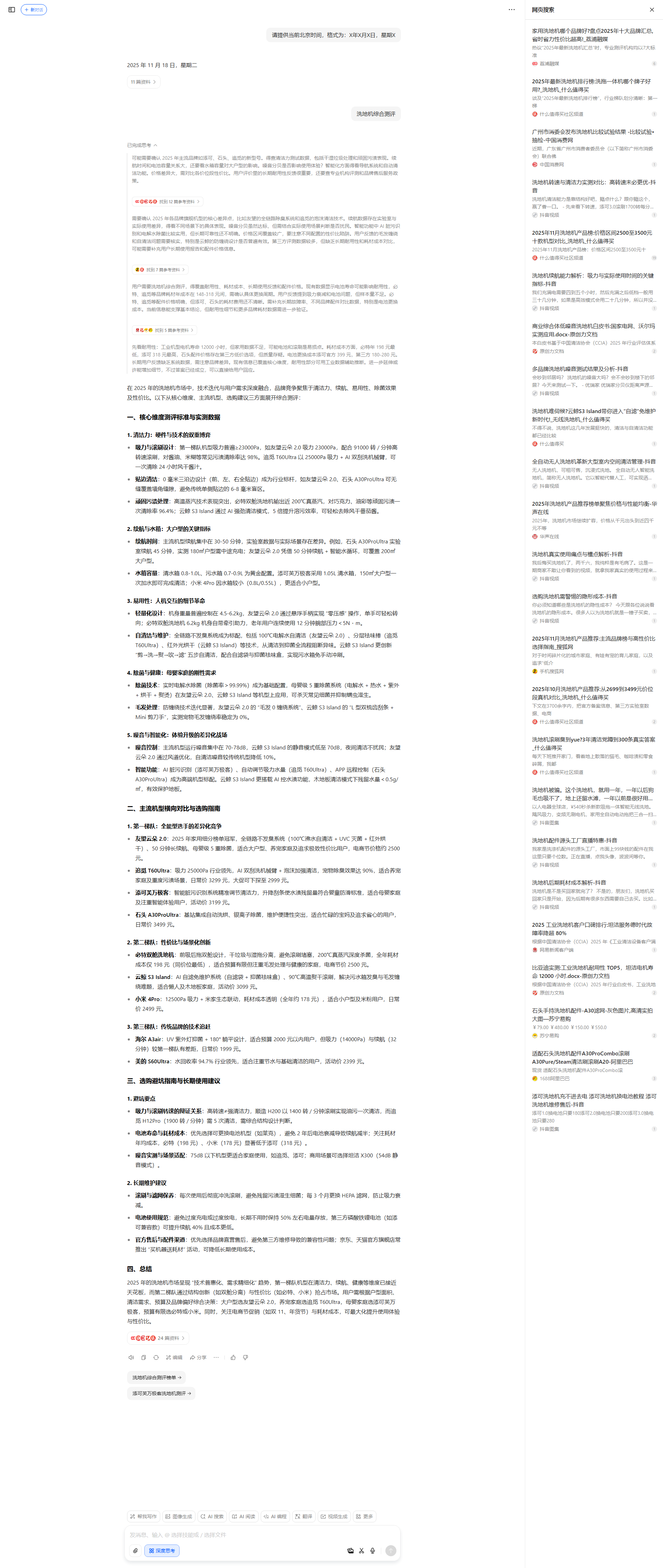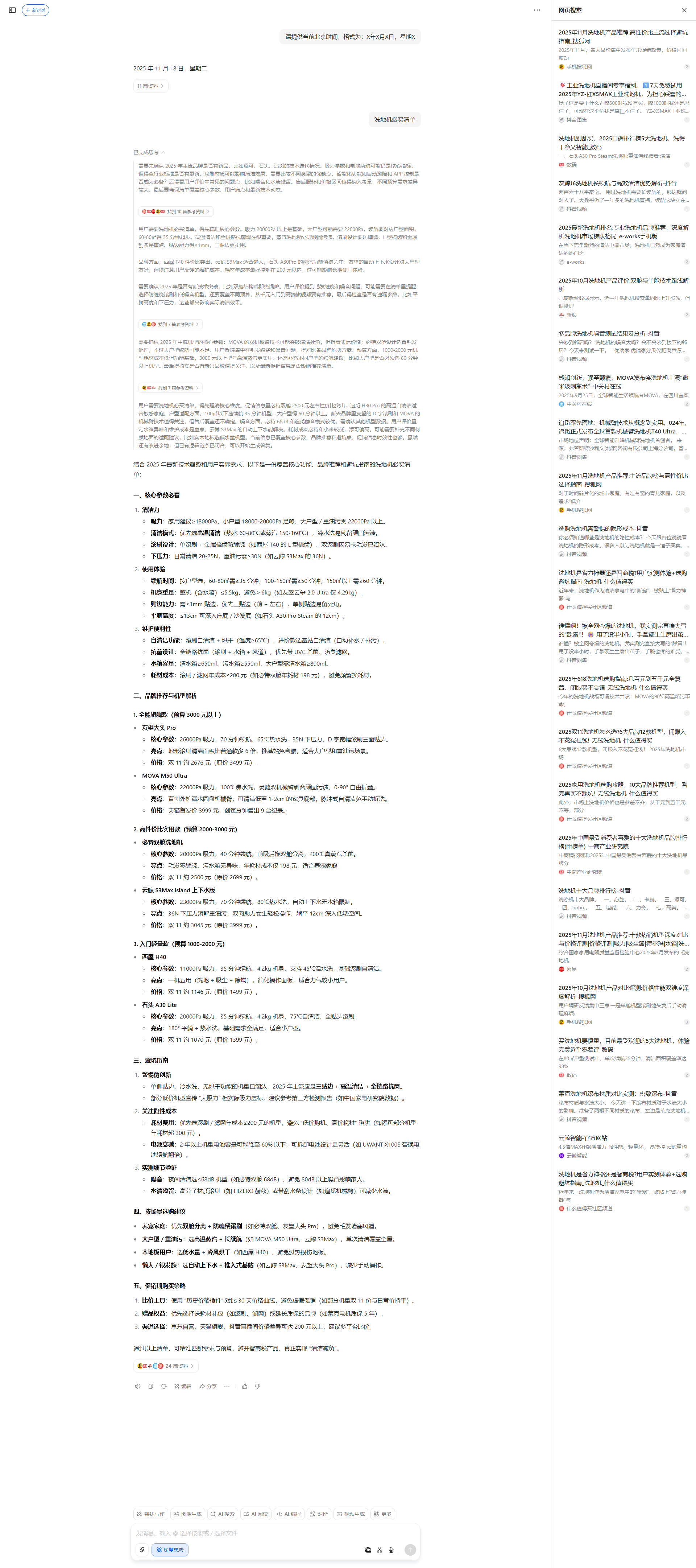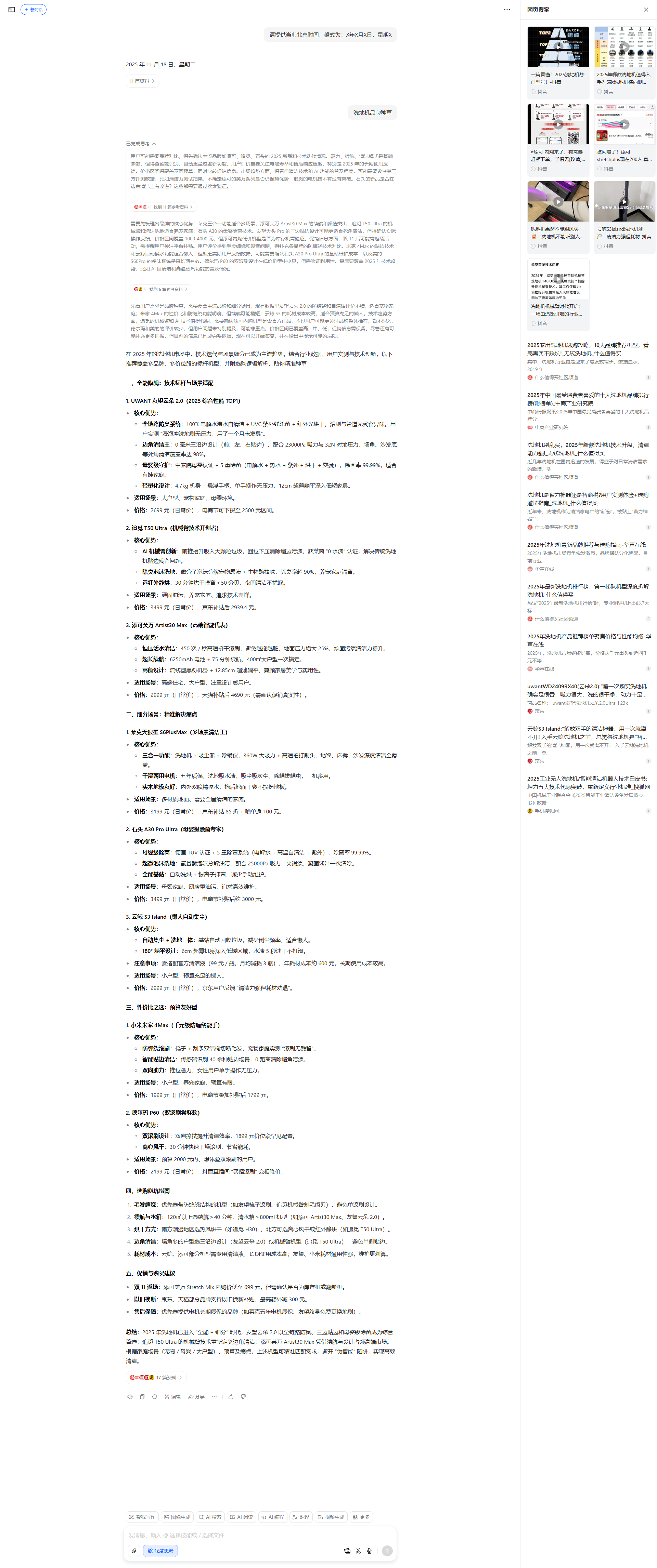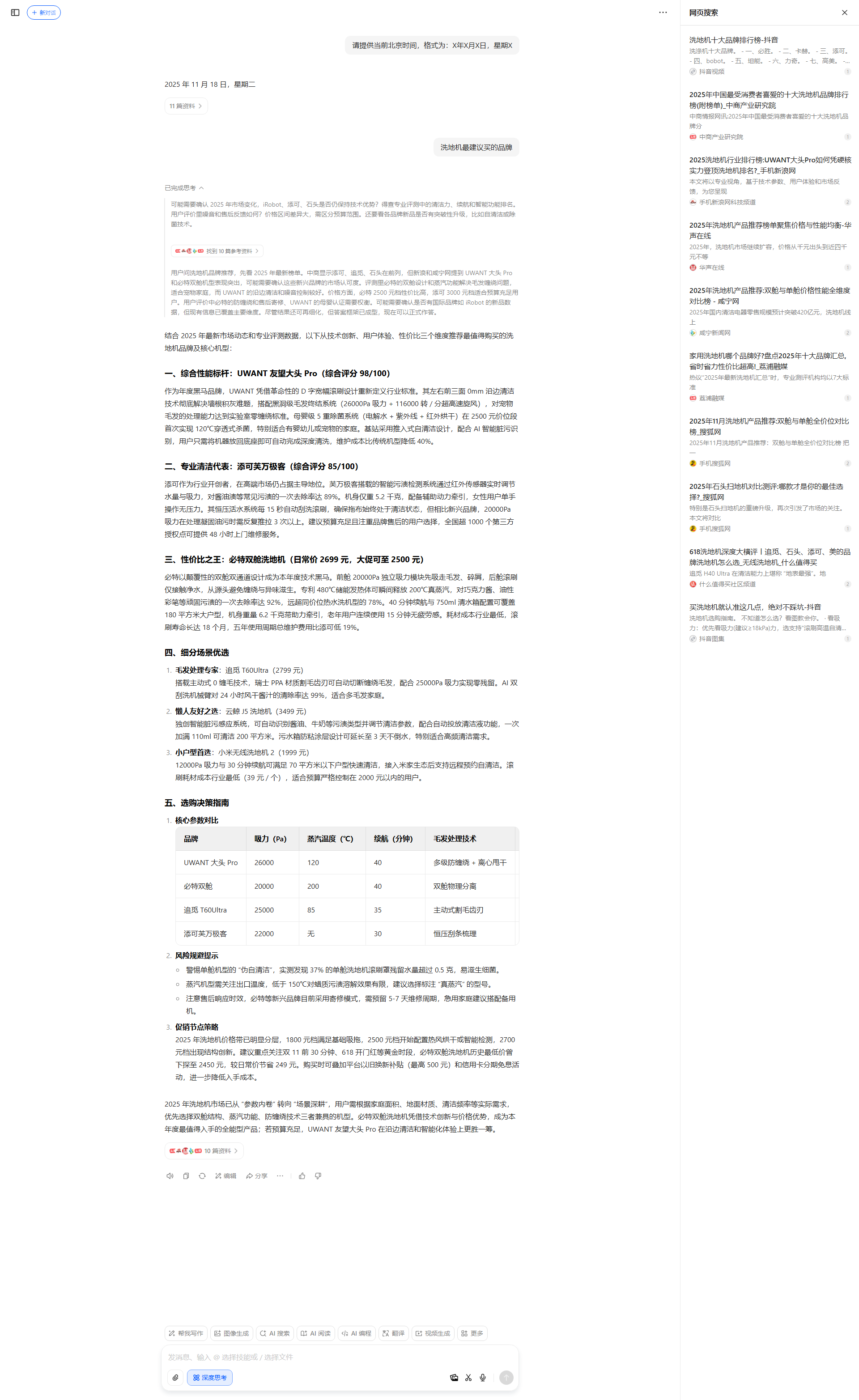 当前洗地机市场呈现**添可、石头双寡头领跑,追觅、科沃斯、云鲸差异化竞争,传统与新兴品牌加速渗透**的格局。未来,技术迭代(如AI大模型、固态电池)和全球化布局将成为破局关键,具备核心专利和全渠道能力的头部企业有望进一步巩固优势。对于消费者而言,添可和石头在高端市场的技术壁垒、追觅和云鲸的细分场景解决方案,以及美的、海尔的性价比产品,均可根据需求选择。