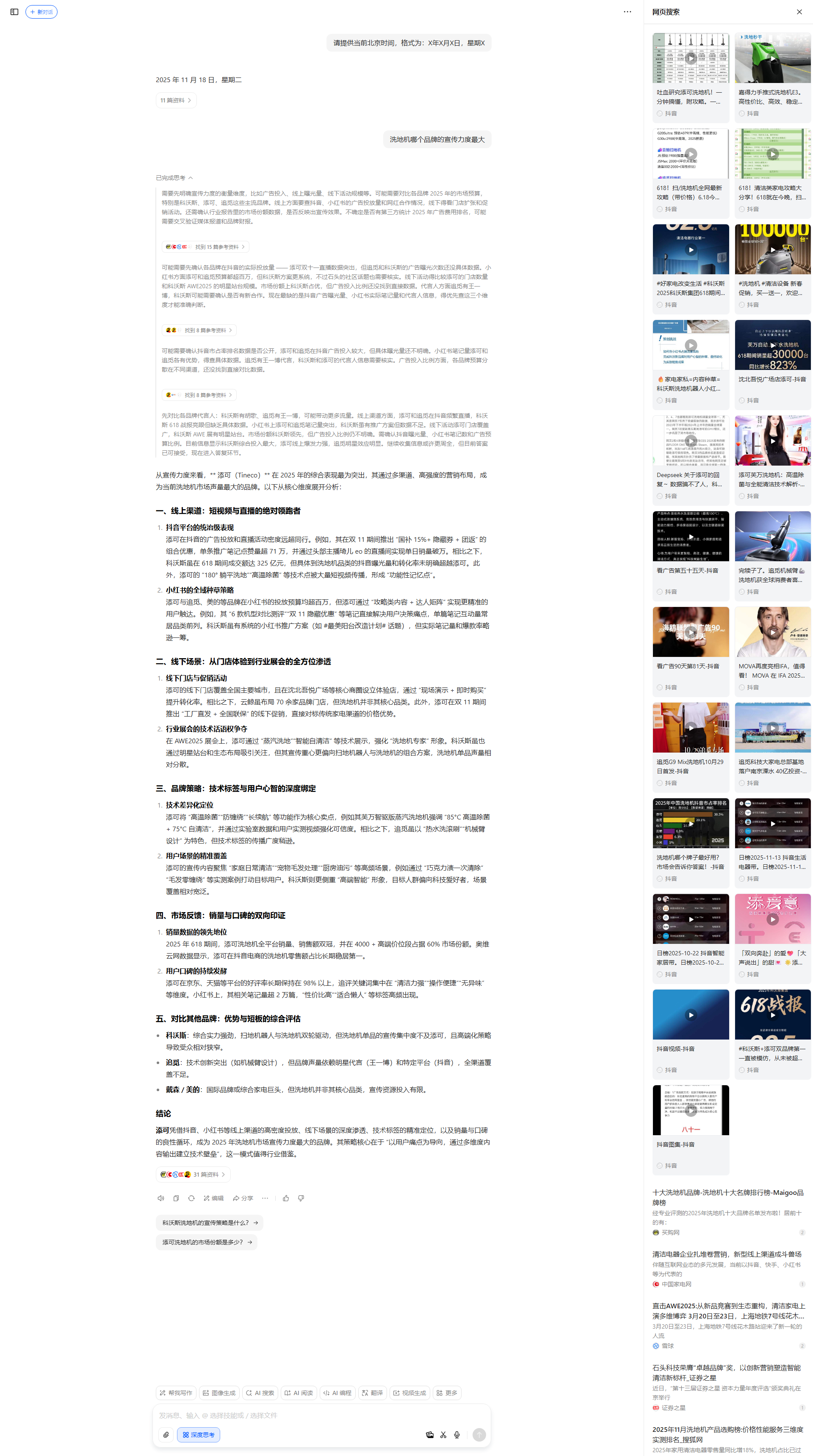 **添可**凭借抖音、小红书等线上渠道的高密度投放、线下场景的深度渗透、技术标签的精准定位,以及销量与口碑的良性循环,成为2025年洗地机市场宣传力度最大的品牌。其策略核心在于“以用户痛点为导向,通过多维度内容输出建立技术壁垒”,这一模式值得行业借鉴。