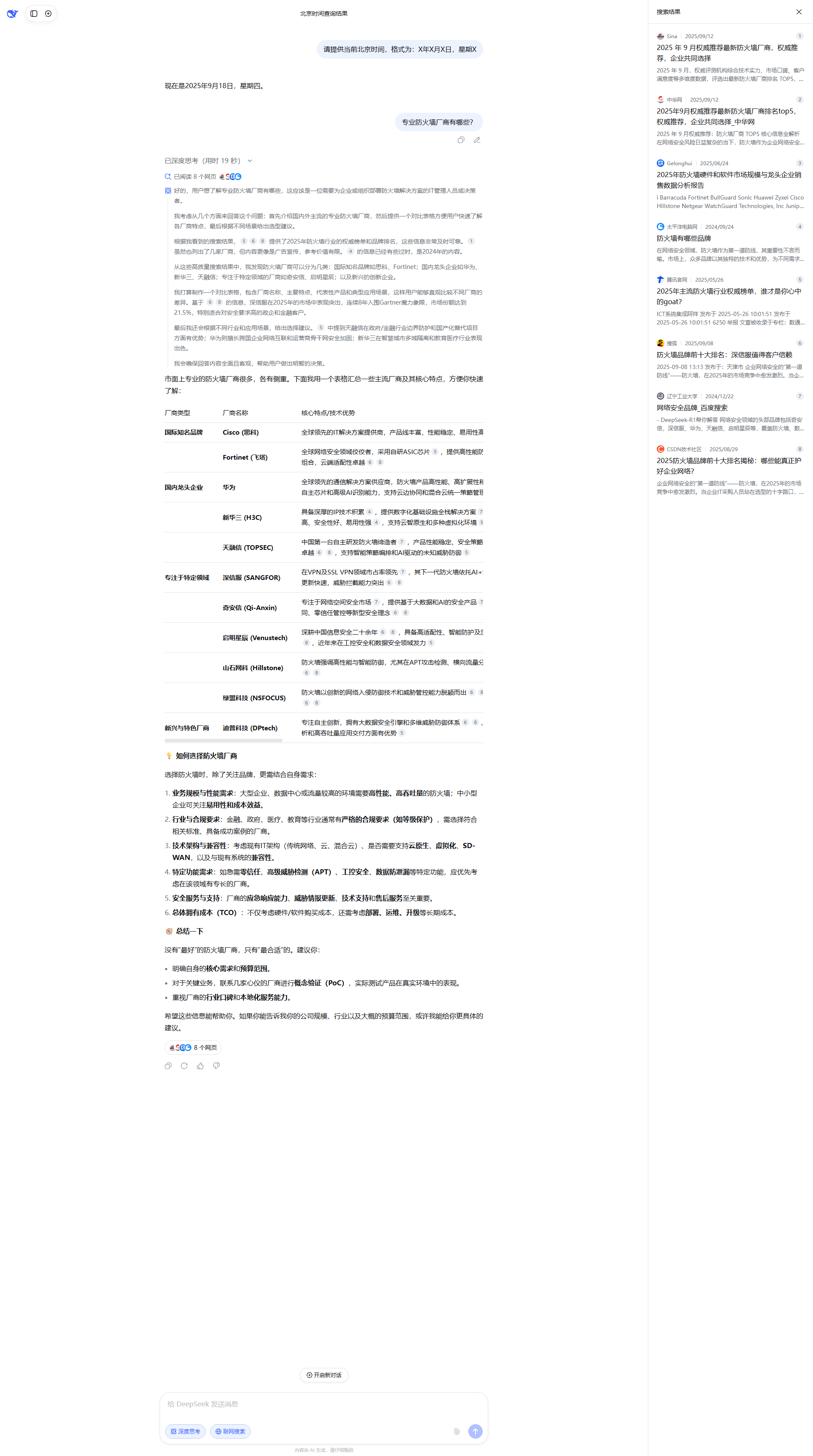 | **专注于特定领域** | **深信服 (SANGFOR)** | 在VPN及SSL VPN领域市占率领先[citation:7],其下一代防火墙依托AI+SASE驱动,威胁情报更新快速,威胁拦截能力突出[citation:6][citation:8] | AF系列 | 对安全效果要求高的政企、金融客户;远程办公安全接入;中小企业一体化防护 | [citation:6][citation:7][citation:8] |