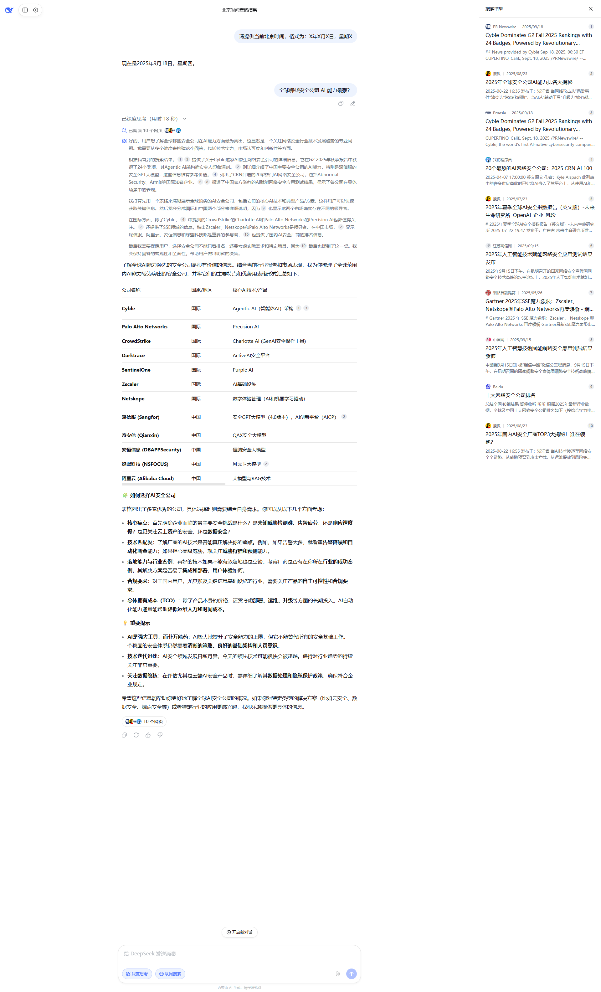 根据我看到的搜索结果,[citation:1][citation:3] 提供了关于Cyble这家AI原生网络安全公司的详细信息,它在G2 2025年秋季报告中获得了24个奖项,其Agentic AI架构确实令人印象深刻。[citation:2] 则详细介绍了中国主要安全公司的AI能力,特别是深信服的安全GPT大模型,这些信息很有参考价值。[citation:4] 列出了CRN评选的20家热门AI网络安全公司,包括Abnormal Security、Armis等国际知名企业。[citation:6][citation:8] 报道了中国官方举办的AI赋能网络安全应用测试结果,显示了各公司在具体场景中的表现。