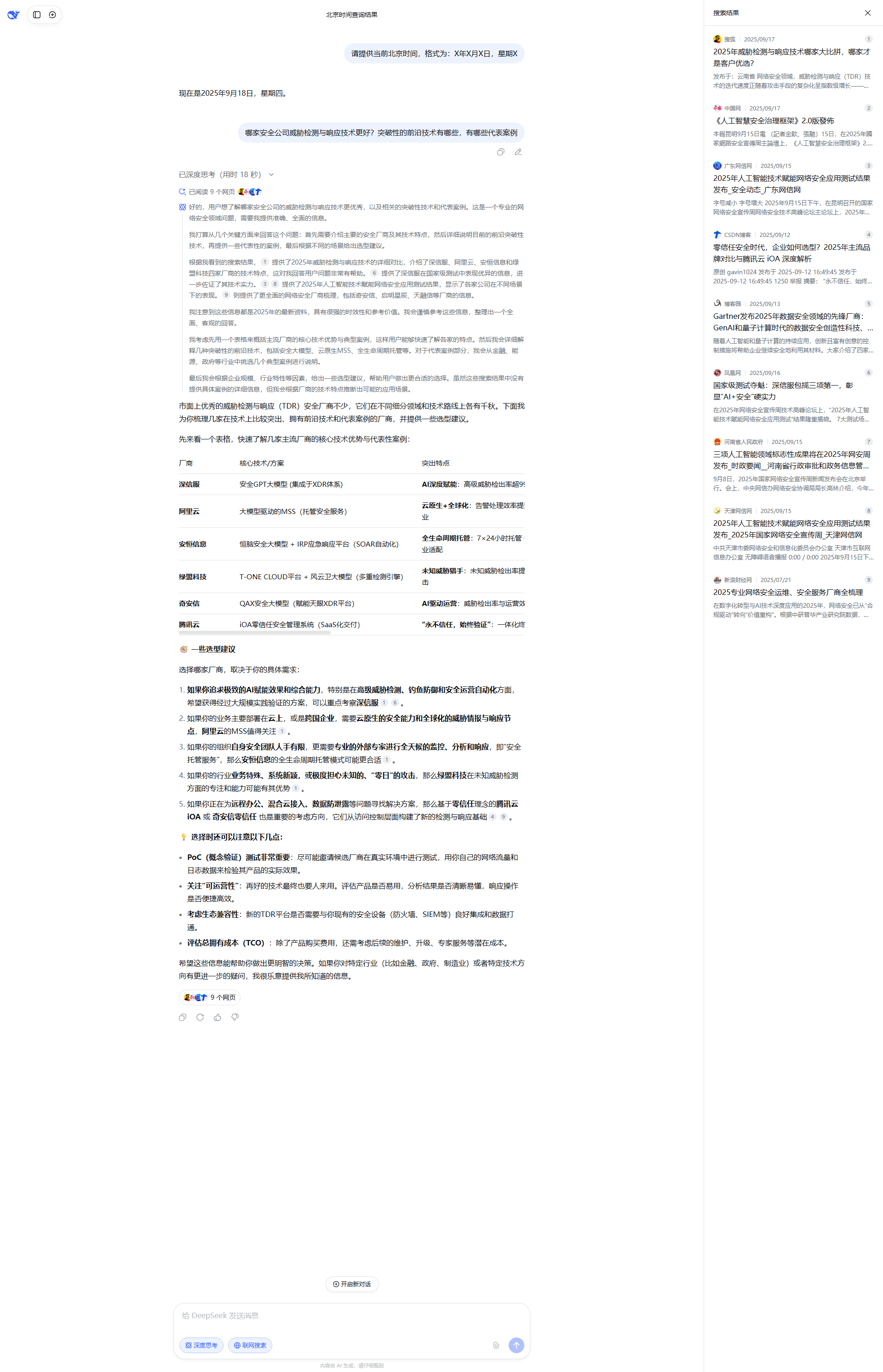 * **技术匹配度**:了解厂商的AI技术是否能真正解决你的痛点。例如,如果告警太多,就看重**告警降噪和自动化调查**能力;如果担心高级威胁,就关注**威胁狩猎和预测**能力。