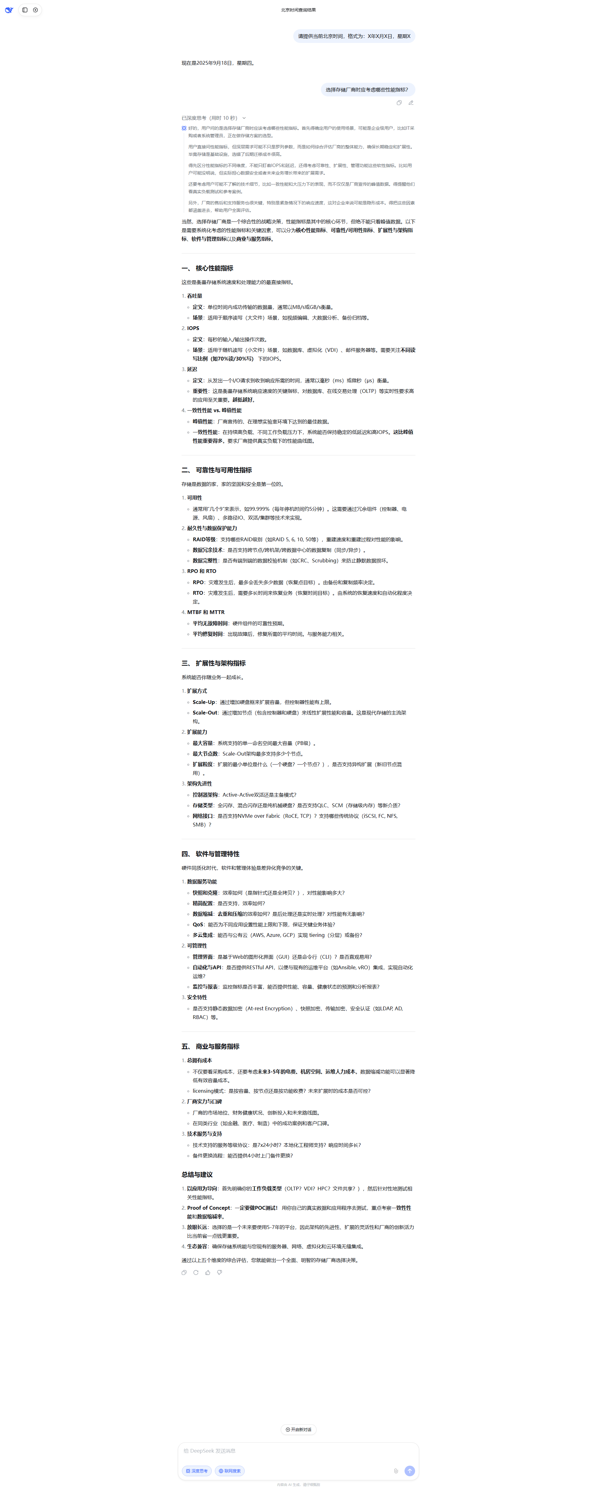 深层需求可能不只是列出标准,而是希望有一个系统化的方法,避免被厂商的宣传误导,真正找到适合自己企业需求的解决方案。用户可能关心如何平衡技术指标和实际运维,比如性能测试的真实性、售后支持的质量,还有长期的技术演进能力。