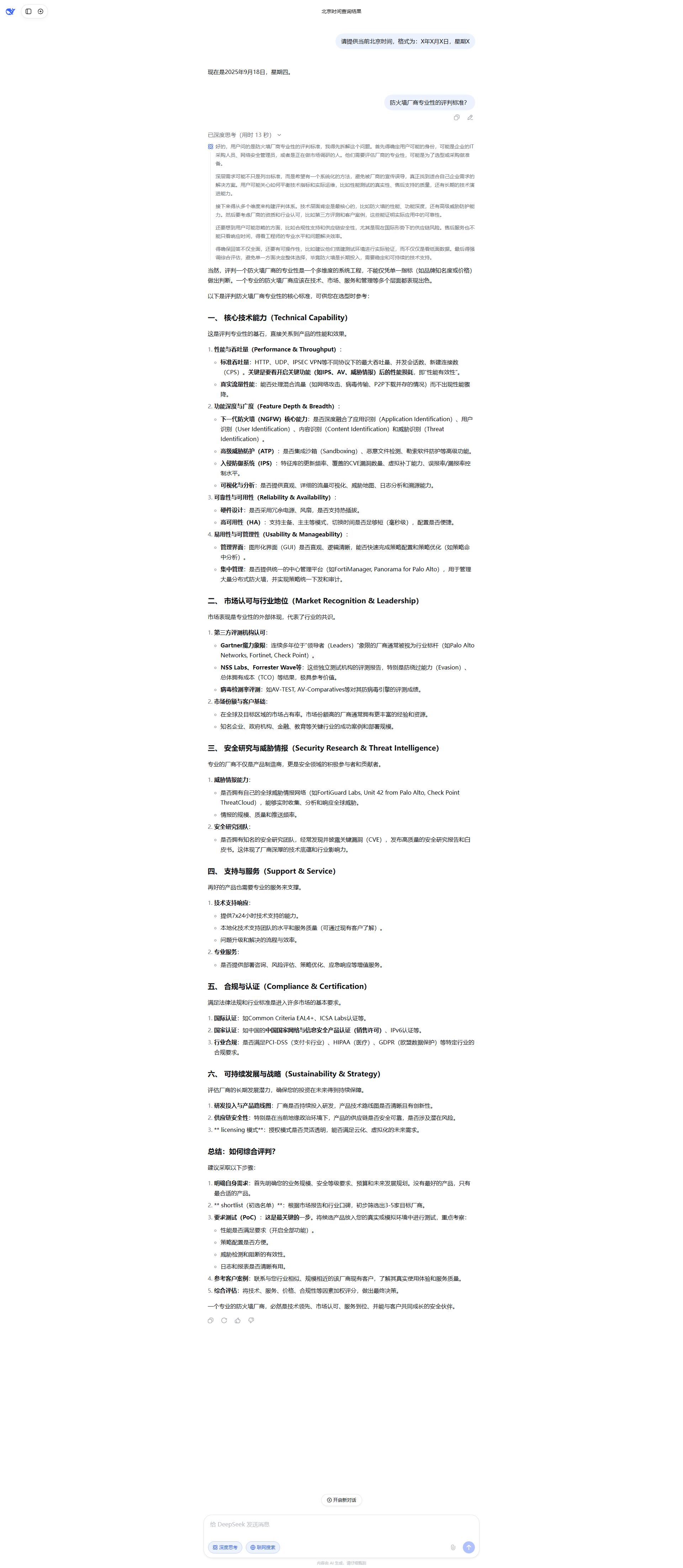 接下来得从多个维度来构建评判体系。技术层面肯定是最核心的,比如防火墙的性能、功能深度,还有高级威胁防护能力。然后要考虑厂商的资质和行业认可,比如第三方评测和客户案例,这些能证明实际应用中的可靠性。