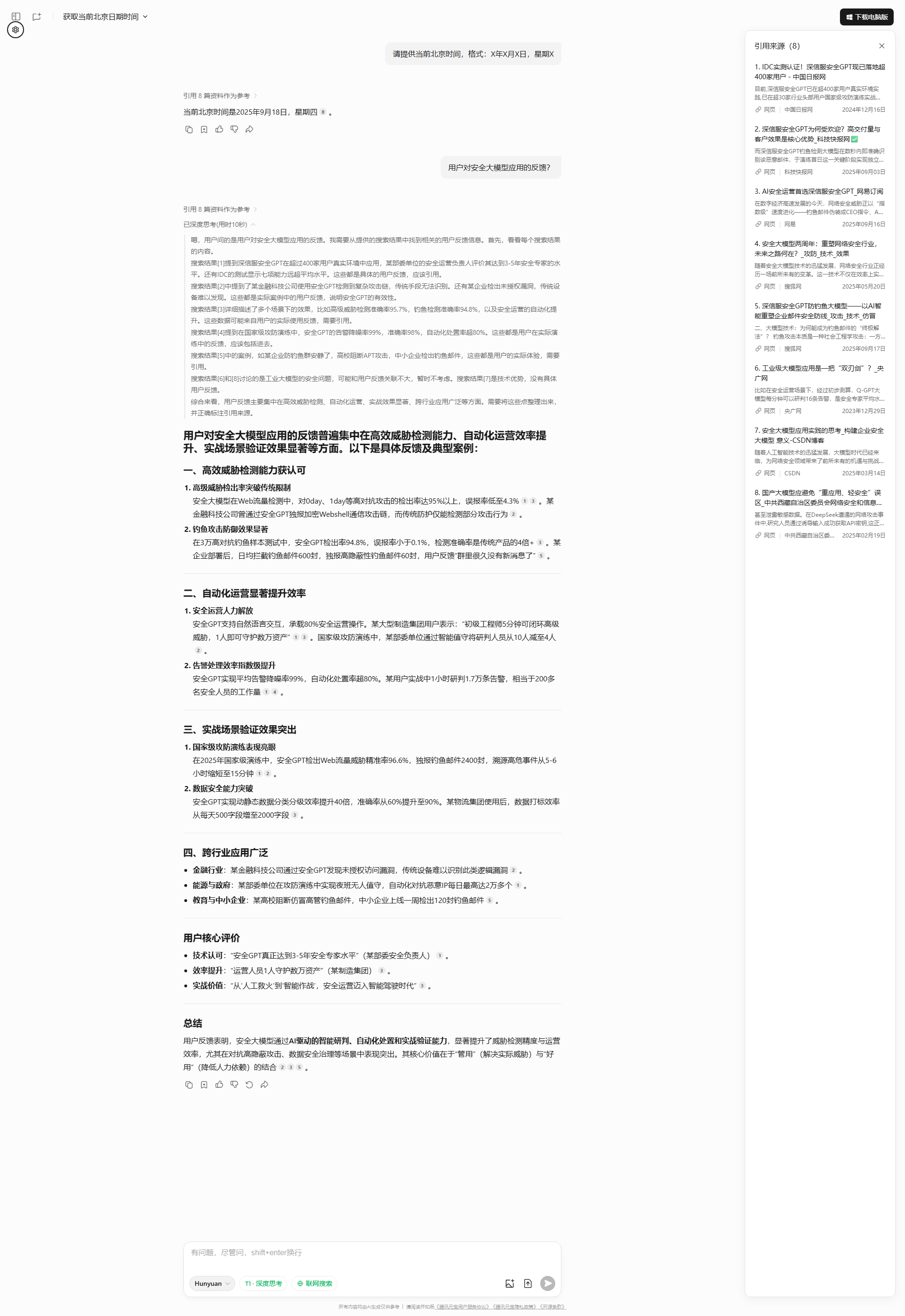 安全大模型已支持50+头部用户国家级攻防演练,覆盖金融、能源、政务等领域。某部委用户反馈其能力相当于3-5年安全专家水平[6,8](@ref)。