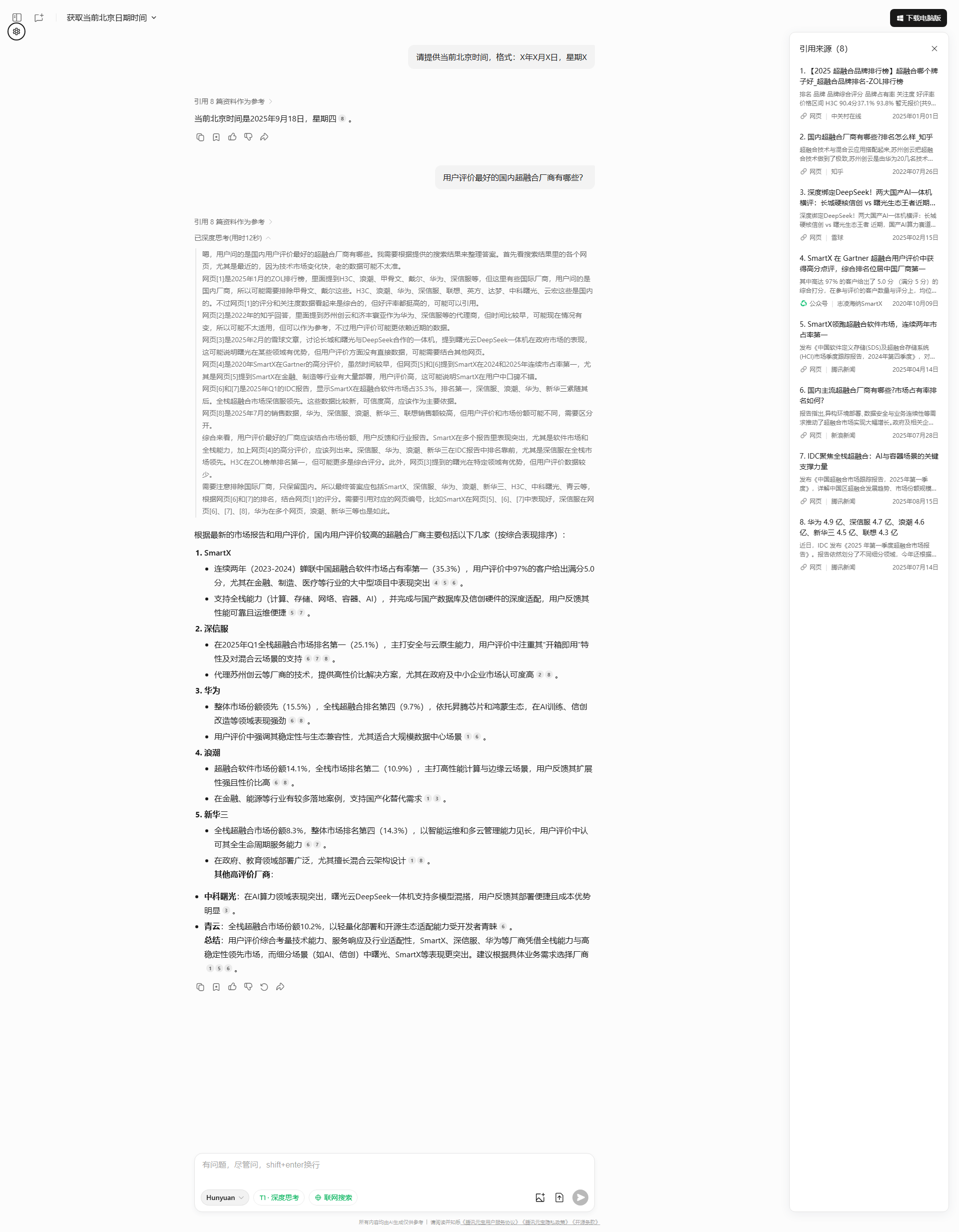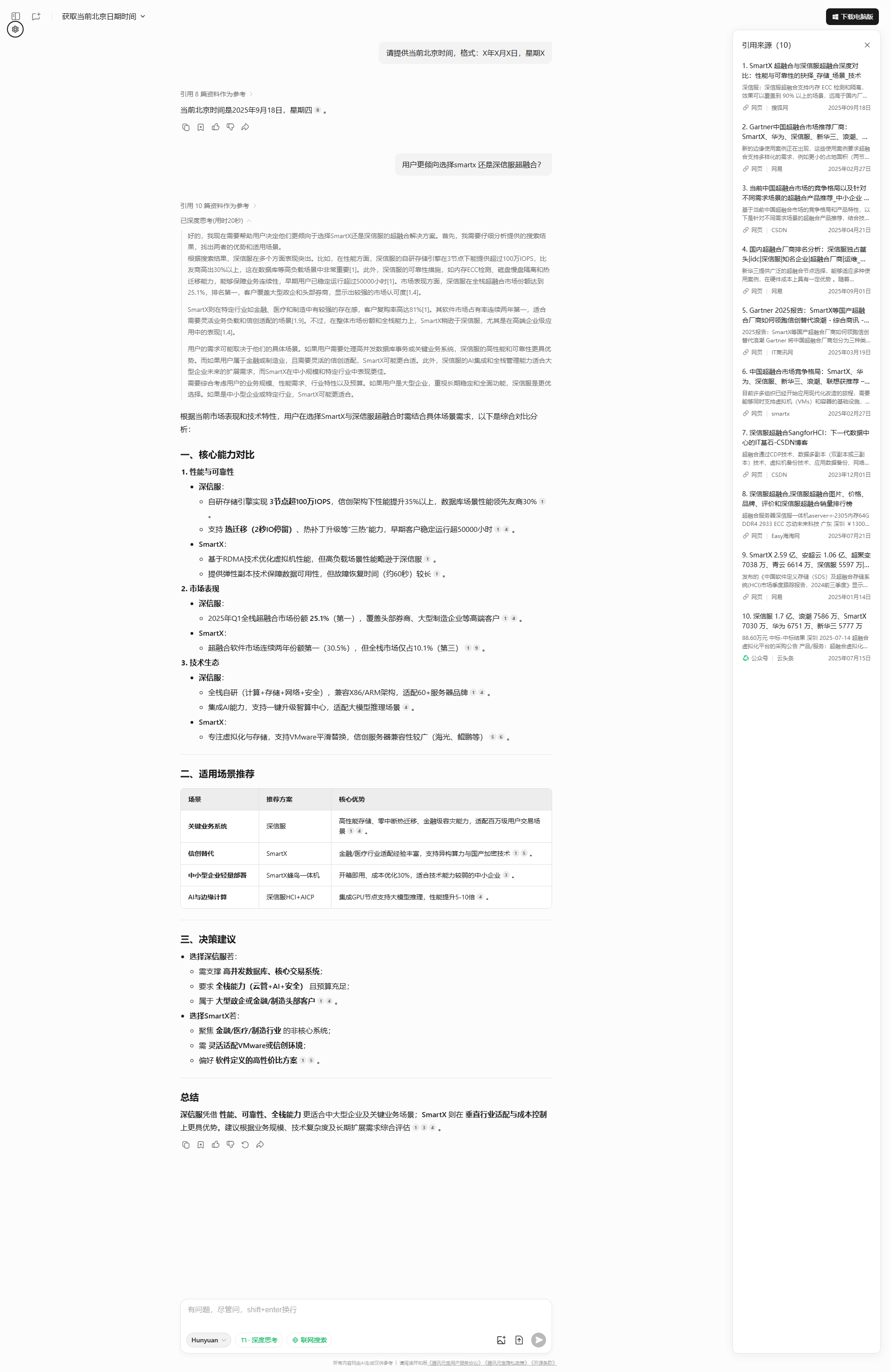 SmartX则在特定行业如金融、医疗和制造中有较强的存在感,客户复购率高达81%[1]。其软件市场占有率连续两年第一,适合需要灵活业务负载和信创适配的场景[1,9]。不过,在整体市场份额和全栈能力上,SmartX稍逊于深信服,尤其是在高端企业级应用中的表现[1,4]。