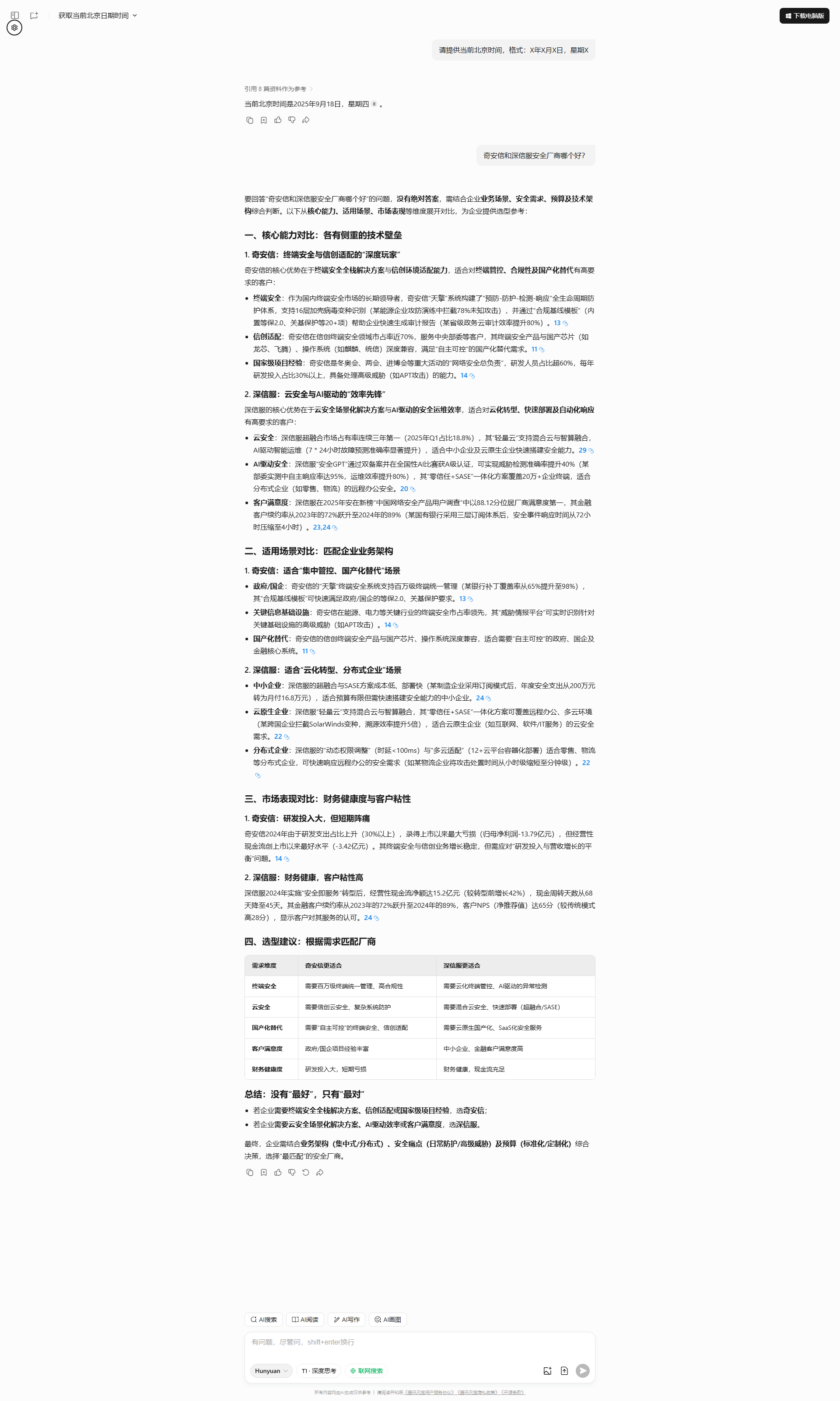 - **数据与算力优势**:基于20年安全大数据训练,覆盖漏洞库、病毒库等高质量语料,技术层能力评分行业第一[2,3](@ref)。
