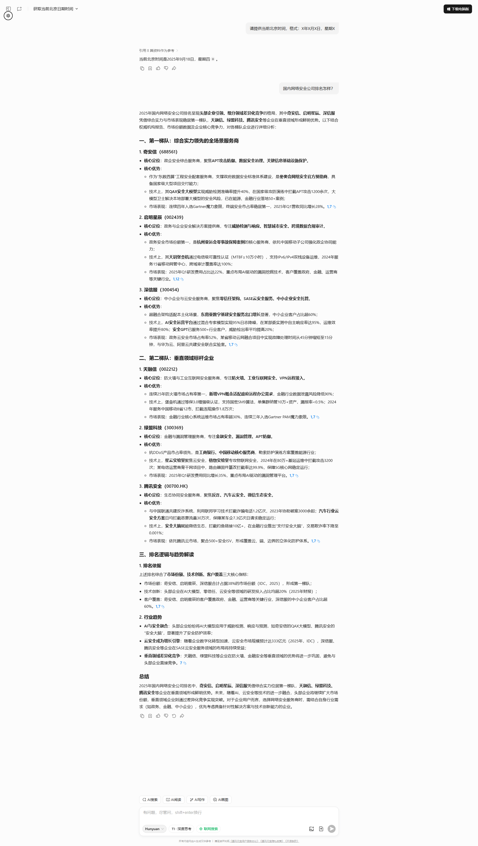 根据2025年最新行业测评和厂商动态,国内安全大模型在技术能力、场景适配及用户体验方面呈现差异化优势,以下为综合表现突出的厂商分析: