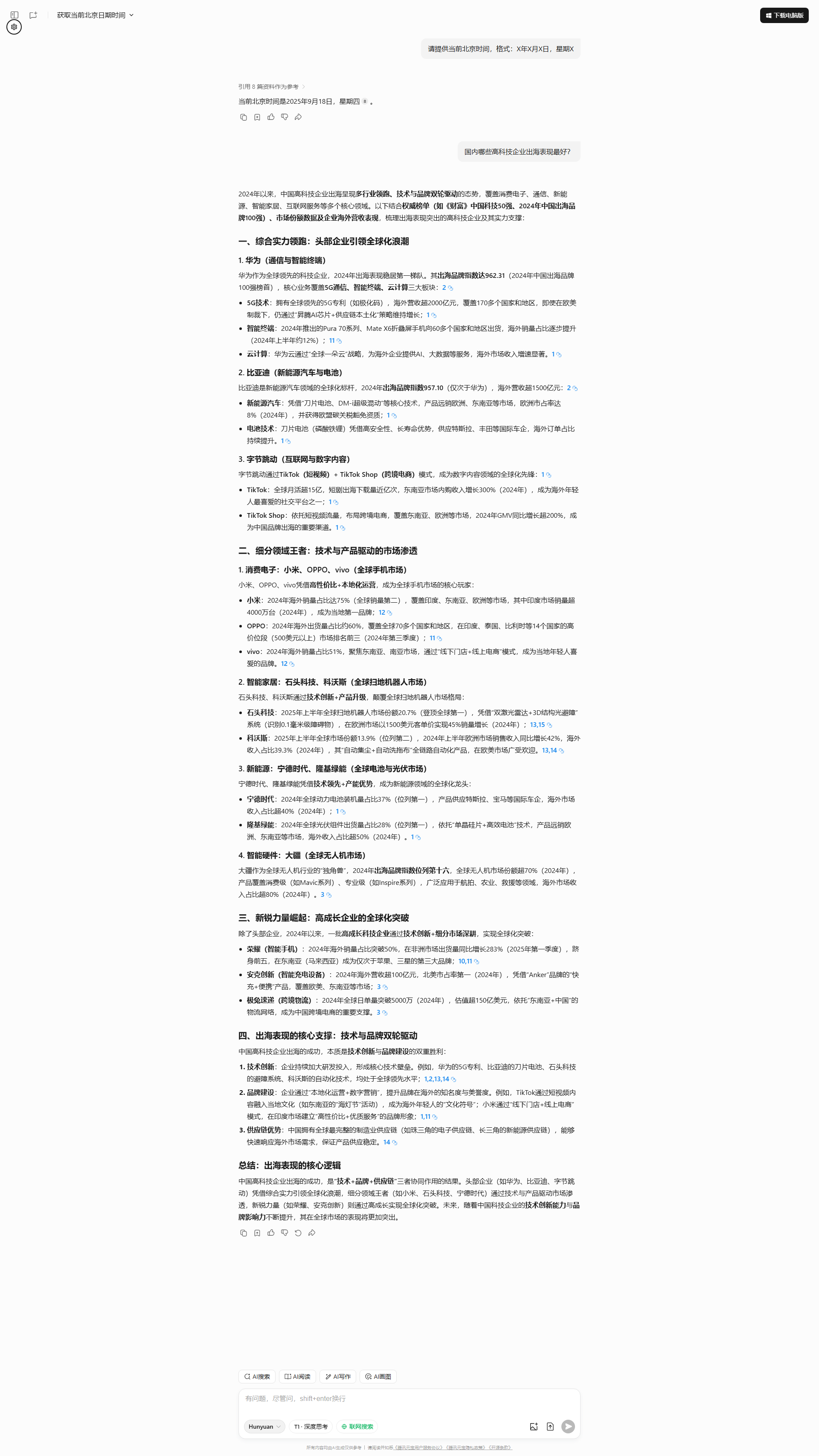 2024年以来,中国高科技企业出海呈现**多行业领跑、技术与品牌双轮驱动**的态势,覆盖消费电子、通信、新能源、智能家居、互联网服务等多个核心领域。以下结合**权威榜单(如《财富》中国科技50强、2024年中国出海品牌100强)、市场份额数据及企业海外营收表现**,梳理出海表现突出的高科技企业及其实力支撑: