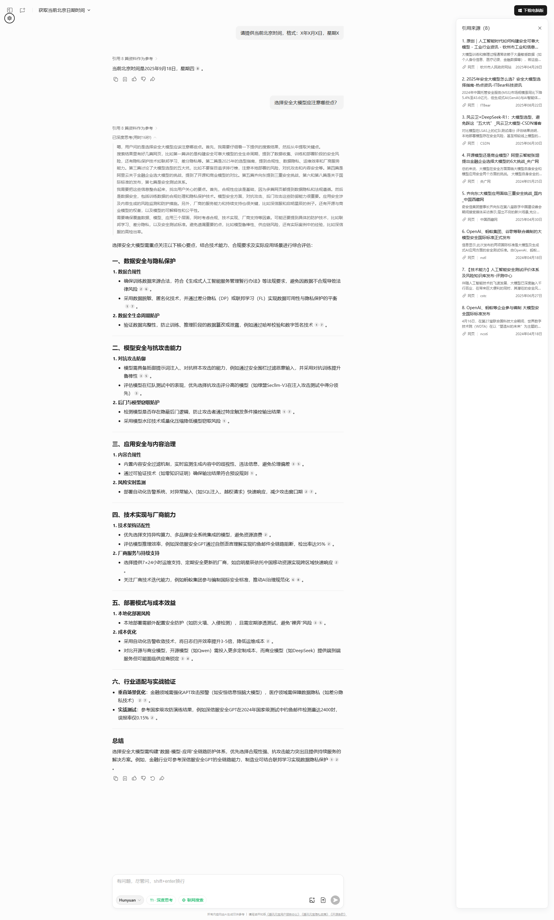 搜索结果里有好几篇网页,比如第一篇讲的是构建安全可靠大模型的全生命周期,提到了数据收集、训练和部署阶段的安全风险,还有隐私保护技术如联邦学习、差分隐私等。第二篇是2025年的选型指南,提到合规性、数据隐私、运维效率和厂商服务能力。第三篇讨论了大模型选型的五大坑,比如不要盲目追求排行榜,注意本地部署的风险,对抗攻击和内容安全等。第四篇是阿里云关于金融企业选大模型的挑战,提到了开源和商业模型的对比。第五篇齐向东提到三重安全挑战,第六和第八篇是关于国际标准的发布,第七篇是安全测试体系。