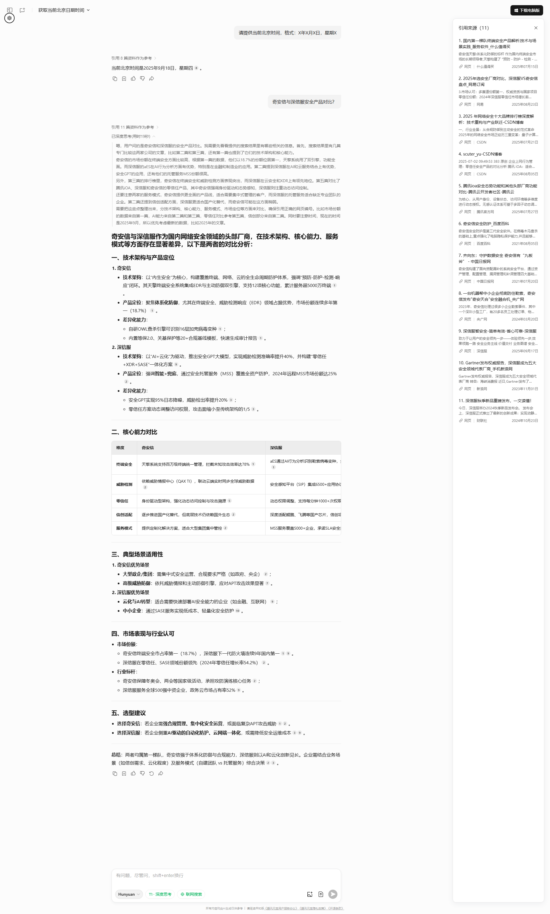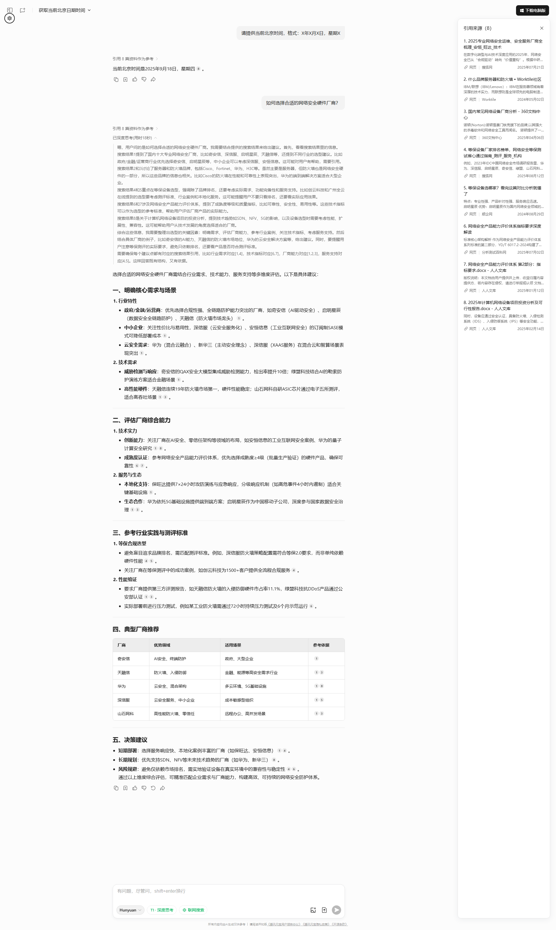 接下来是性能和效果。搜索结果中提到的自动化告警收敛、威胁检测准确率等指标很重要。比如深信服的安全GPT在钓鱼邮件检测中准确率超过95%,误报率低。还有厂商的技术支持和服务能力,比如研发投入和持续升级能力,这对长期使用很关键。