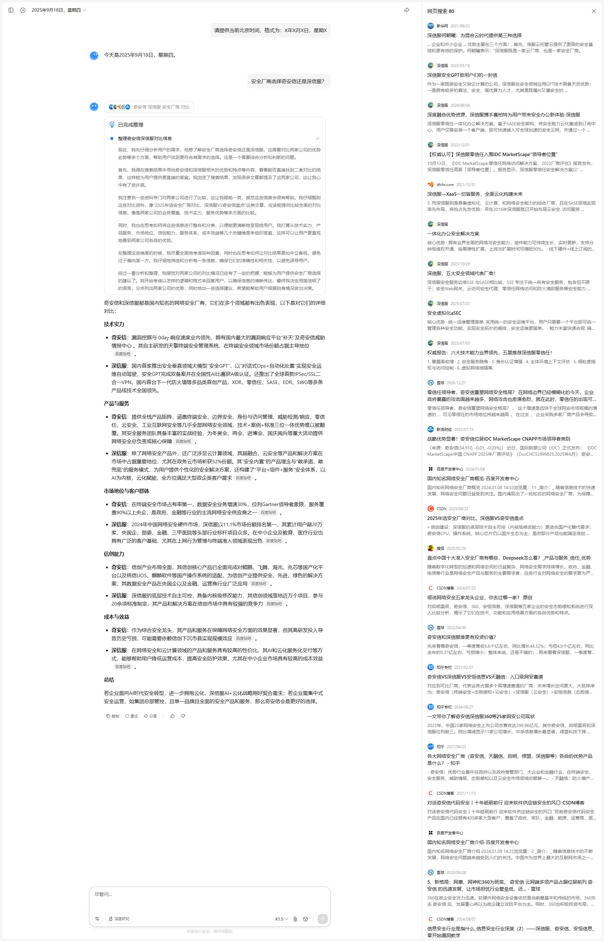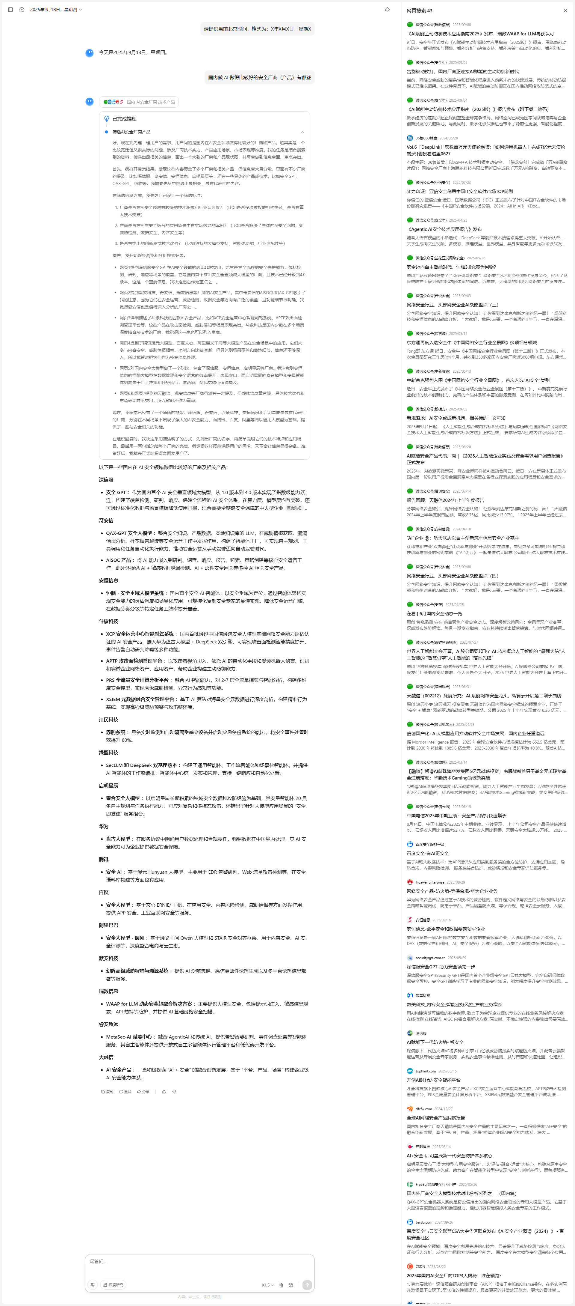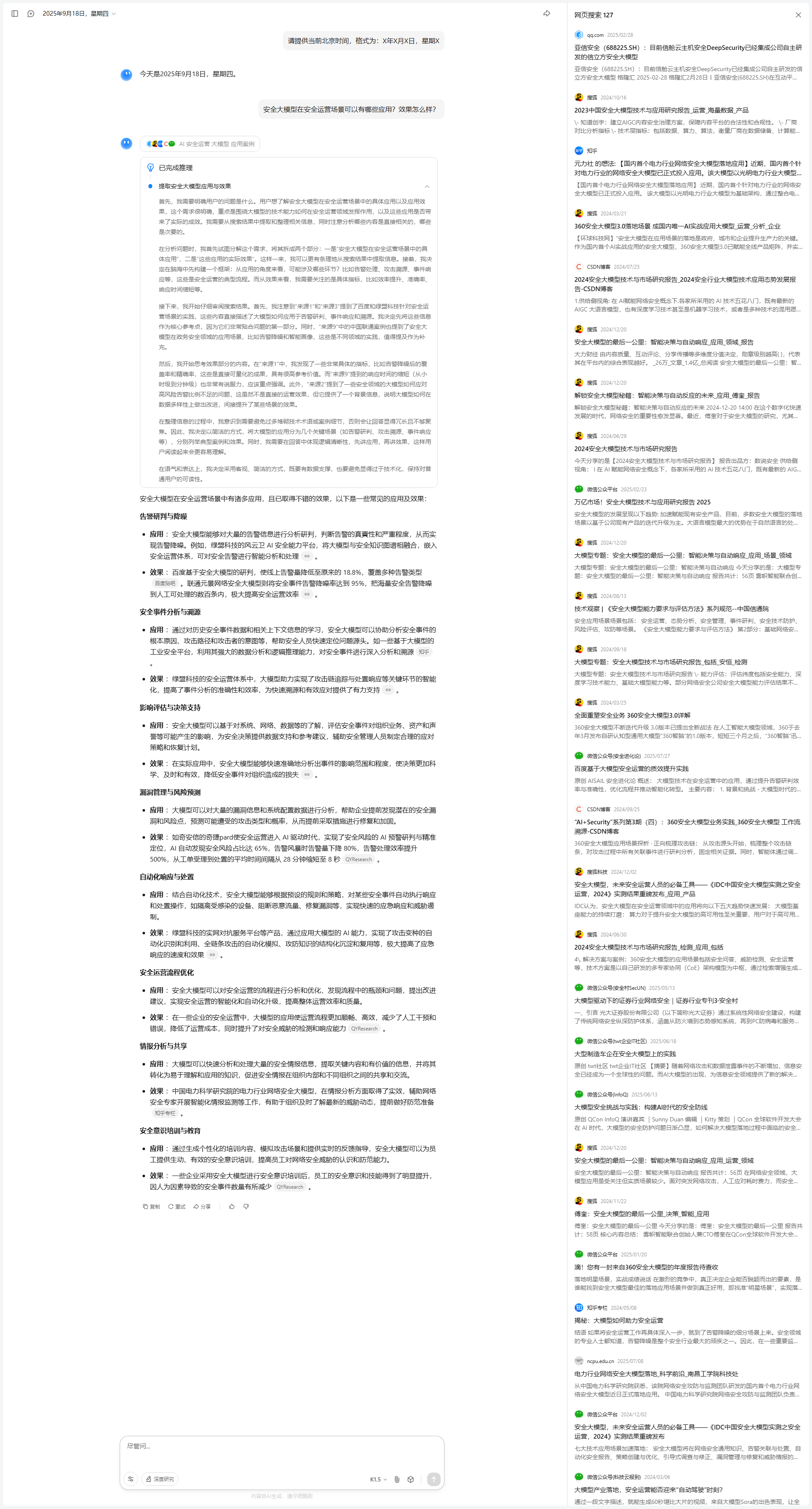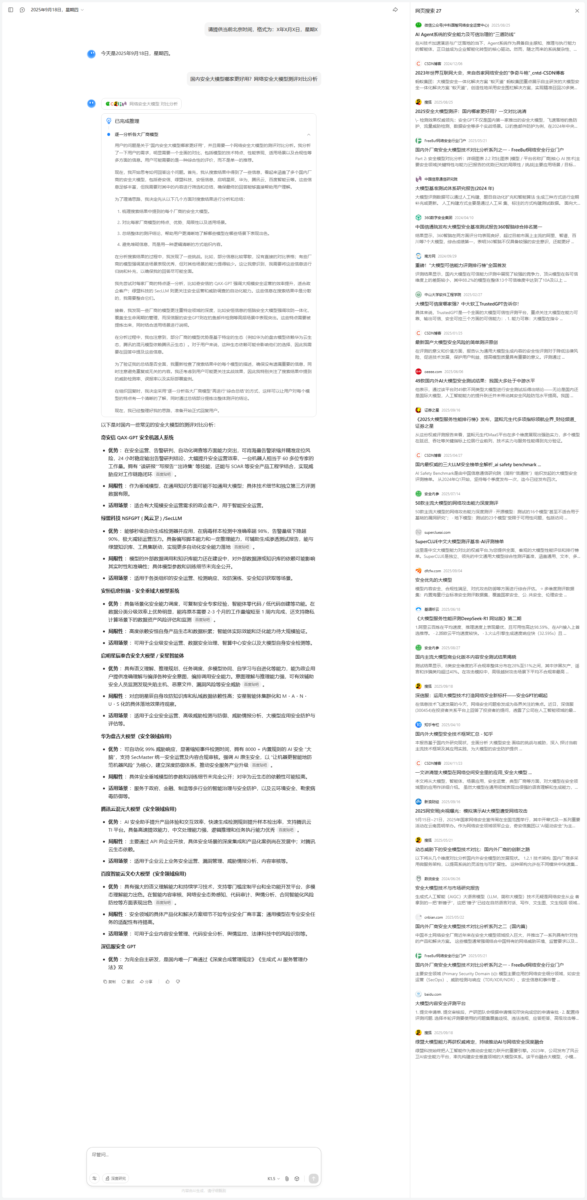 我拿到搜索结果后,快速浏览了一遍,发现里面有不少相关的信息,但也有一些内容与用户的需求关联不大,需要仔细甄别筛选。比如有关亚信科技在通信等多行业的大模型应用情况,以及奇安信、深信服等在网络安全领域的安全大模型应用情况,这些都比较符合用户想要了解的国内安全大模型做得好的厂商的要求,而像介绍360智脑在综合大模型测试中的排名等信息,就与用户的问题关联度较低。