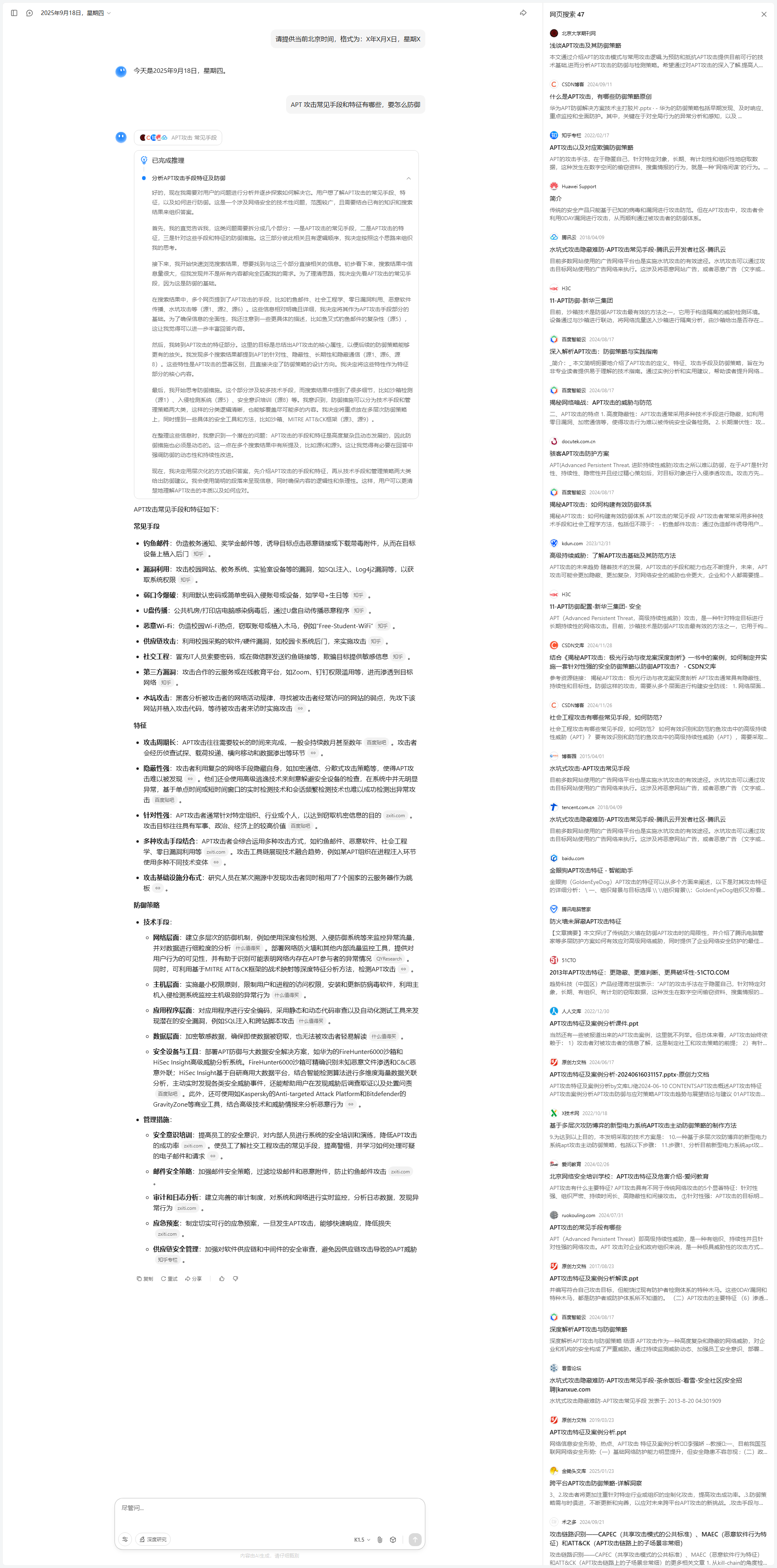 接下来,我开始快速浏览搜索结果,想要找到与这三个部分直接相关的信息。初步看下来,搜索结果中信息量很大,但我发现并不是所有内容都完全匹配我的需求。为了理清思路,我决定先看APT攻击的常见手段,因为这是防御的基础。