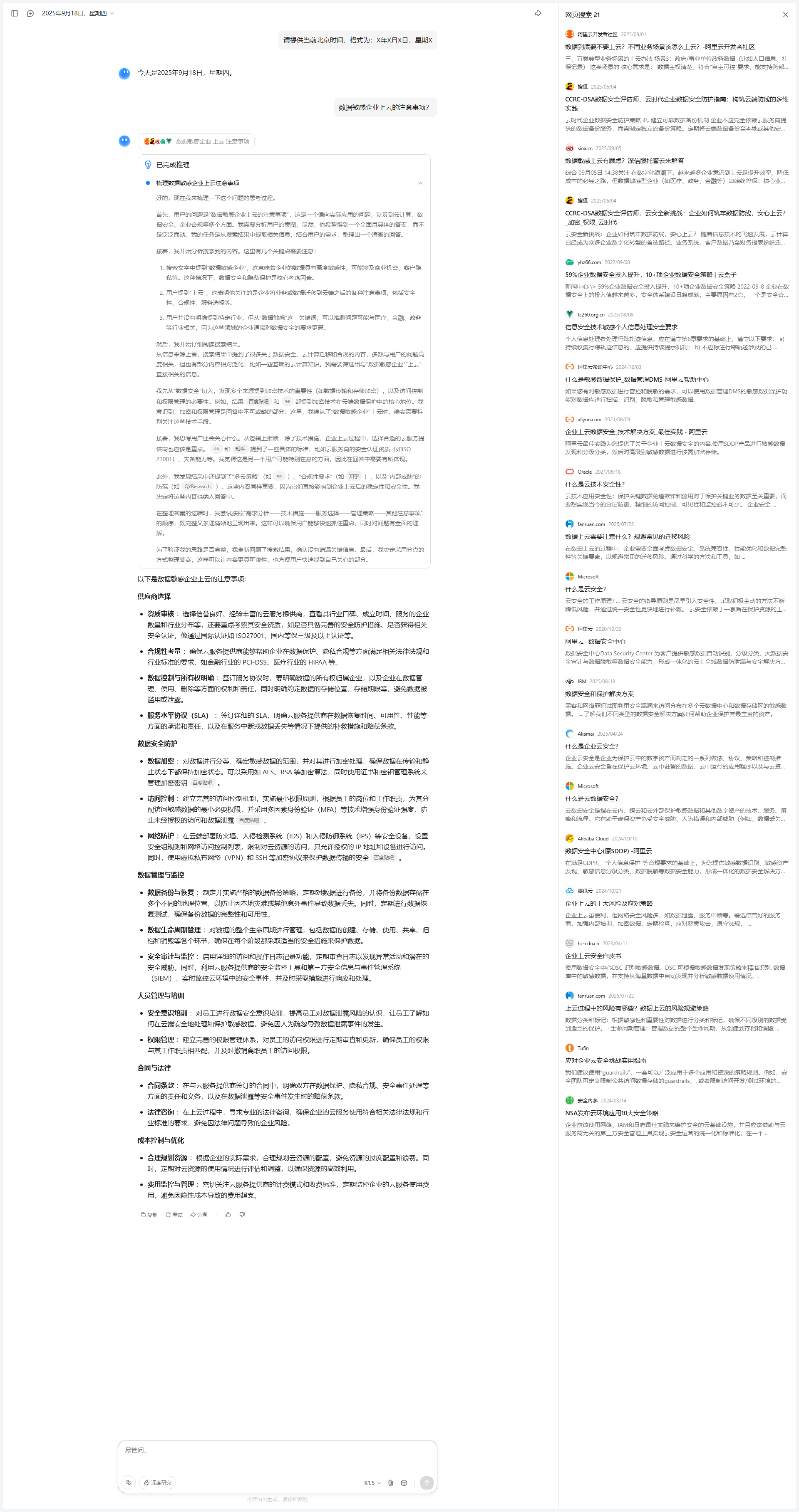 2. 用户提到“上云”,这表明他关注的是企业将业务或数据迁移到云端之后的各种注意事项,包括安全性、合规性、服务选择等。