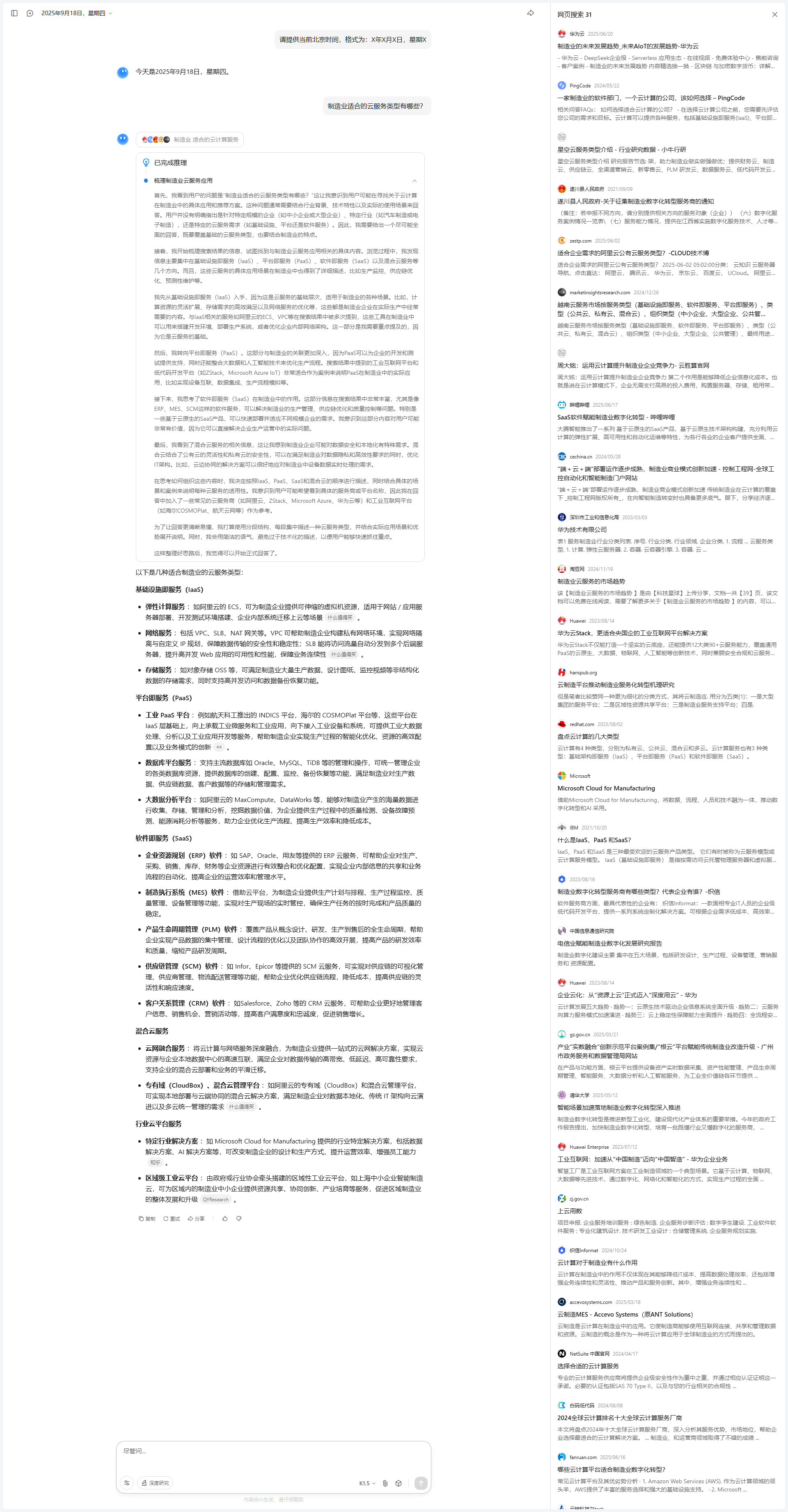 接下来,我思考了软件即服务(SaaS)在制造业中的作用。这部分信息在搜索结果中非常丰富,尤其是像ERP、MES、SCM这样的软件服务,可以解决制造业的生产管理、供应链优化和质量控制等问题。特别是一些基于云原生的SaaS产品,可以快速部署并适应不同规模企业的需求。我意识到这部分内容对用户可能非常有价值,因为它可以直接解决企业生产运营中的实际问题。