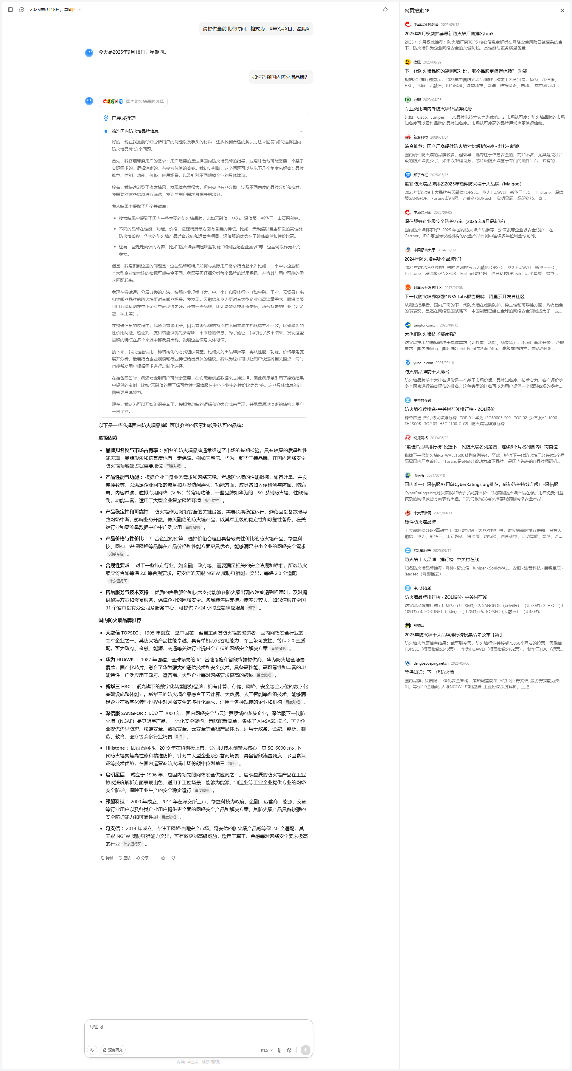 第九个来源提到了深信服的一些技术特点,比如下一代防火墙、安全感知平台和全流量分析技术,这些技术点可以作为补充描述国内厂商在综合安全分析和威胁检测方面的技术优势。