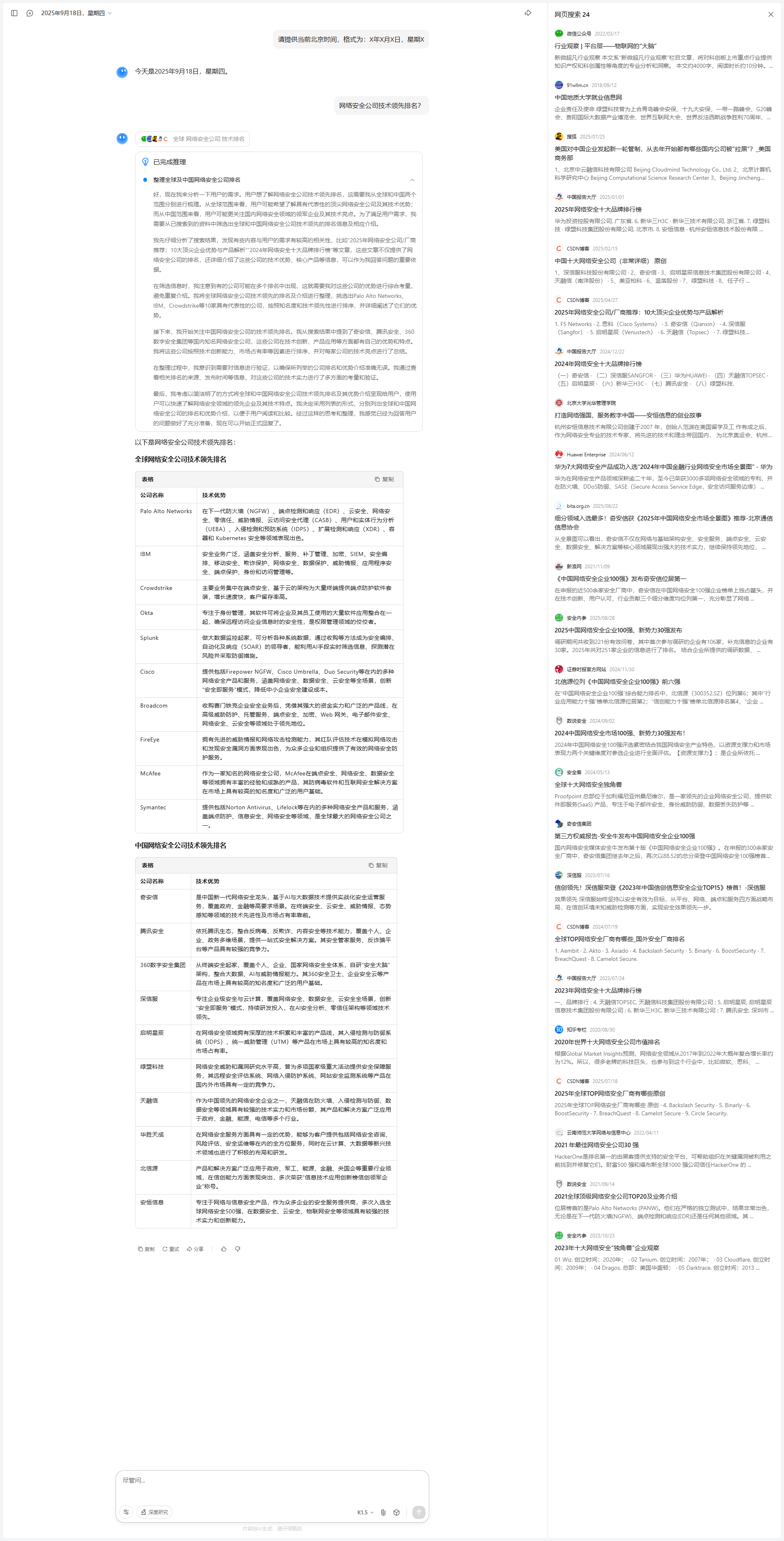 好,现在我来分析一下用户的需求。用户想了解网络安全公司技术领先排名,这需要我从全球和中国两个范围分别进行梳理。从全球范围来看,用户可能希望了解具有代表性的顶尖网络安全公司及其技术优势;而从中国范围来看,用户可能更关注国内网络安全领域的领军企业及其技术亮点。为了满足用户需求,我需要从已搜索到的资料中筛选出全球和中国网络安全公司技术领先的排名信息及相应介绍。
