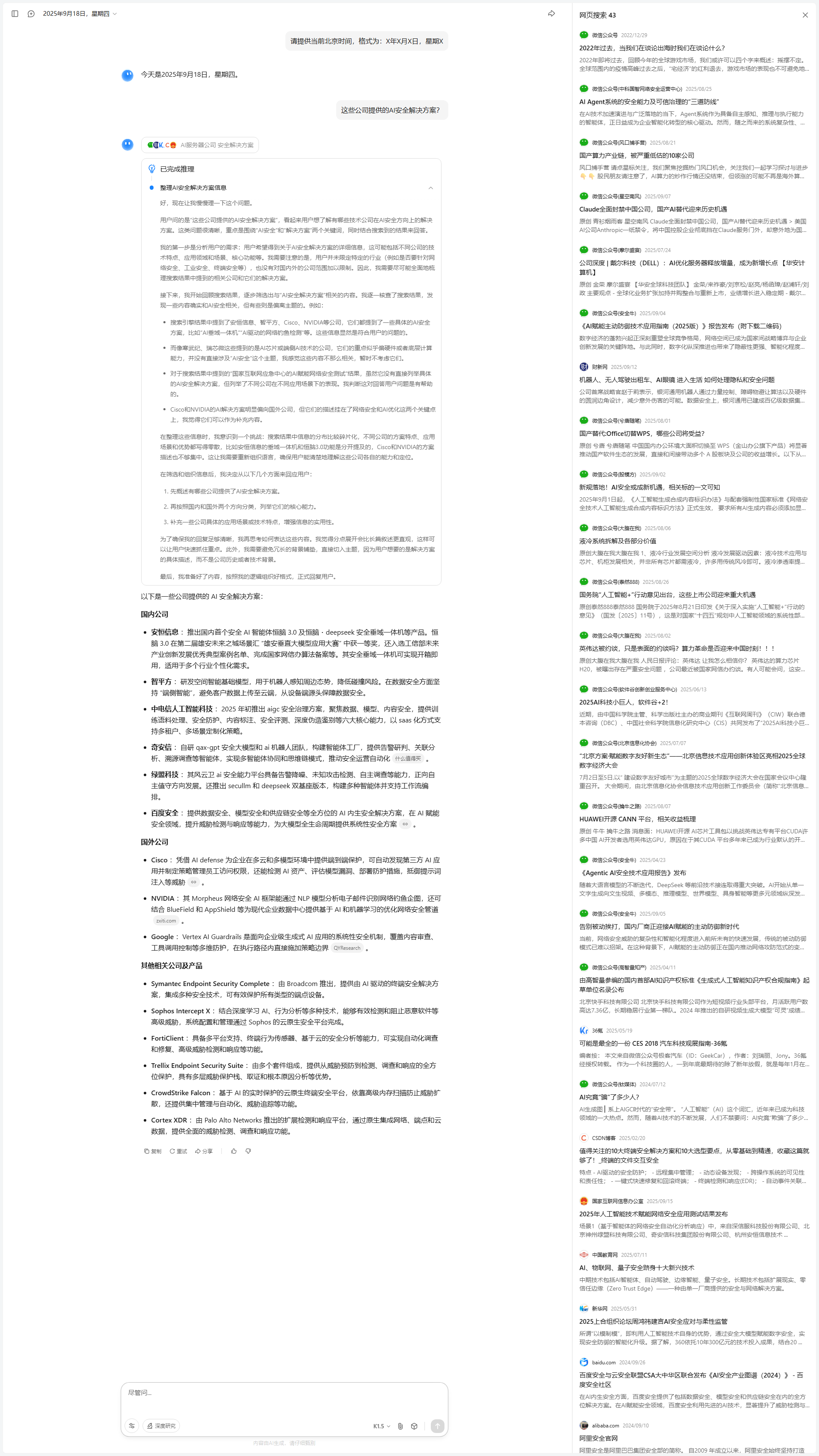 我的第一步是分析用户的需求:用户希望得到关于AI安全解决方案的详细信息,这可能包括不同公司的技术特点、应用领域和场景、核心功能等。我需要注意的是,用户并未限定特定的行业(例如是否要针对网络安全、工业安全、终端安全等),也没有对国内外的公司范围加以限制。因此,我需要尽可能全面地梳理搜索结果中提到的相关公司和它们的解决方案。