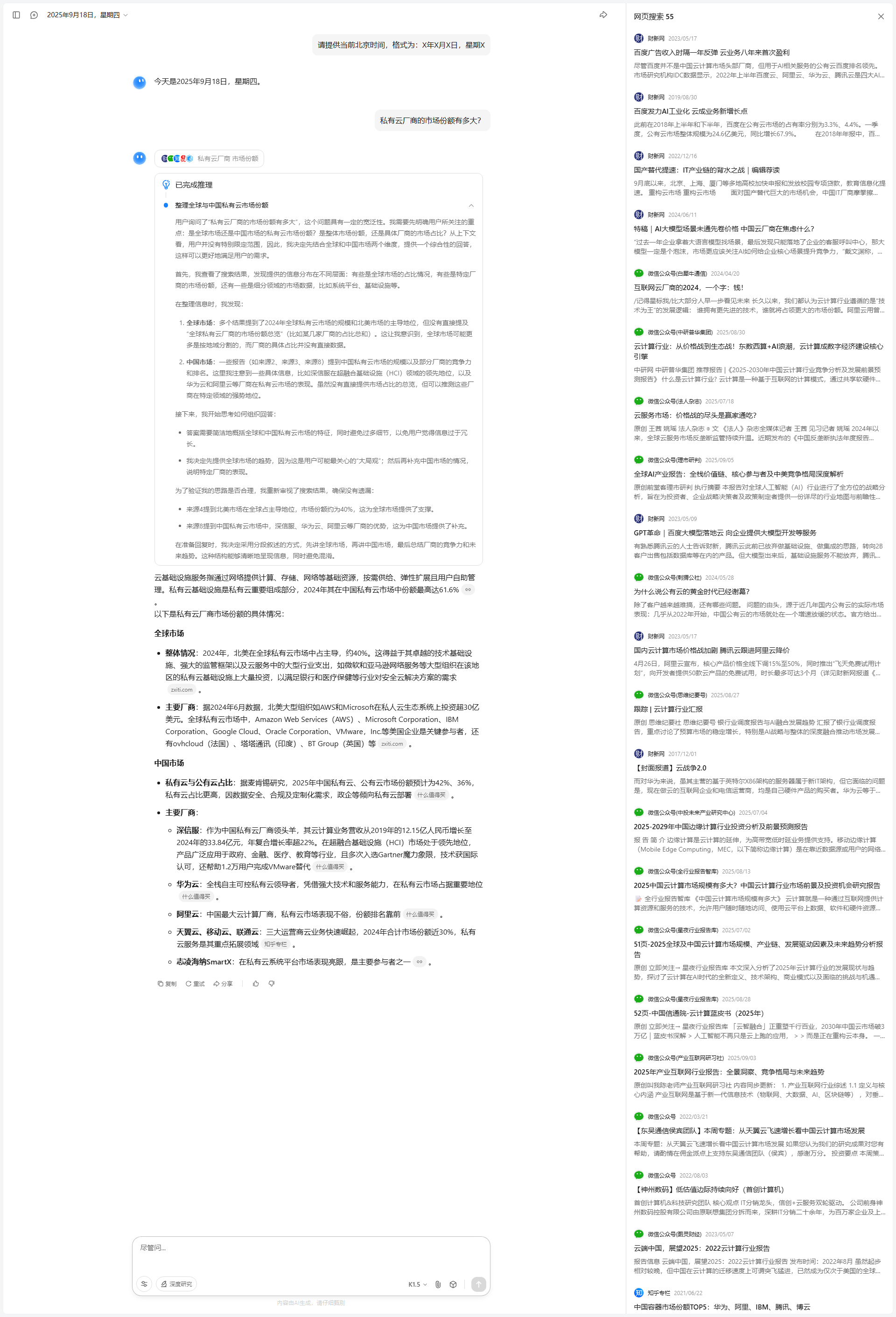 用户询问了“私有云厂商的市场份额有多大”,这个问题具有一定的宽泛性。我需要先明确用户所关注的重点:是全球市场还是中国市场的私有云市场份额?是整体市场份额,还是具体厂商的市场占比?从上下文看,用户并没有特别限定范围,因此,我决定先结合全球和中国市场两个维度,提供一个综合性的回答,这样可以更好地满足用户的需求。