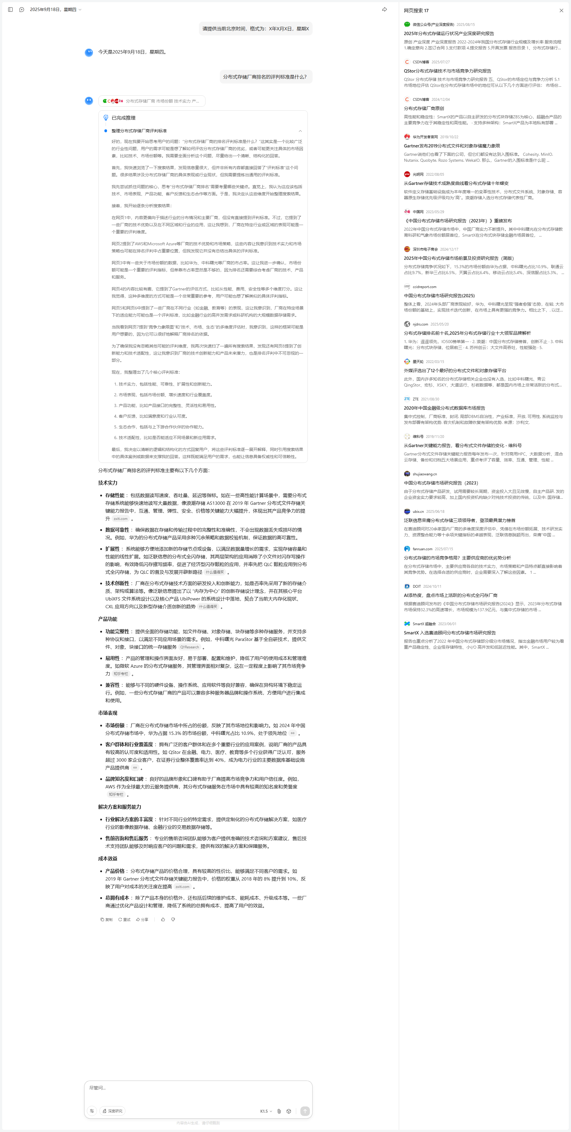 我先尝试抓住问题的核心,思考“分布式存储厂商排名”需要考量哪些关键点。直觉上,我认为这应该包括技术、市场表现、产品功能、客户反馈和生态合作等方面。于是,我决定从这些维度开始整理搜索结果。
