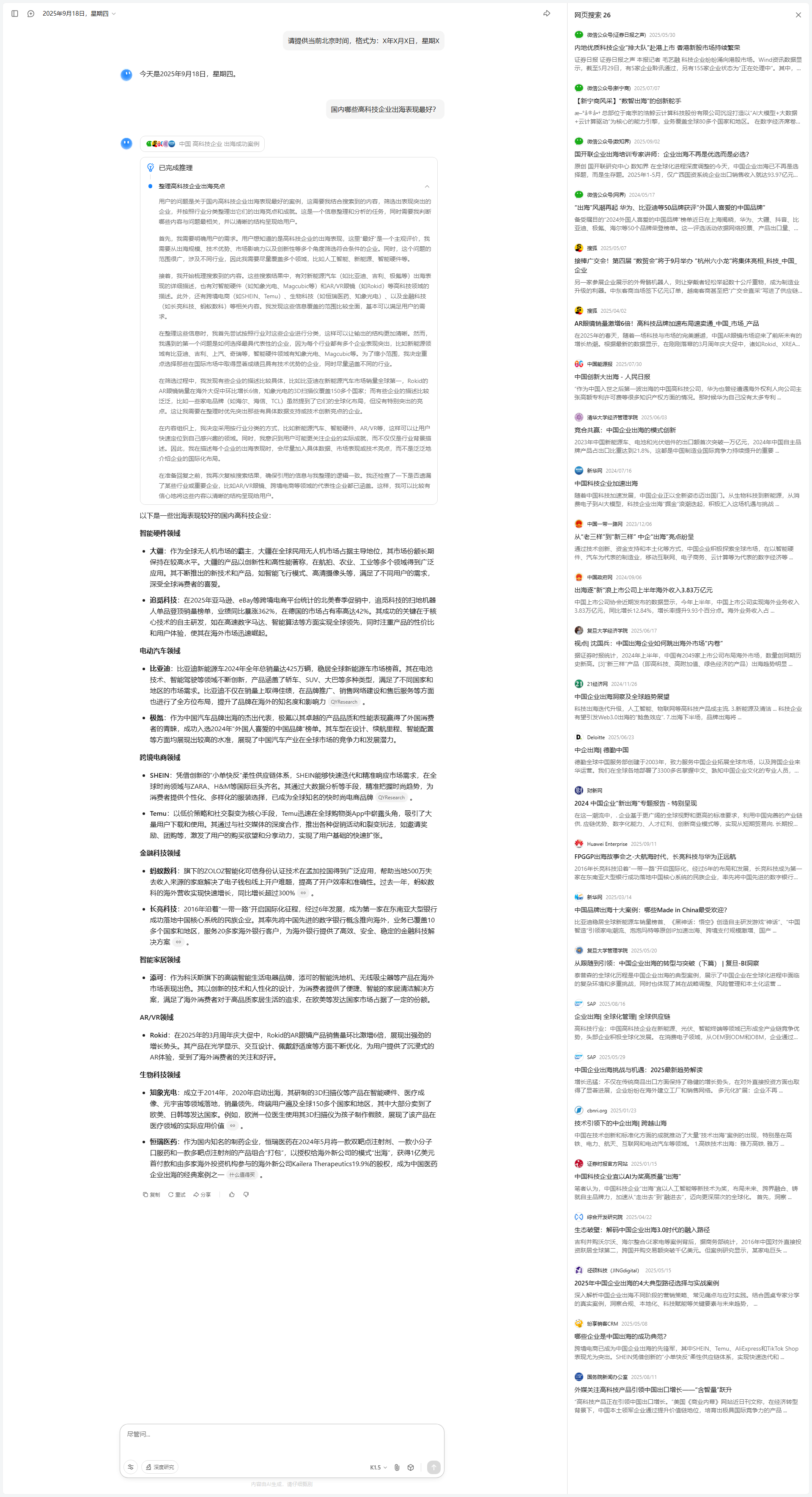 接着,我开始梳理搜索到的内容。这些搜索结果中,有对新能源汽车(如比亚迪、吉利、极氪等)出海表现的详细描述,也有对智能硬件(如知象光电、Magcubic等)和AR/VR眼镜(如Rokid)等高科技领域的描述。此外,还有跨境电商(如SHEIN、Temu)、生物科技(如恒瑞医药、知象光电)、以及金融科技(如长亮科技、蚂蚁数科)等相关内容。我发现这些信息覆盖的范围比较全面,基本可以满足用户的需求。