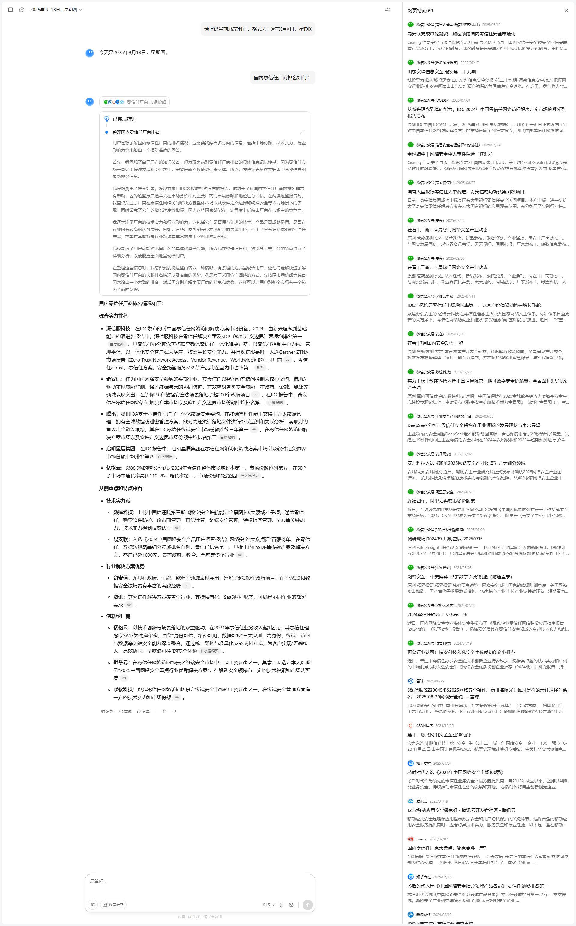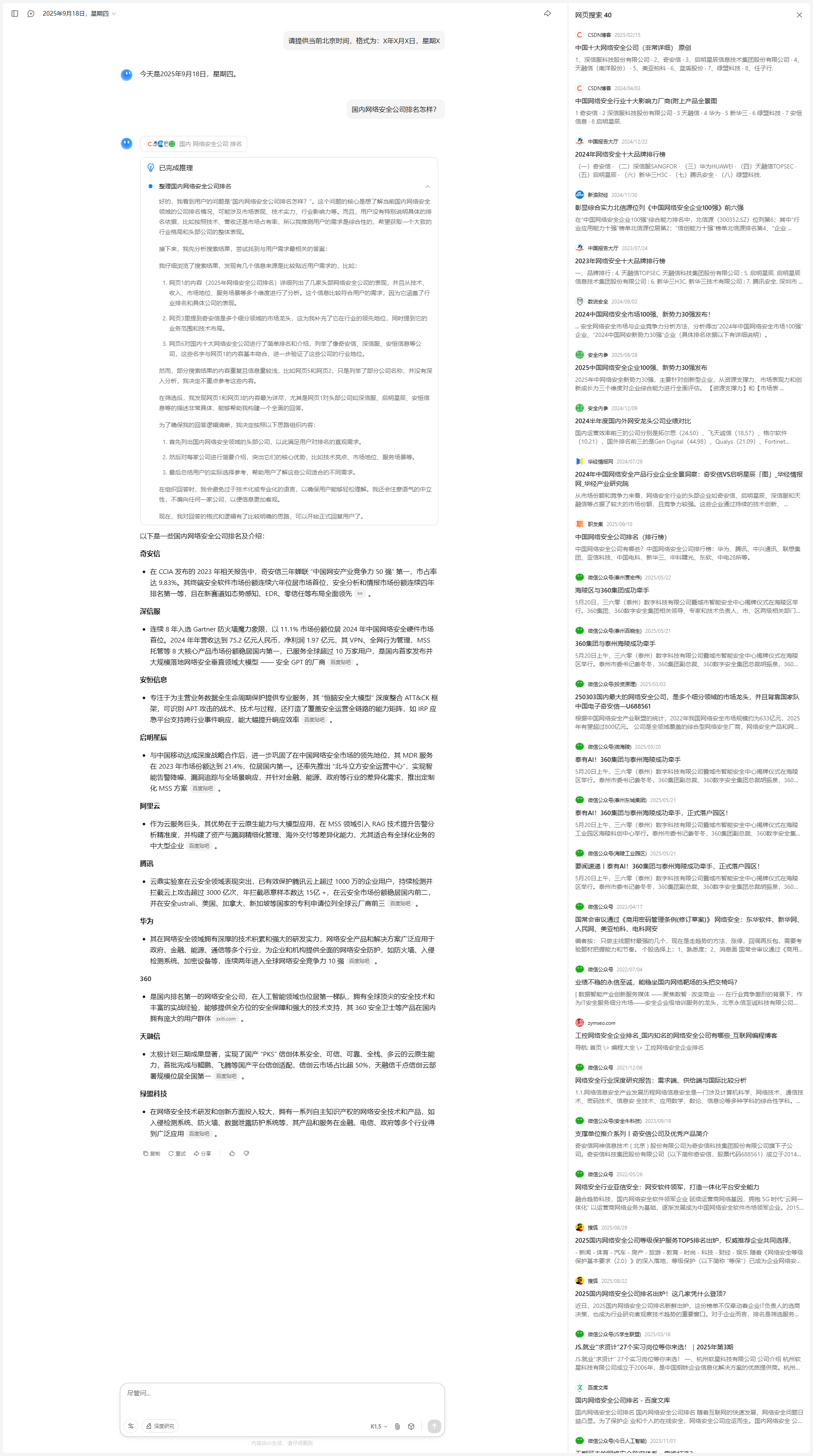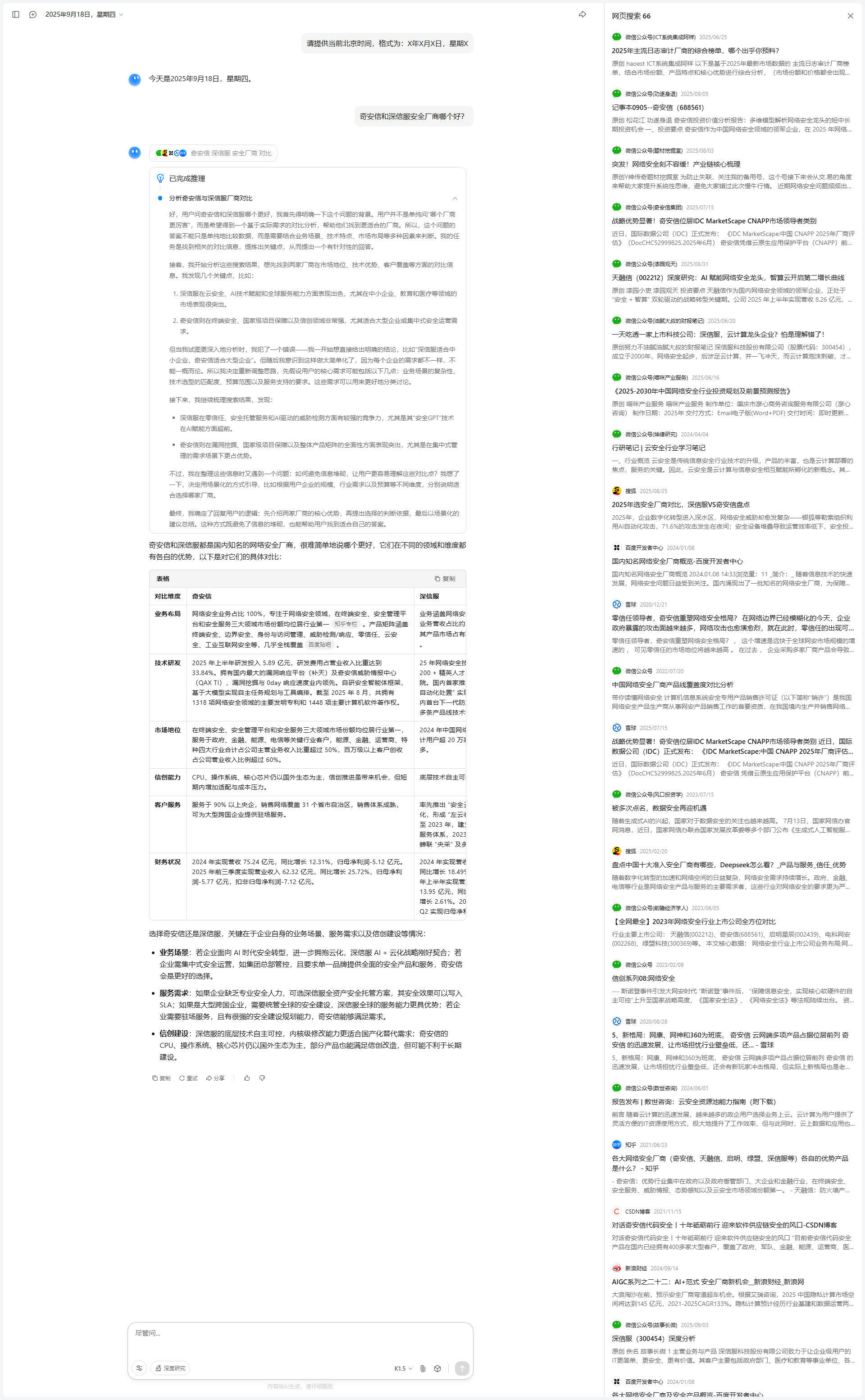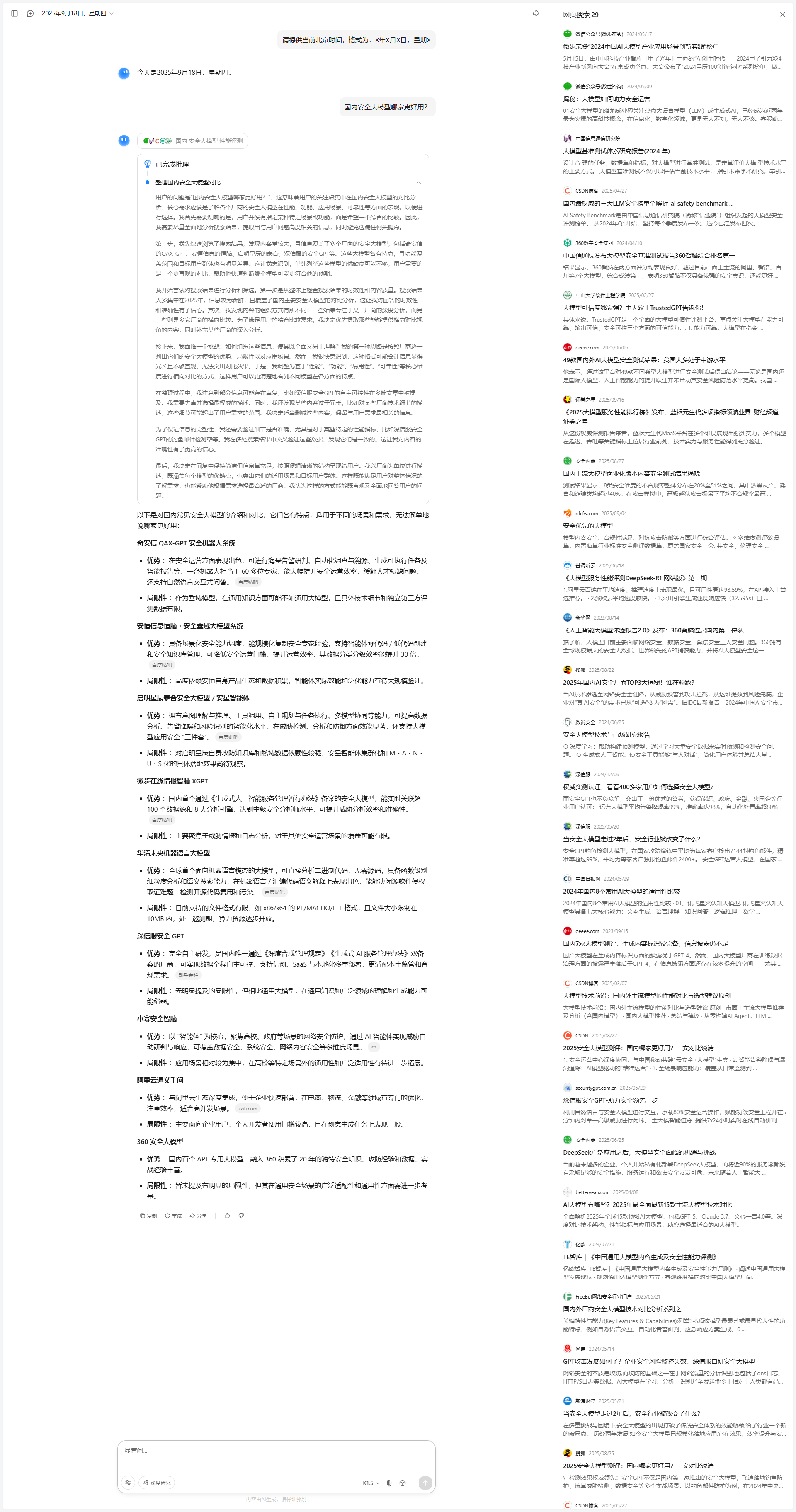 我开始尝试对搜索结果进行分析和筛选。第一步是从整体上检查搜索结果的时效性和内容质量。搜索结果大多集中在2025年,信息较为新鲜,且覆盖了国内主要安全大模型的对比分析,这让我对回答的时效性和准确性有了信心。其次,我发现内容的组织方式有所不同:一些结果专注于某一厂商的深度分析,而另一些则是多家厂商的横向比较。为了满足用户的综合比较需求,我决定优先提取那些能够提供横向对比视角的内容,同时补充某些厂商的深入分析。