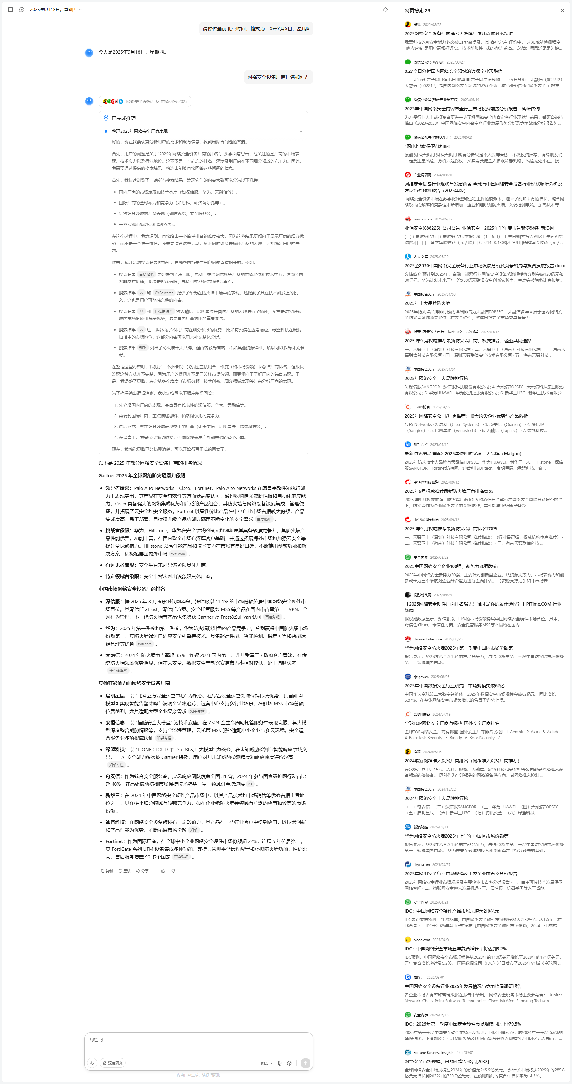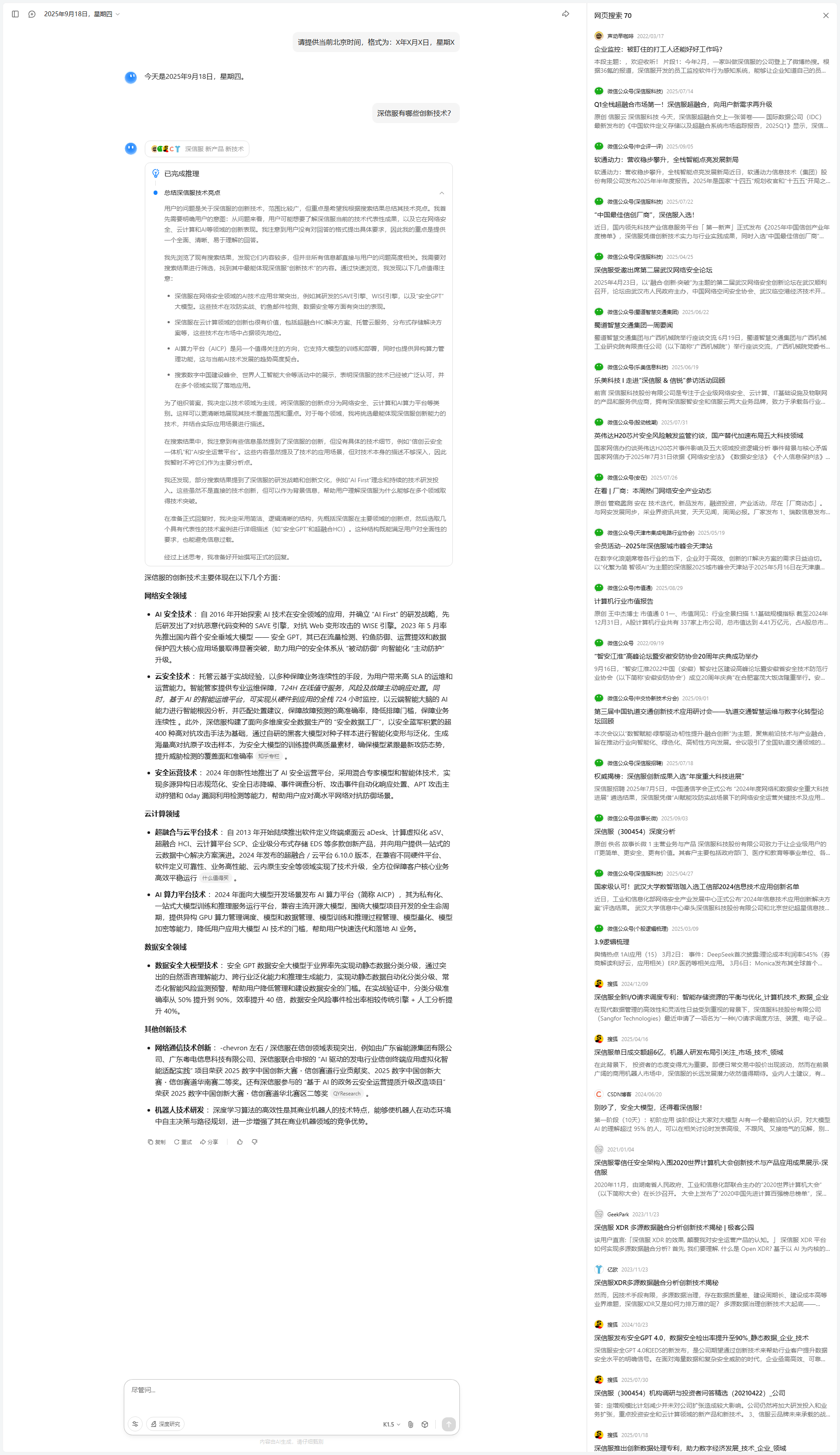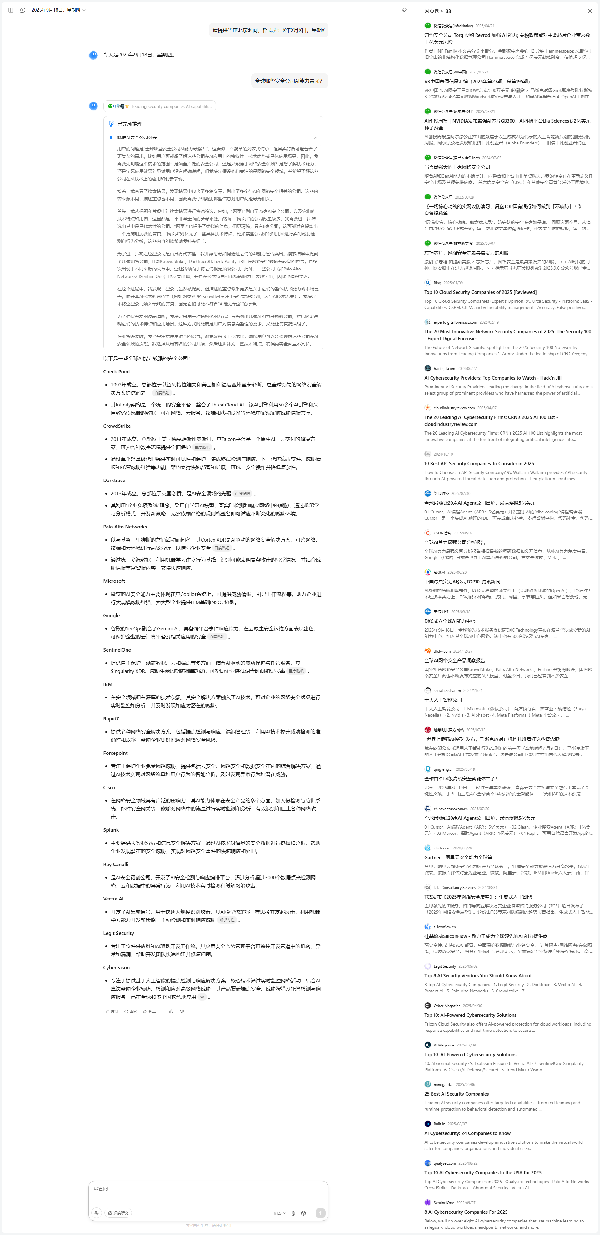 我开始尝试对搜索结果进行分析和筛选。第一步是从整体上检查搜索结果的时效性和内容质量。搜索结果大多集中在2025年,信息较为新鲜,且覆盖了国内主要安全大模型的对比分析,这让我对回答的时效性和准确性有了信心。其次,我发现内容的组织方式有所不同:一些结果专注于某一厂商的深度分析,而另一些则是多家厂商的横向比较。为了满足用户的综合比较需求,我决定优先提取那些能够提供横向对比视角的内容,同时补充某些厂商的深入分析。