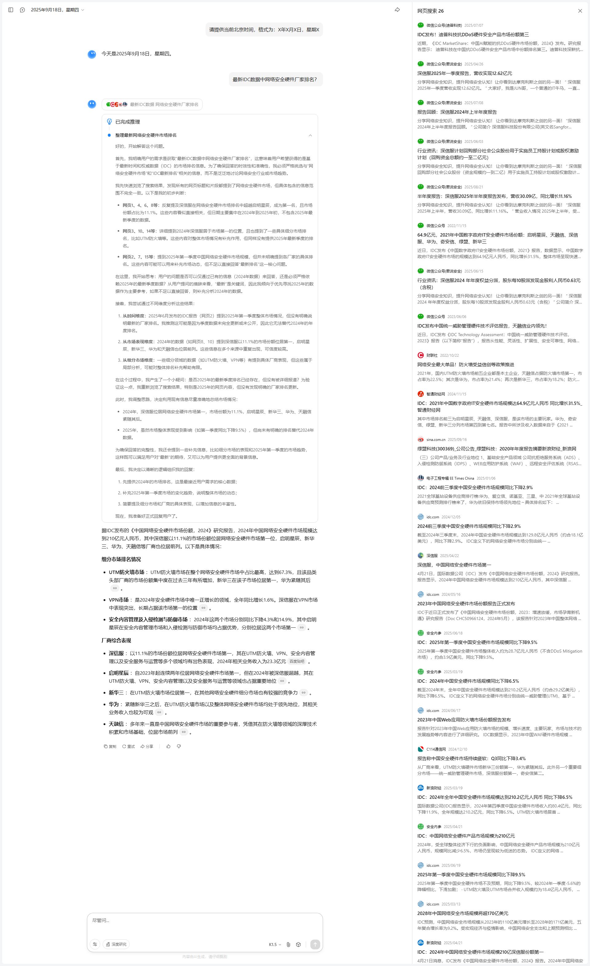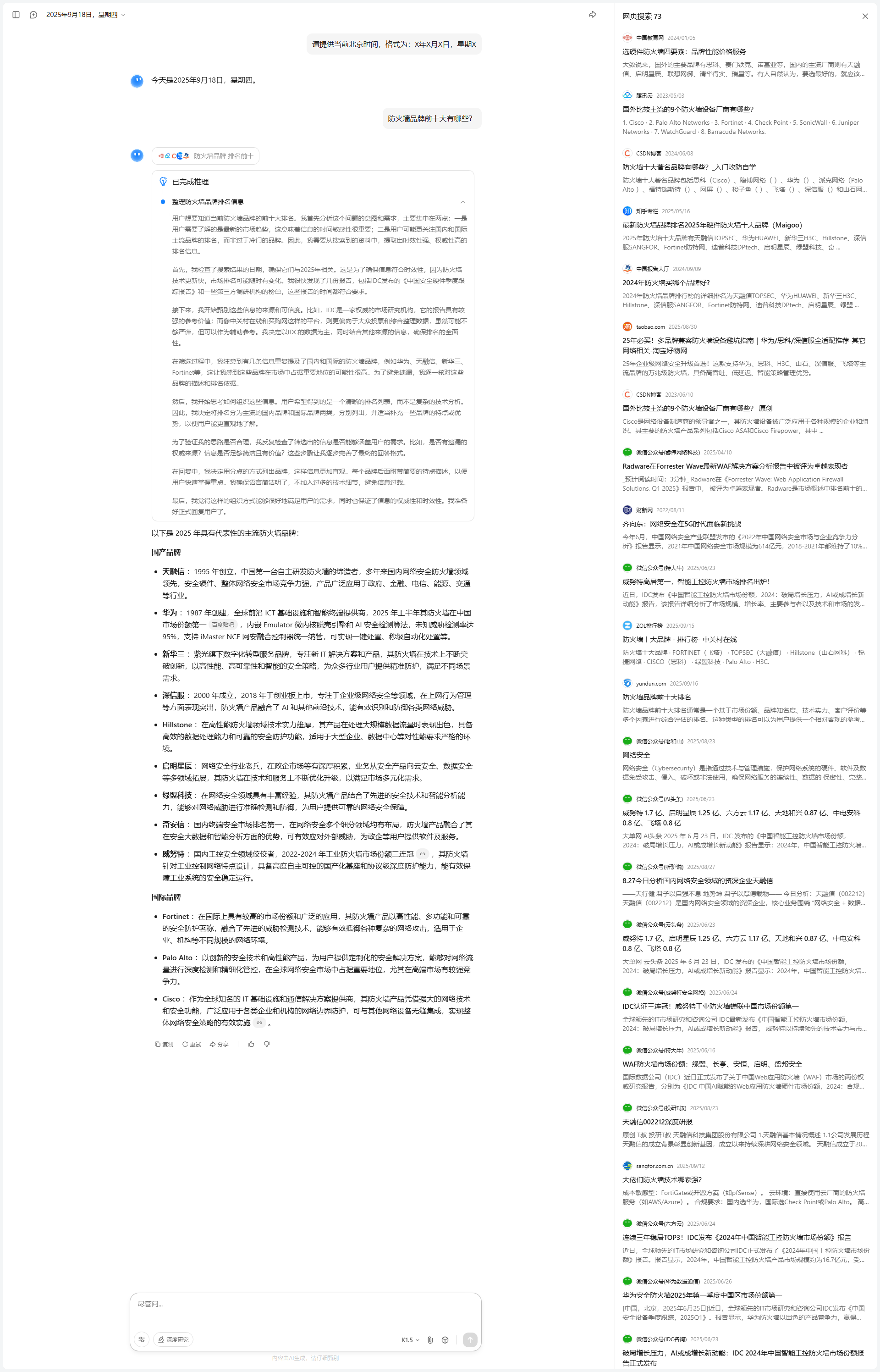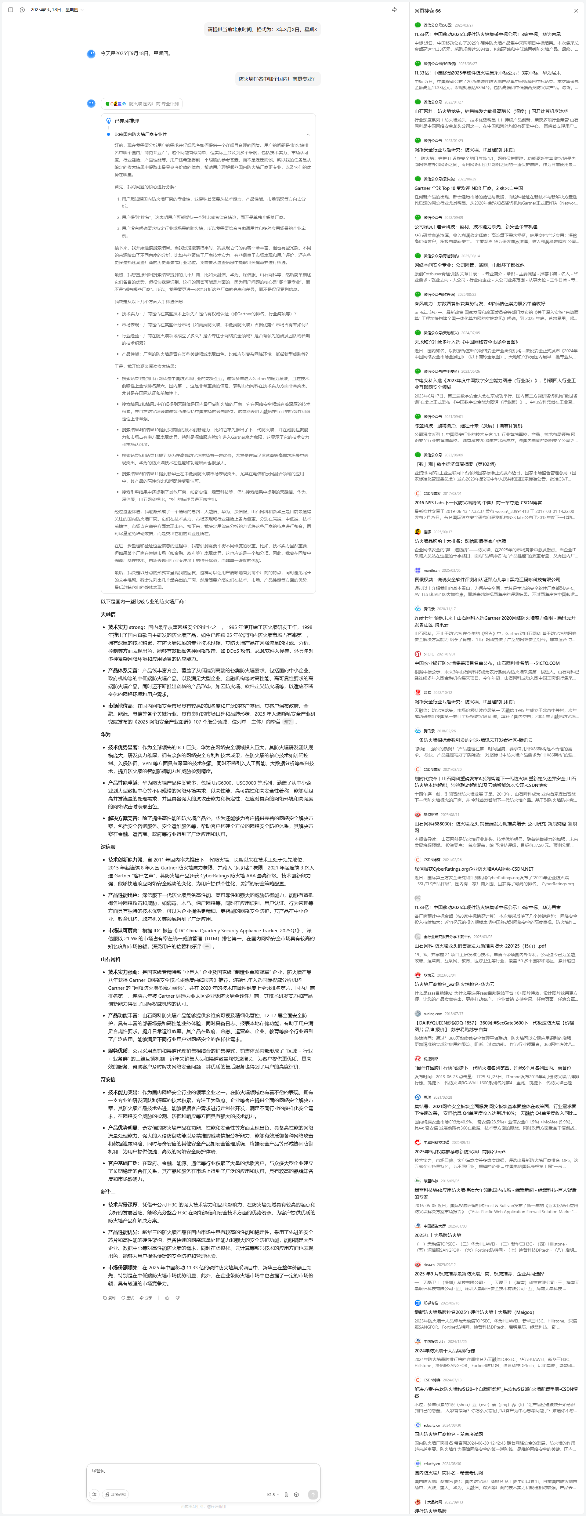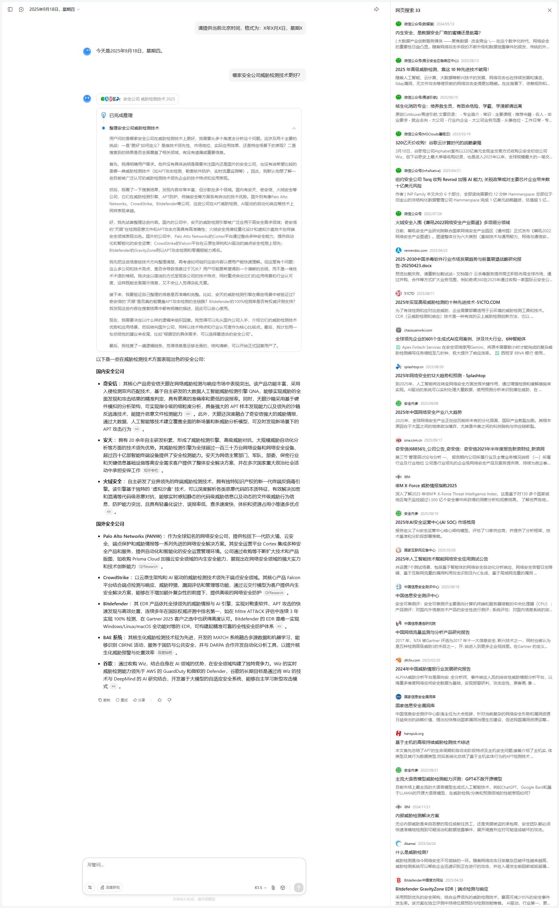 我开始尝试对搜索结果进行分析和筛选。第一步是从整体上检查搜索结果的时效性和内容质量。搜索结果大多集中在2025年,信息较为新鲜,且覆盖了国内主要安全大模型的对比分析,这让我对回答的时效性和准确性有了信心。其次,我发现内容的组织方式有所不同:一些结果专注于某一厂商的深度分析,而另一些则是多家厂商的横向比较。为了满足用户的综合比较需求,我决定优先提取那些能够提供横向对比视角的内容,同时补充某些厂商的深入分析。