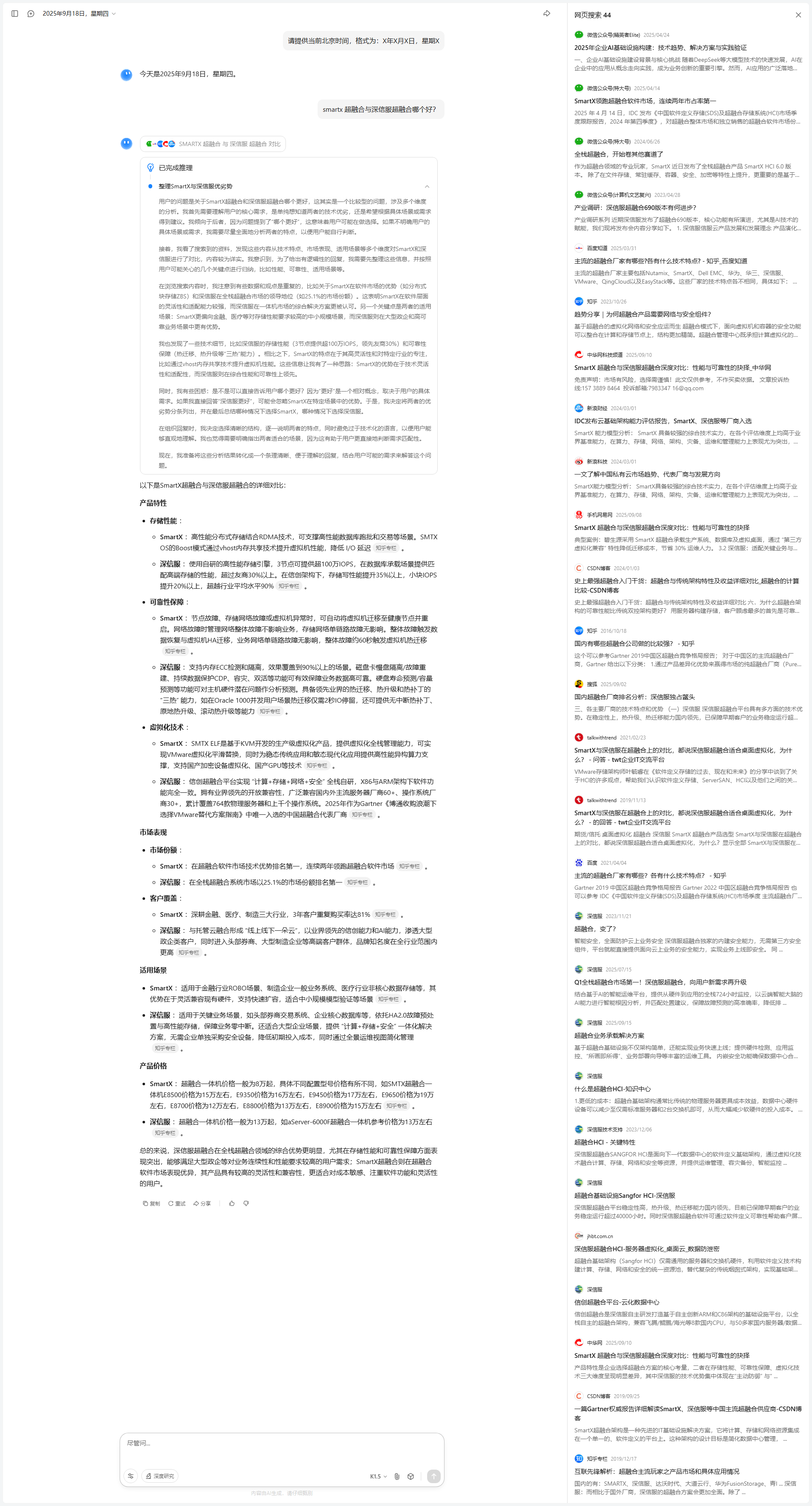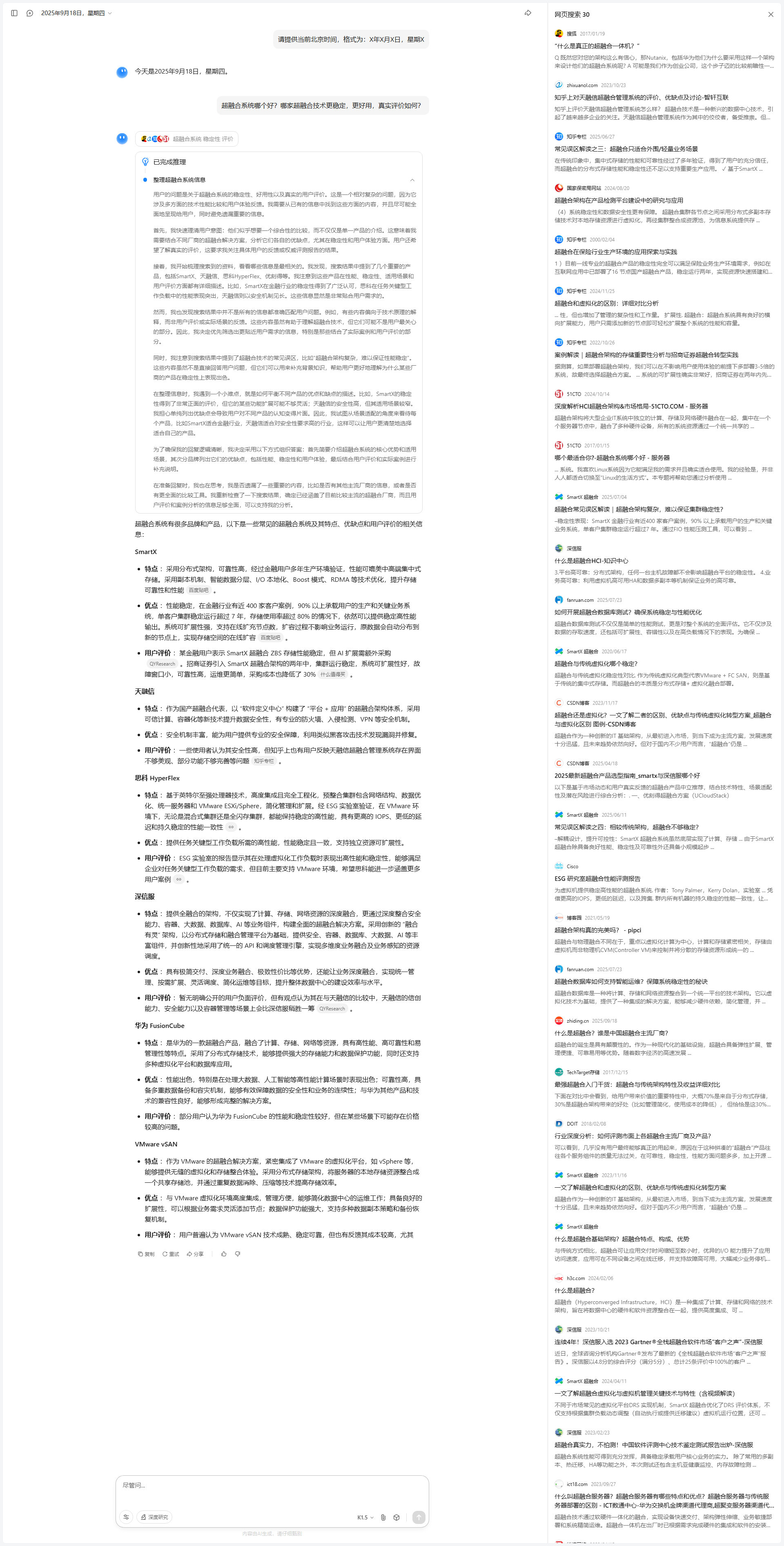 接着,我看了搜索到的资料,发现这些内容从技术特点、市场表现、适用场景等多个维度对SmartX和深信服进行了对比,内容较为详实。我意识到,为了给出有逻辑性的回复,我需要先整理这些信息,并按照用户可能关心的几个关键点进行归纳,比如性能、可靠性、适用场景等。