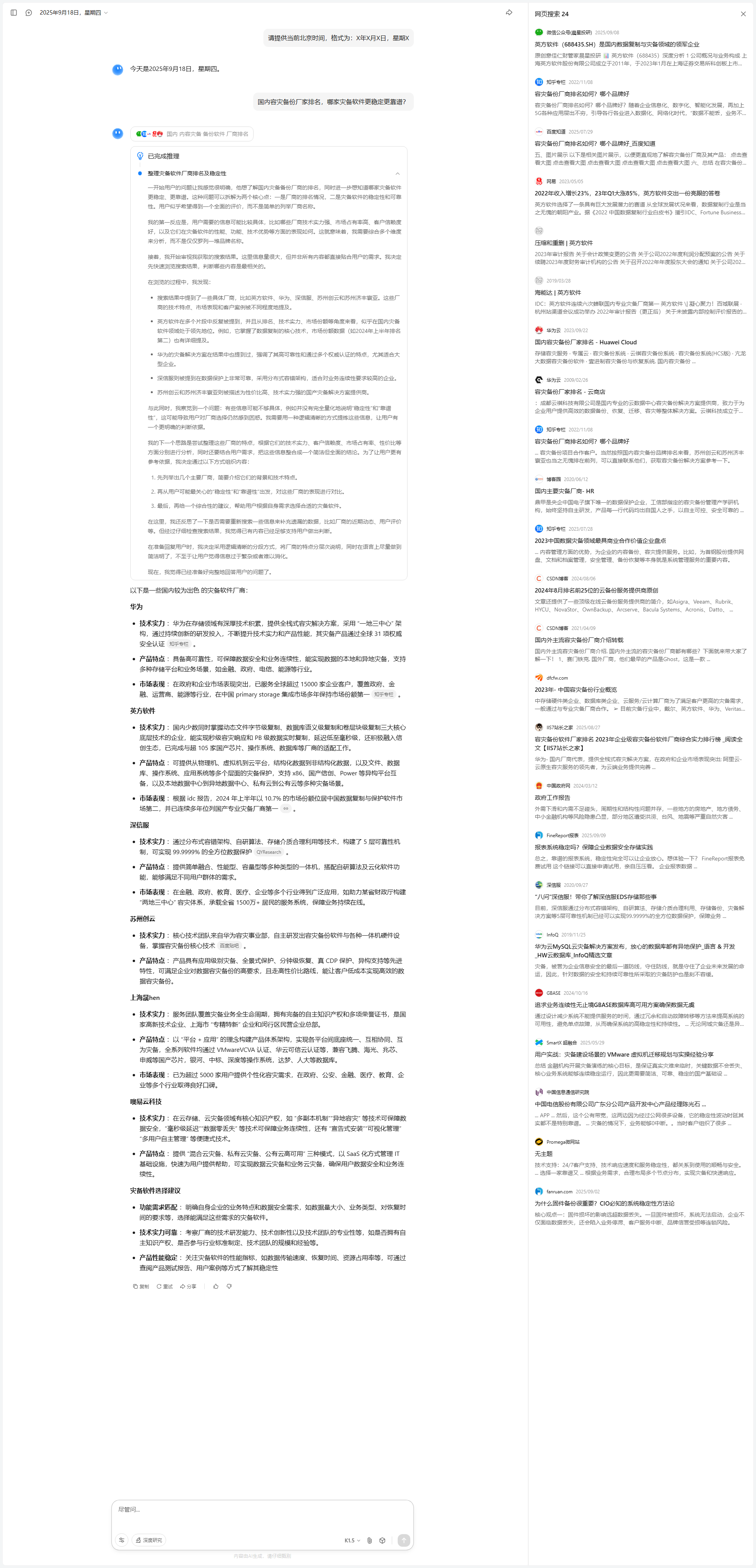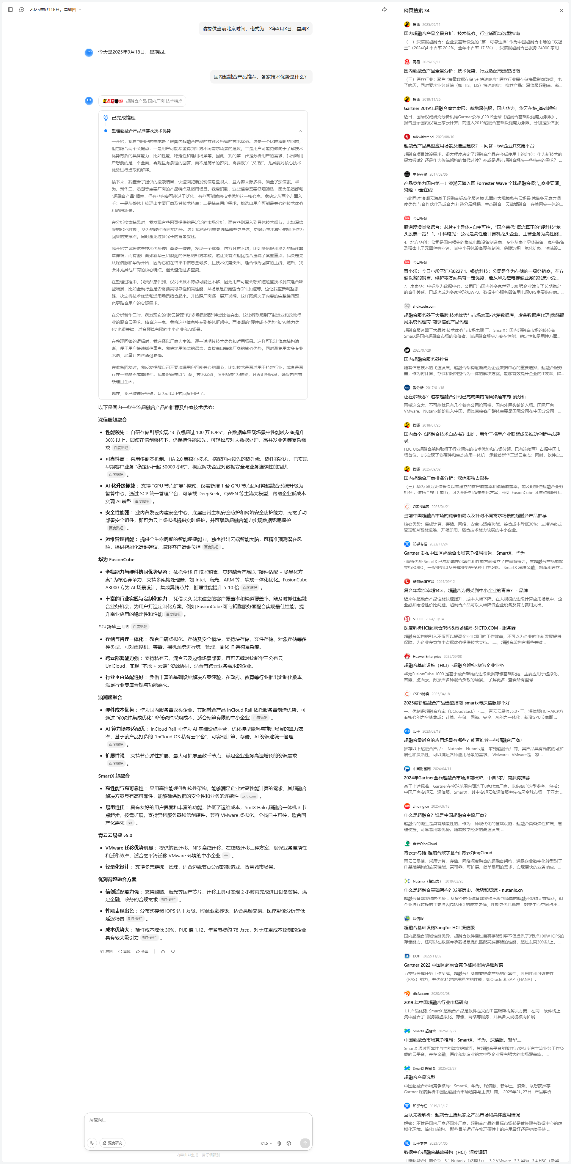 一开始,我看到用户的需求是了解国内超融合产品的推荐及各家的技术优势。这是一个比较清晰的问题,但它隐含两个关键点:一是用户可能希望得到针对不同需求场景的建议;二是用户可能更倾向于了解技术优势背后的具体能力,比如性能、稳定性和适用场景等。因此,我的第一步是分析用户的需求,我判断用户想要的是一个全面、客观且有条理的回答,而不是简单的罗列。需要既“广”又“深”,尤其要对核心技术优势进行提取和解释。