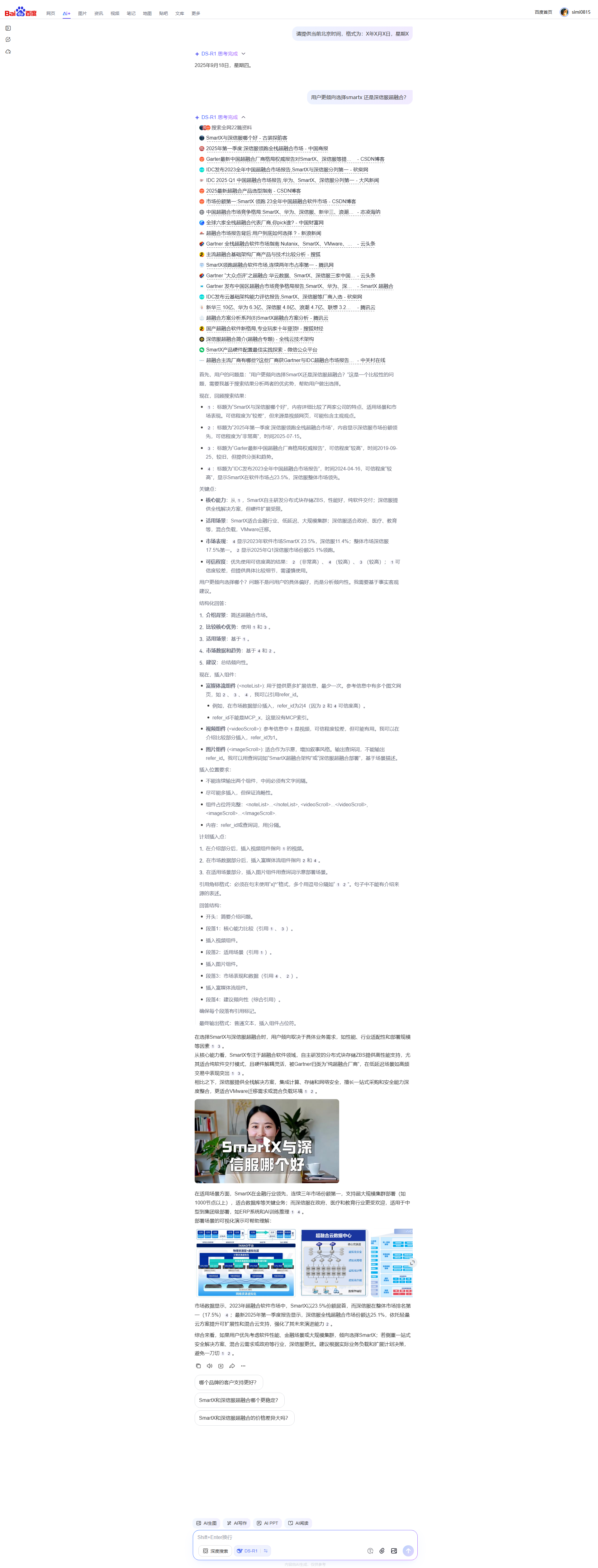 - ^[4]^:标题为“IDC发布2023全年中国超融合市场报告”,时间2024-04-16,可信程度“较高”,显示SmartX在软件市场占23.5%,深信服整体市场领先。