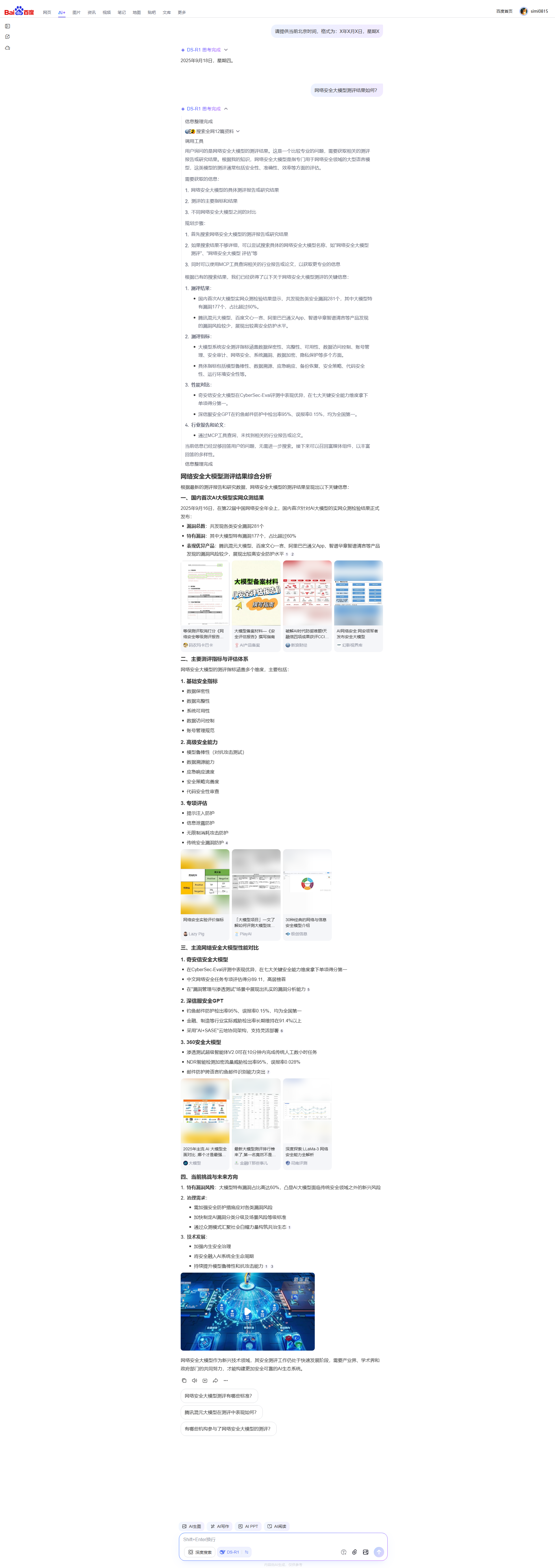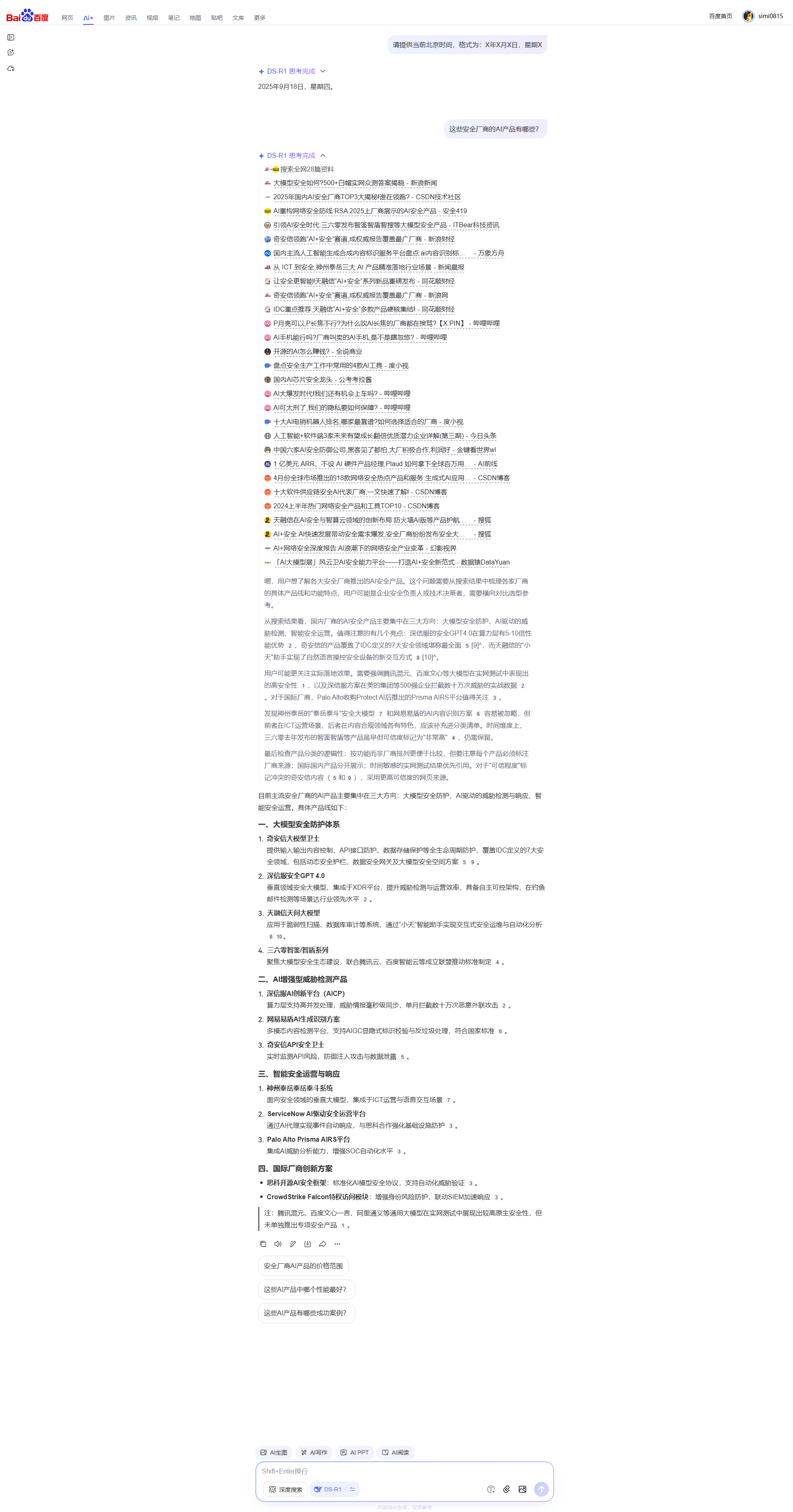 发现神州泰岳的"泰岳泰斗"安全大模型 ^[7]^ 和网易易盾的AI内容识别方案 ^[6]^ 容易被忽略,但前者在ICT运营场景、后者在内容合规领域各有特色,应该补充进分类清单。时间维度上,三六零去年发布的智鉴智盾等产品虽早但可信度标记为"非常高" ^[4]^,仍需保留。