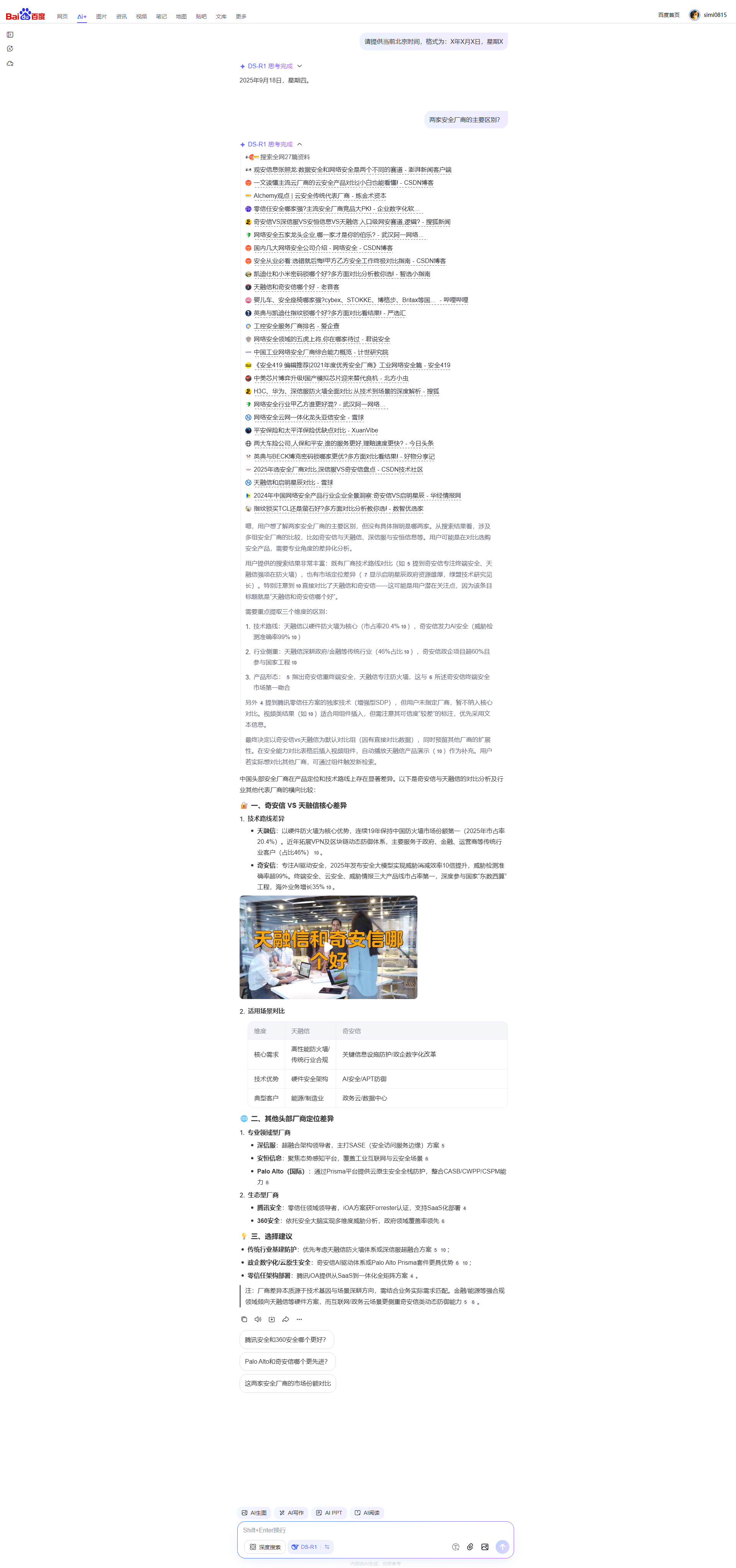 从搜索结果看,国内厂商的AI安全产品主要集中在三大方向:大模型安全防护、AI驱动的威胁检测、智能安全运营。值得注意的有几个亮点:深信服的安全GPT4.0在算力层有5-10倍性能优势 ^[2]^,奇安信的产品覆盖了IDC定义的7大安全领域堪称最全面 ^[5]^[9]^,而天融信的"小天"助手实现了自然语言操控安全设备的新交互方式 ^[8]^[10]^。