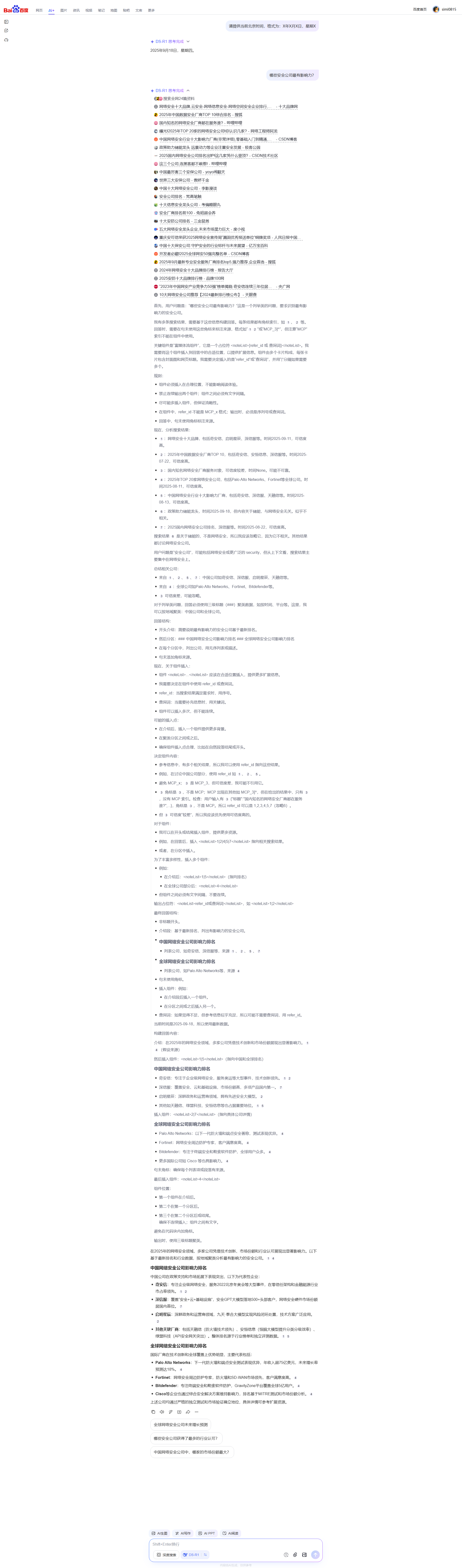 用户可能更关注实际落地效果。需要强调腾讯混元、百度文心等大模型在实网测试中表现出的高安全性 ^[1]^,以及深信服方案在美的集团等500强企业拦截数十万次威胁的实战数据 ^[2]^。对于国际厂商,Palo Alto收购Protect AI后推出的Prisma AIRS平台值得关注 ^[3]^。