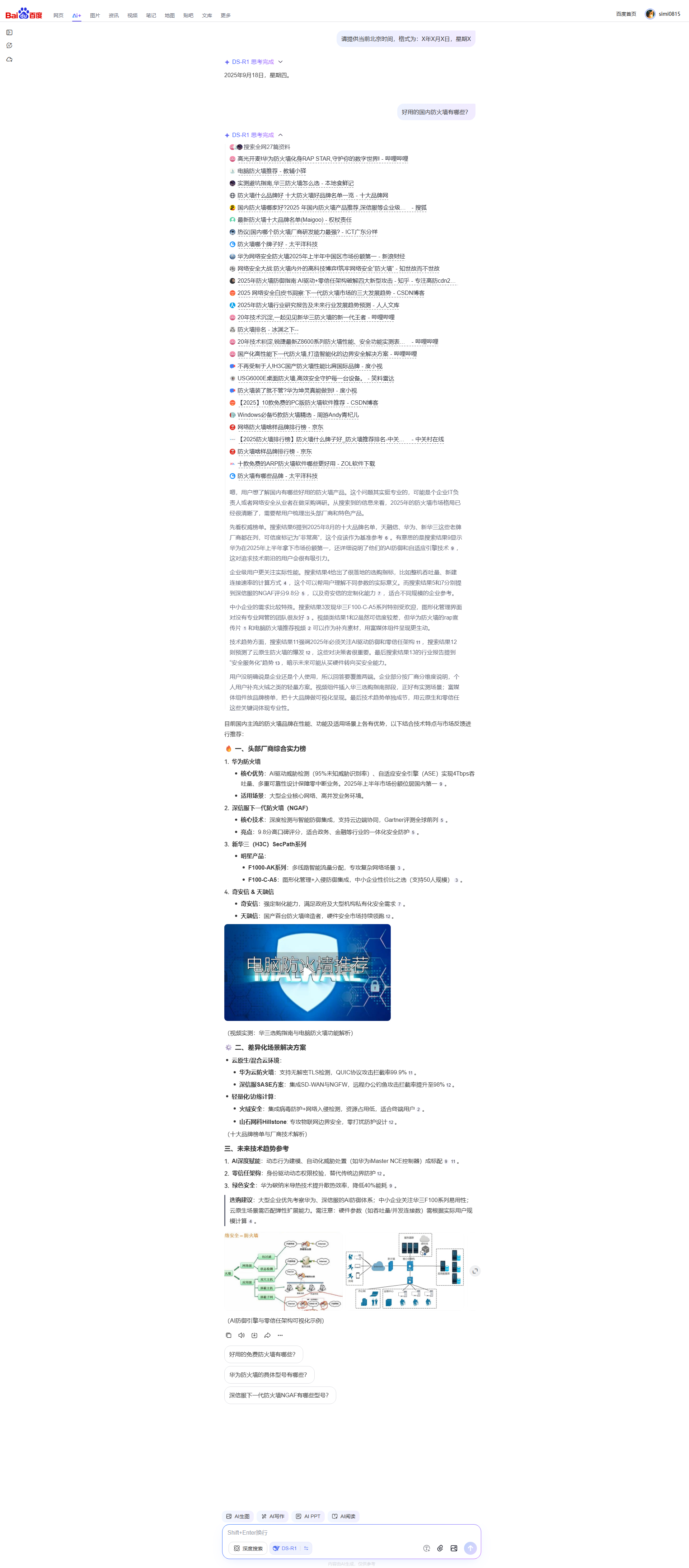 • **深信服防火墙**:以“专业安全+创新驱动”为核心,战略目标是“用一台设备解决大部分安全问题”,侧重AI与云化能力(如安全GPT、SASE),注重效果落地与技术突破^^1^^8^^。