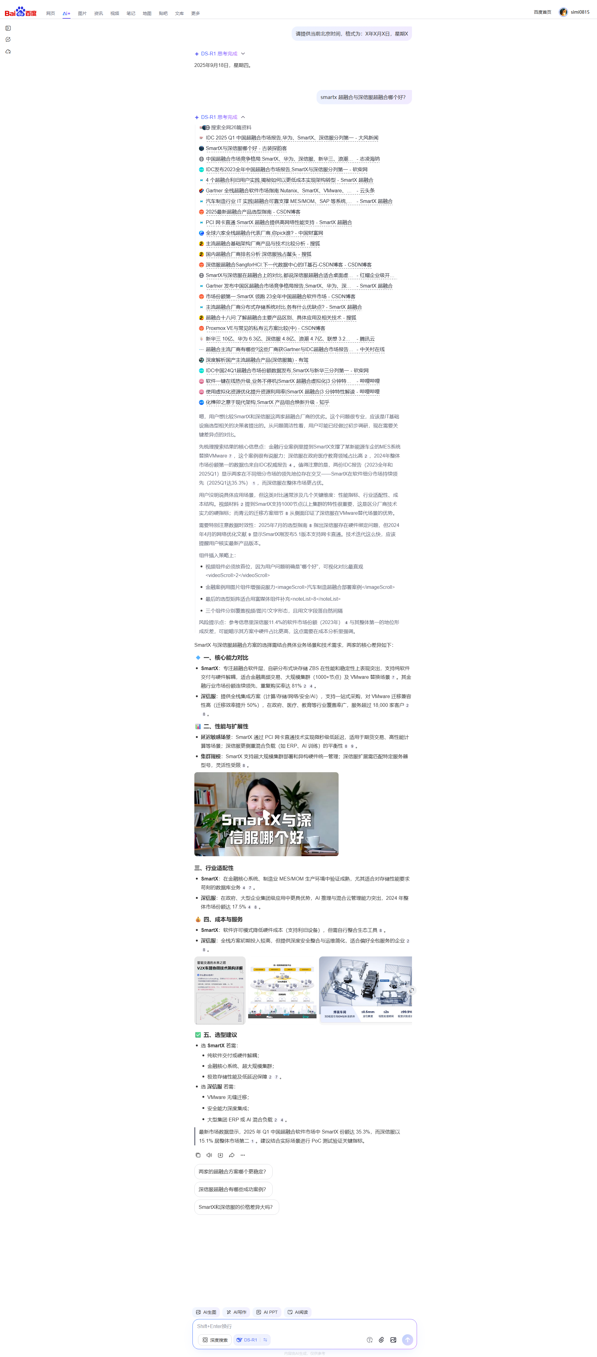 先梳理搜索结果的核心信息点:金融行业案例里提到SmartX支撑了某新能源车企的MES系统替换VMware^[7]^,这个案例很有说服力;深信服在政府医疗教育领域占比高^[2]^,2024年整体市场份额第一的数据也来自IDC权威报告^[4]^。值得注意的是,两份IDC报告(2023全年和2025Q1)显示两家在不同细分市场的领先地位存在交叉——SmartX在软件细分市场持续领先(2025Q1达35.3%)^[1]^,而深信服在整体市场更占优。