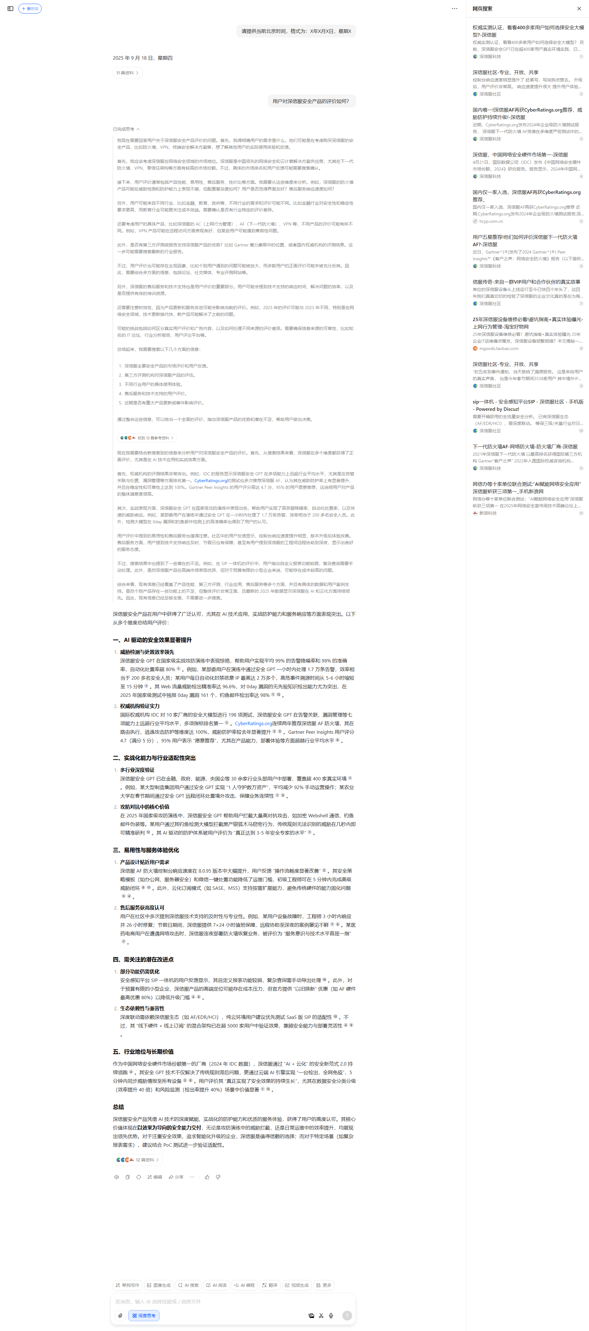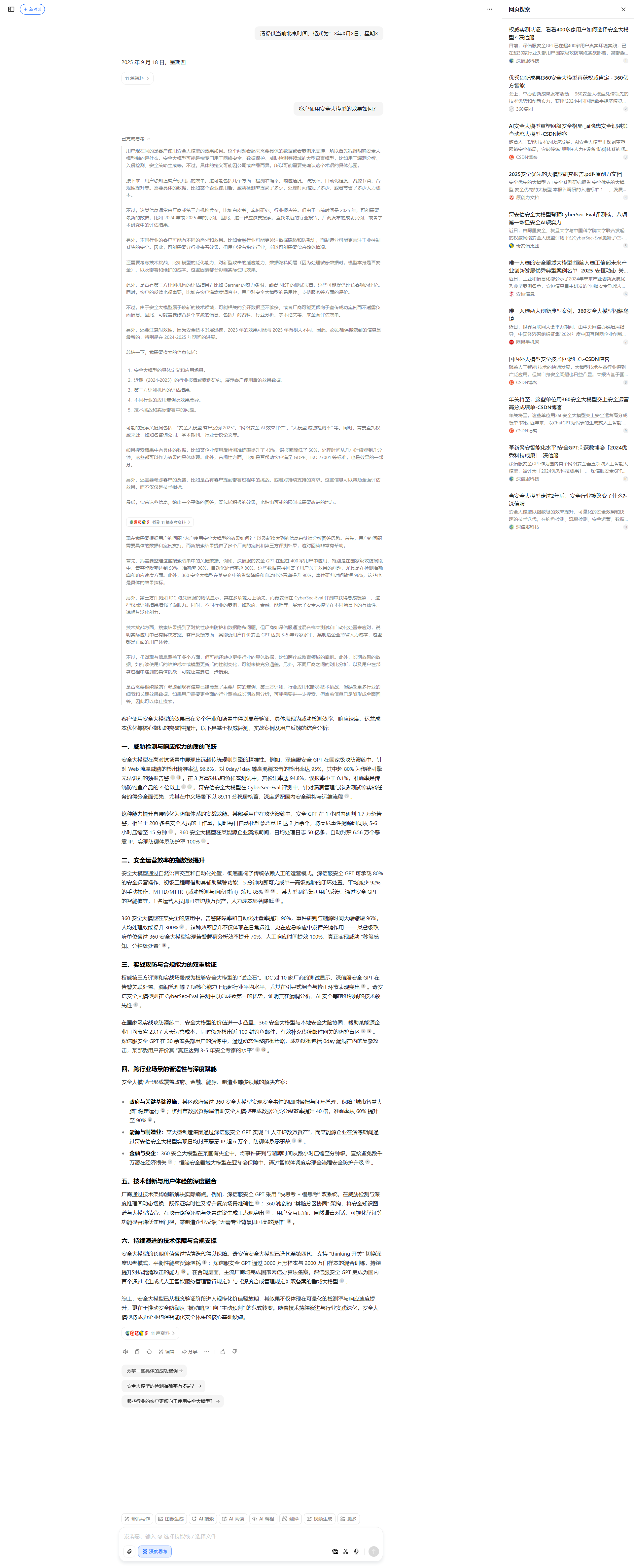 可能的搜索关键词包括:“安全大模型 客户案例 2025”、“网络安全AI效果评估”、“大模型 威胁检测率”等。同时,需要查找权威来源,如知名咨询公司、学术期刊、行业会议论文等。