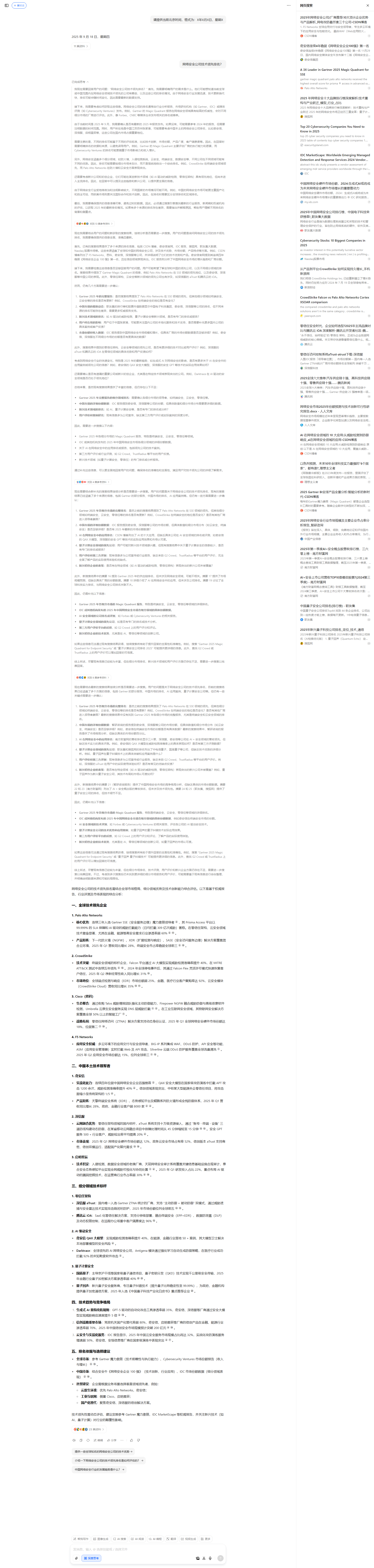 1. **Gartner 2025年的完整报告**:虽然搜索结果提到了Palo Alto Networks在SSE领域的领先,但其他细分领域如终端安全、云安全等的排名是否有更新?例如,CrowdStrike在终端安全的地位是否有变化?