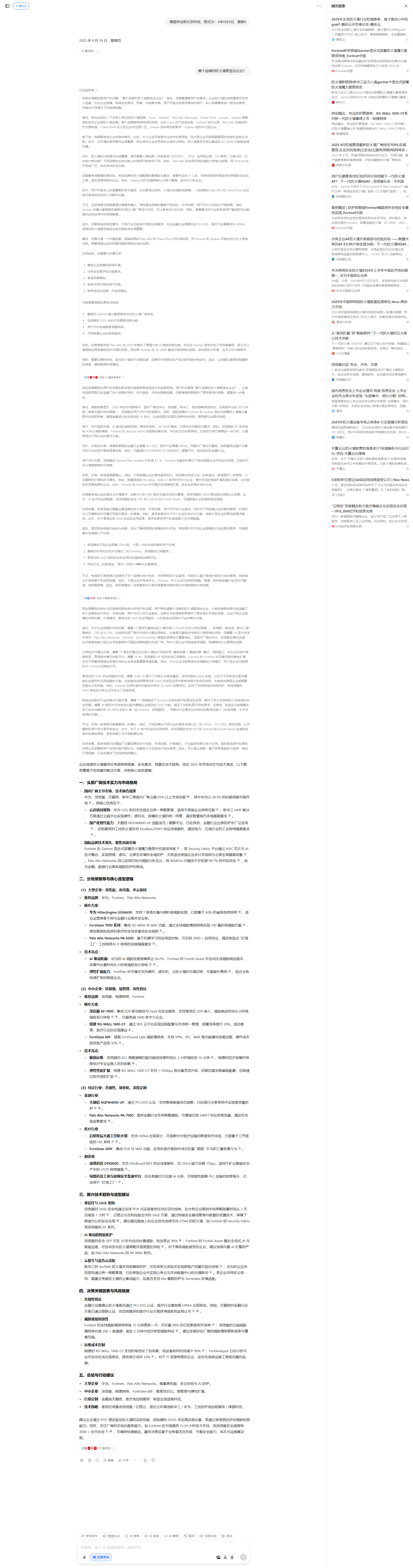 - **产品矩阵**:下一代防火墙(NGFW)、XDR(扩展检测与响应)、SASE(安全访问服务边缘)解决方案覆盖混合云环境,2025年Q1营收同比增长28%,终端安全市占率稳居全球前三^[5]^^[10]^。
