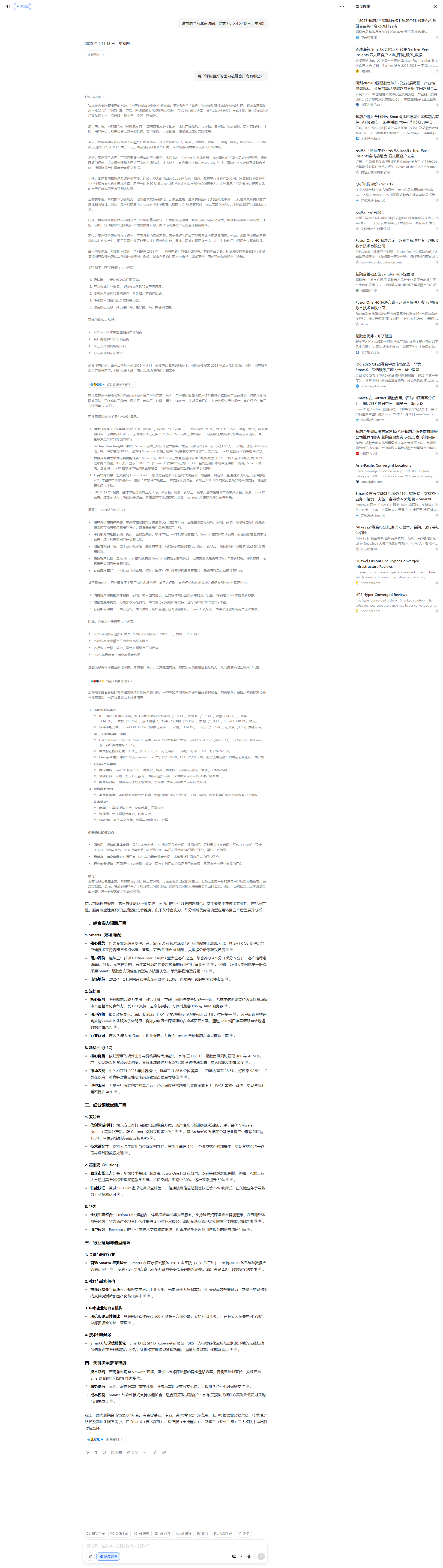 2. **AI功能应用**:需要确认SmartX和深信服的AI功能是否已深度集成到超融合产品中,以及实际用户案例。