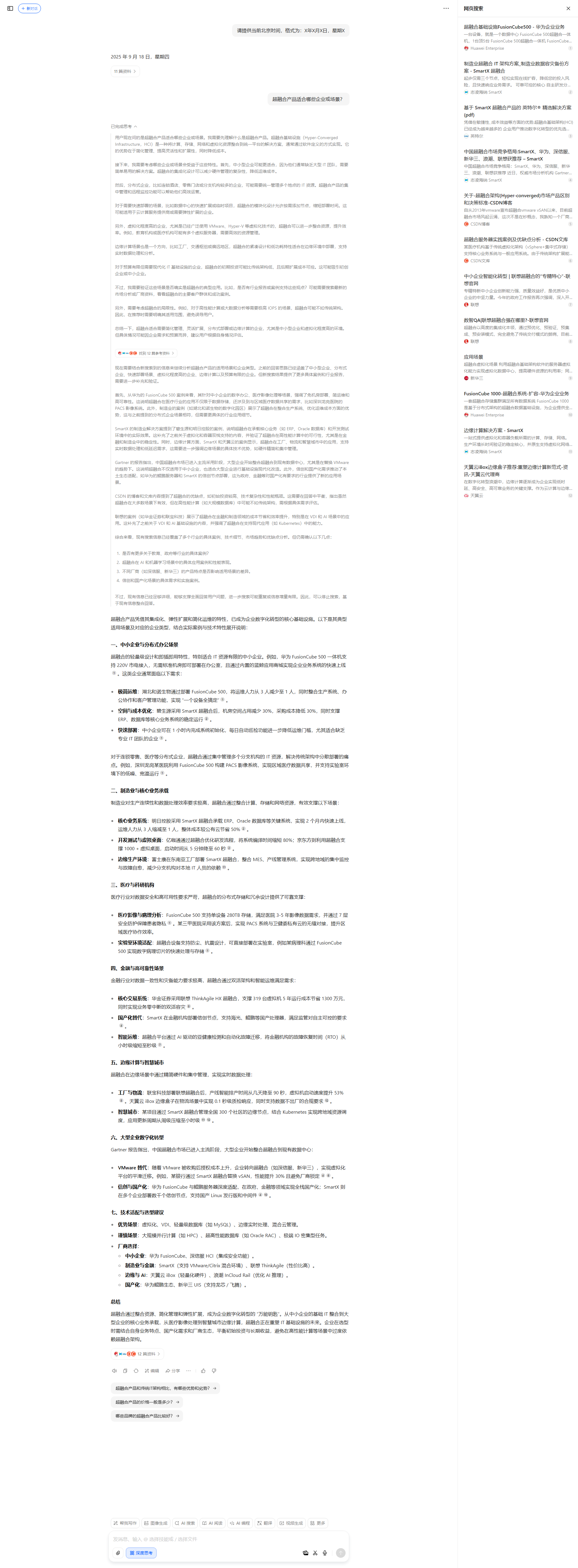 首先,新搜索结果中的摘要15提供了深信服某型号产品的价格,但具体到超融合解决方案的定价策略仍不明确。摘要7和8提到SmartX的价格合理,但缺乏2025年的具体报价。因此,价格对比仍然不够充分,需要进一步搜索两者的定价策略,尤其是针对不同规模企业的报价和性价比分析。