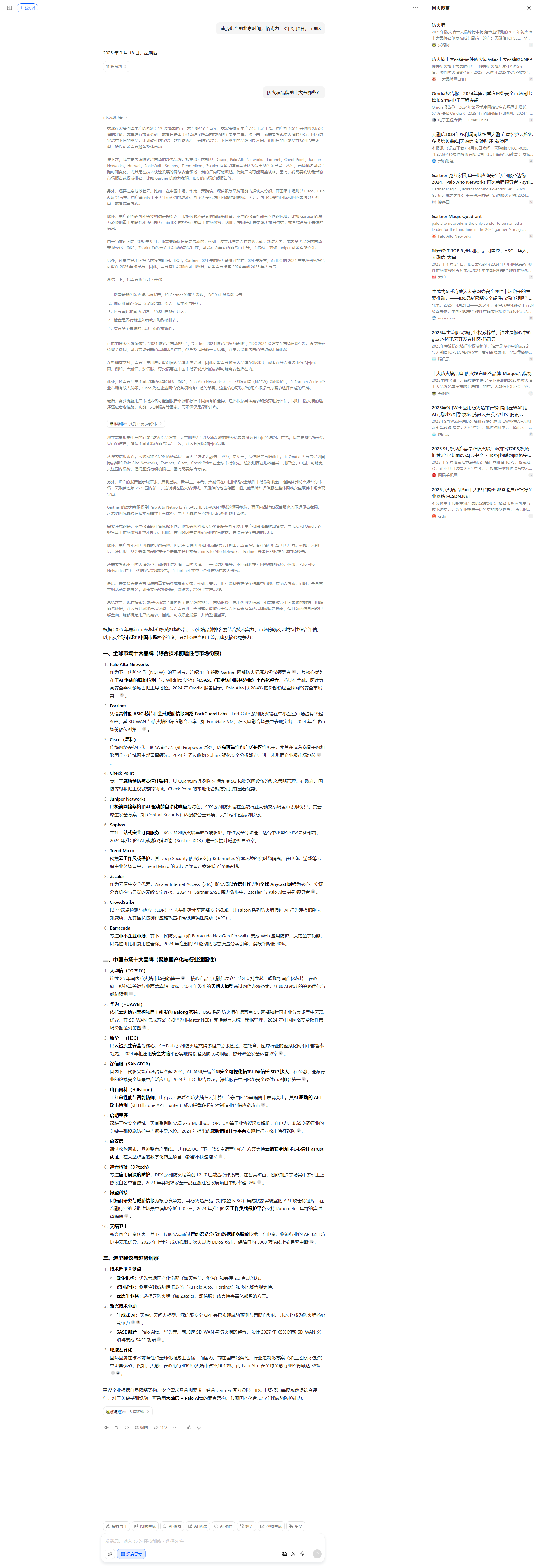 2. **第三方评测的全面性**:现有评测主要集中在奇安信、360和深信服,需确认是否有针对安恒、启明星辰等厂商的评测数据。