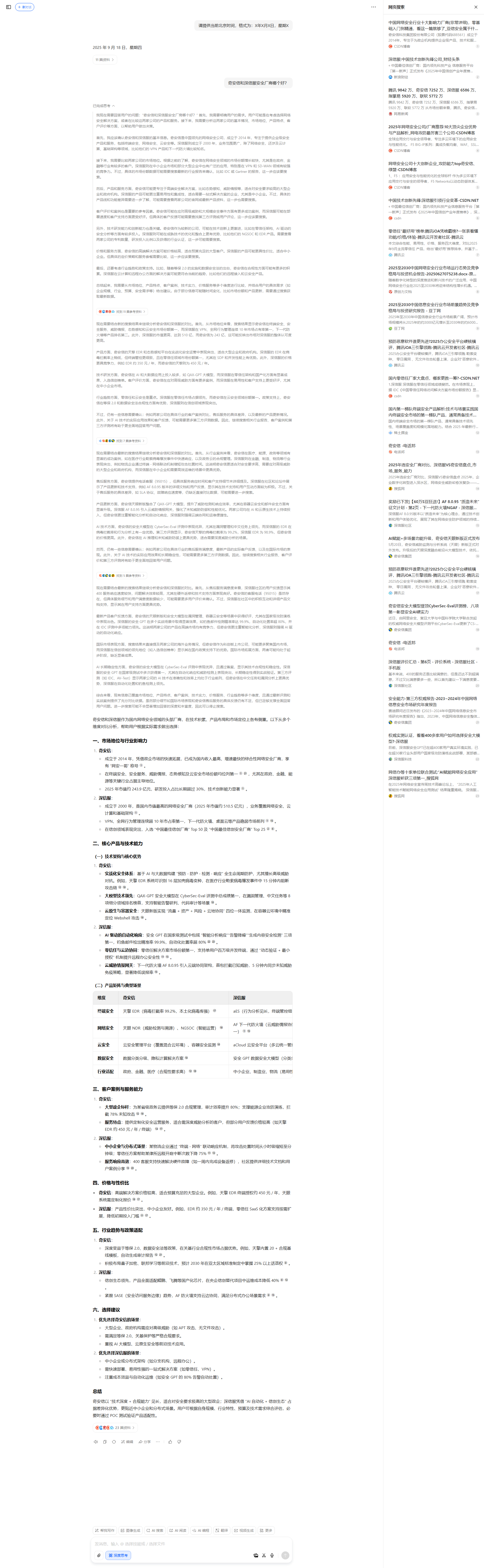 然而,仍有一些信息需要确认。例如,各厂商的模型在不同行业的具体应用案例是否全面,是否有更多第三方评测数据支持其性能,以及各模型的成本和部署方式是否适合不同规模的企业。此外,是否有其他厂商如安恒信息、启明星辰等的安全大模型未被提及,可能需要进一步搜索以全面比较。
